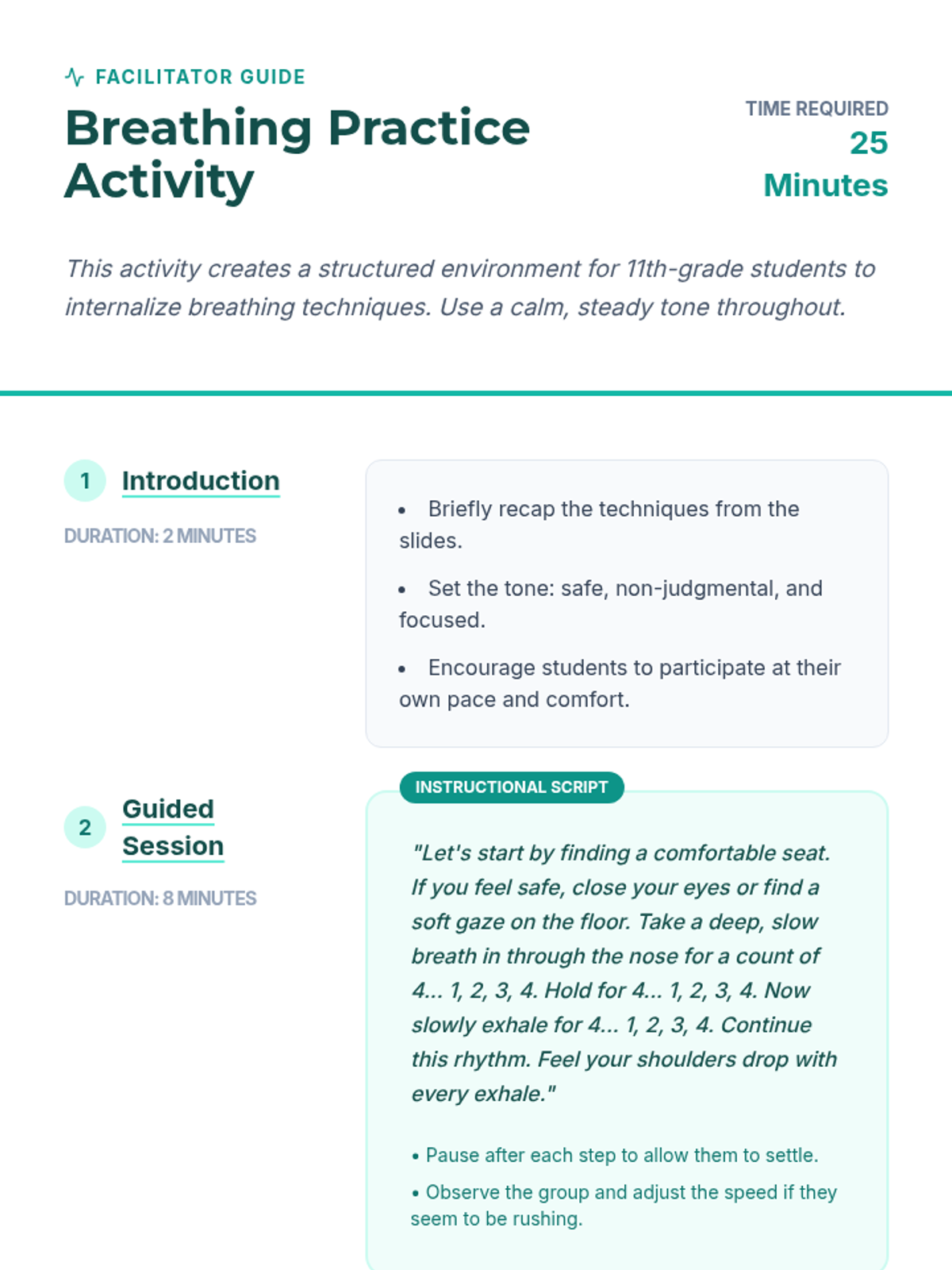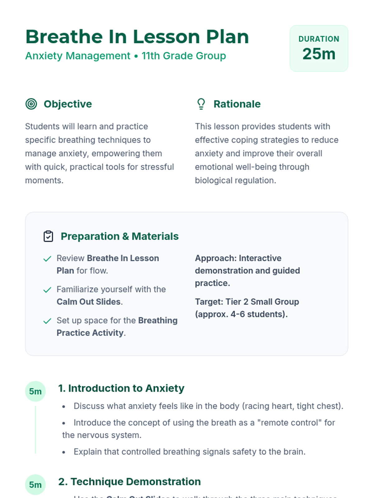 A 25-minute Tier 2 group session for 11th graders focused on learning and practicing breathing techniques to manage anxiety and stressful situations.
