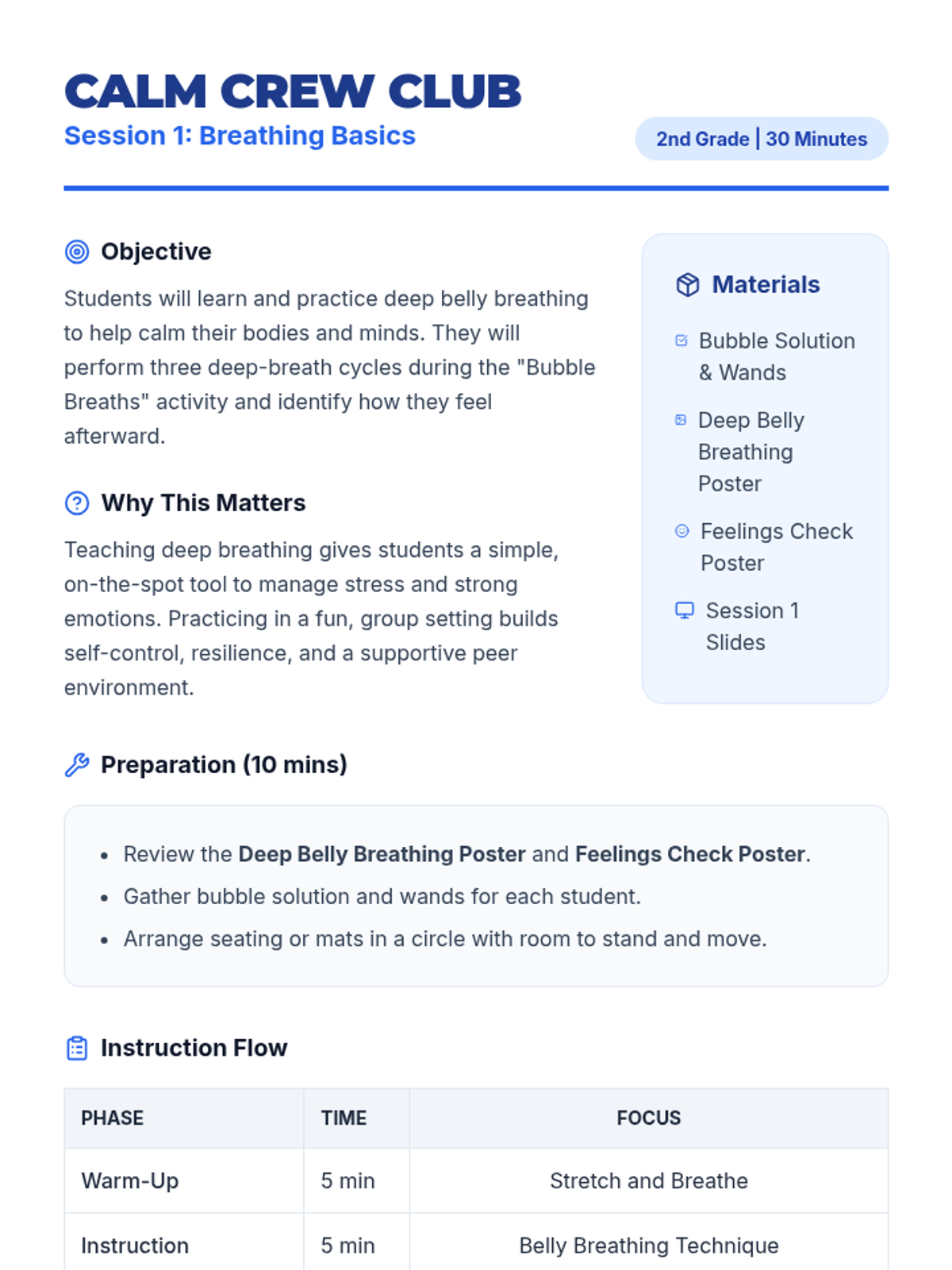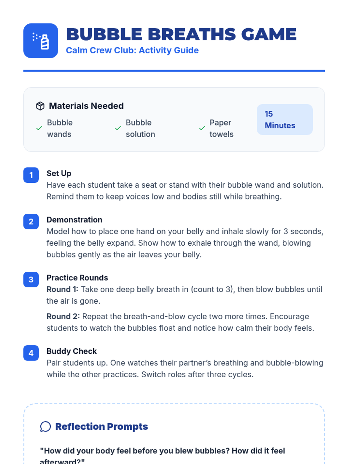 Students learn the fundamentals of deep belly breathing through a playful bubble-blowing activity to help manage strong emotions and calm their bodies.