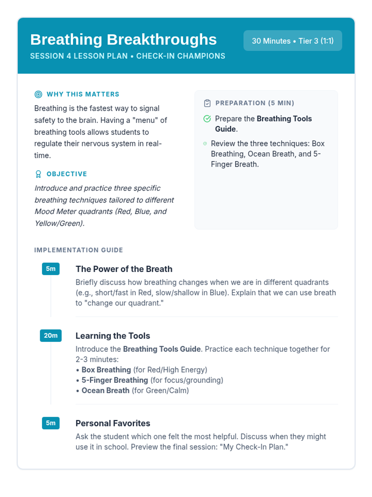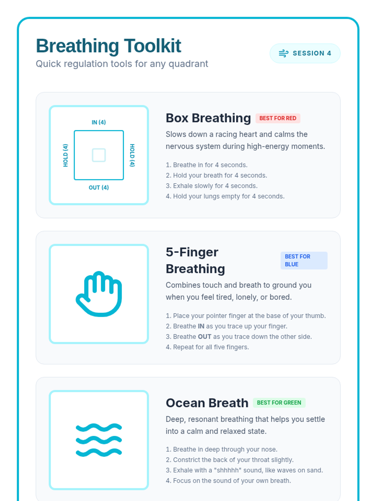 Introduces varied breathing techniques as immediate regulation tools for managing high-energy or unpleasant emotions.