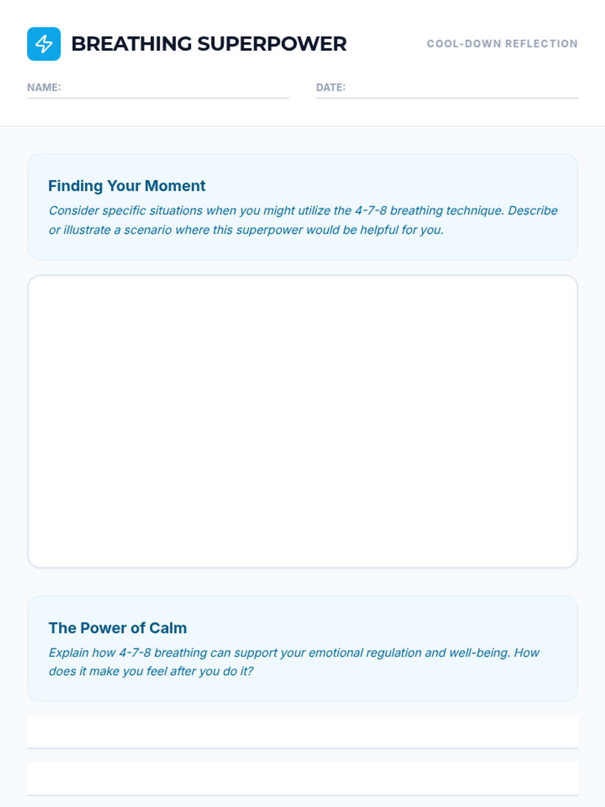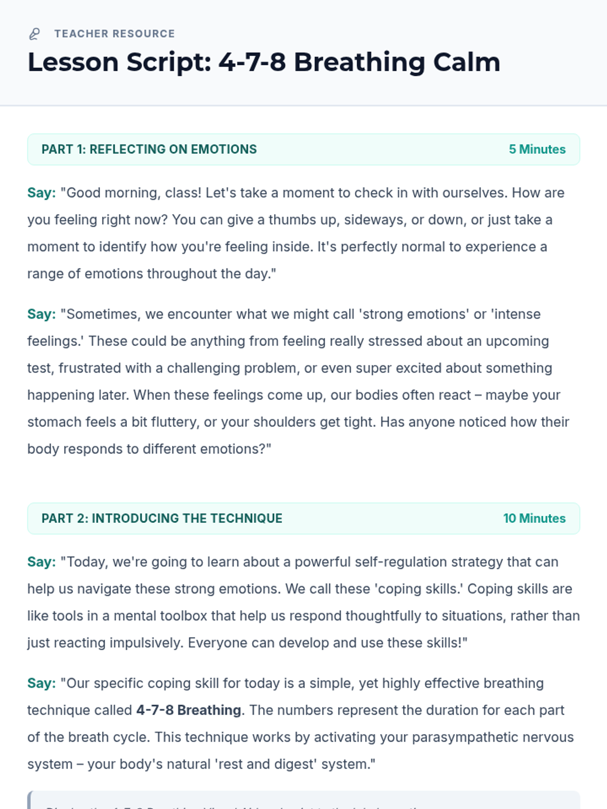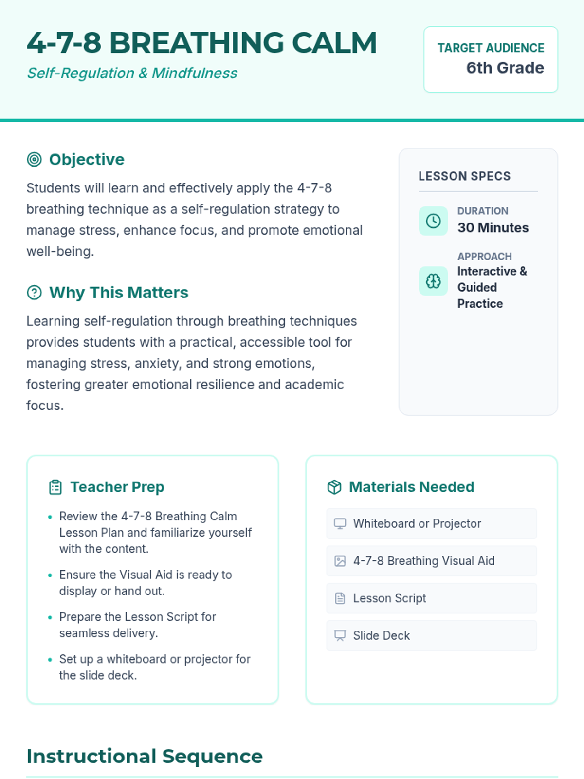 A 30-minute mindfulness lesson for 6th graders to learn and practice the 4-7-8 breathing technique for emotional regulation and focus.