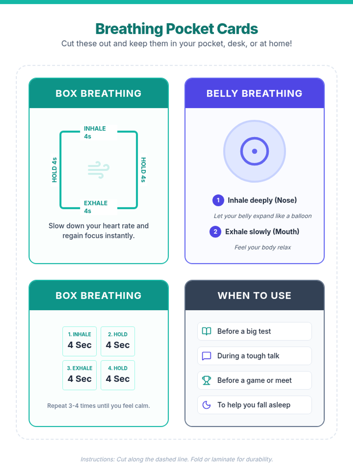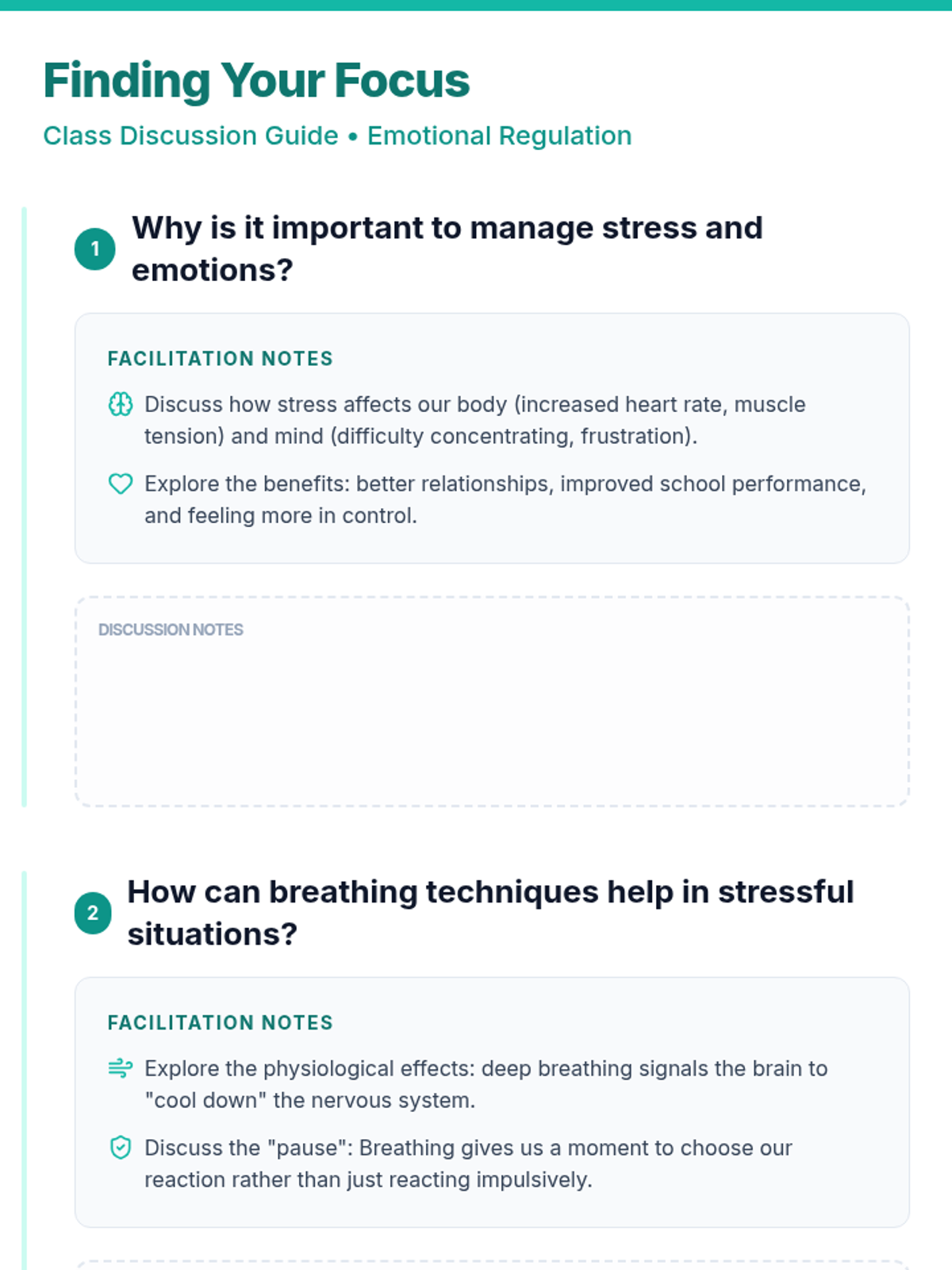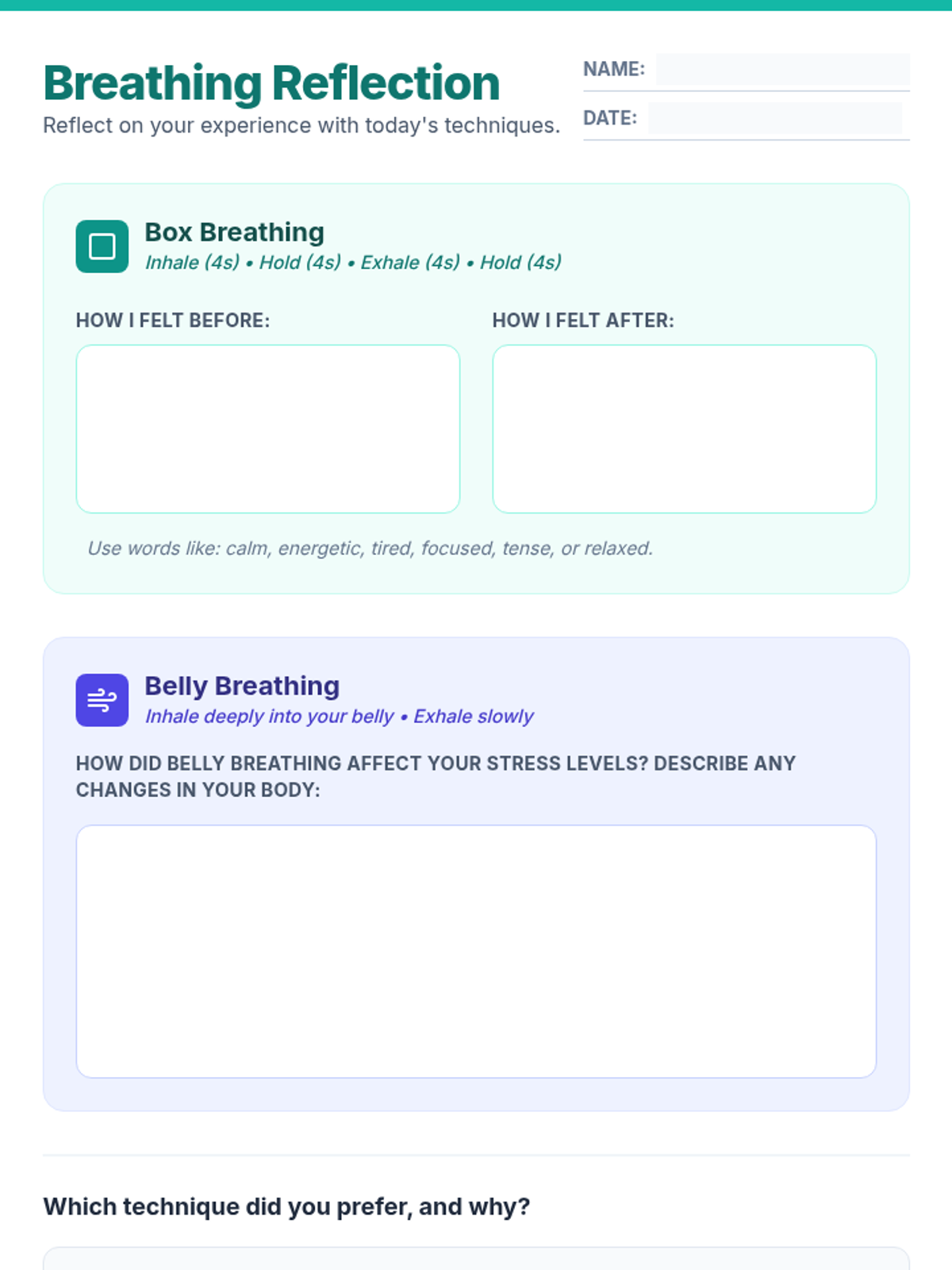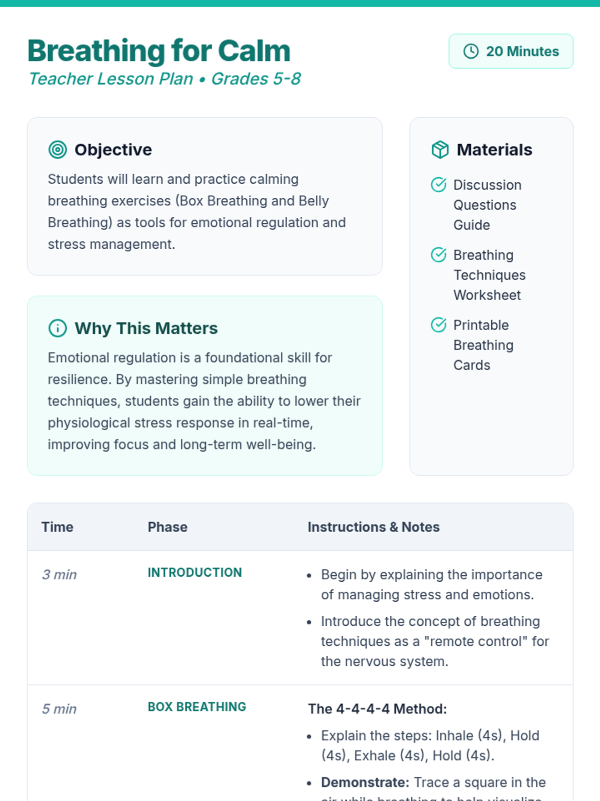 This lesson introduces students to calming breathing techniques like box breathing and belly breathing to help manage stress and emotions. Students will practice these techniques and reflect on their impact on emotional well-to-being.