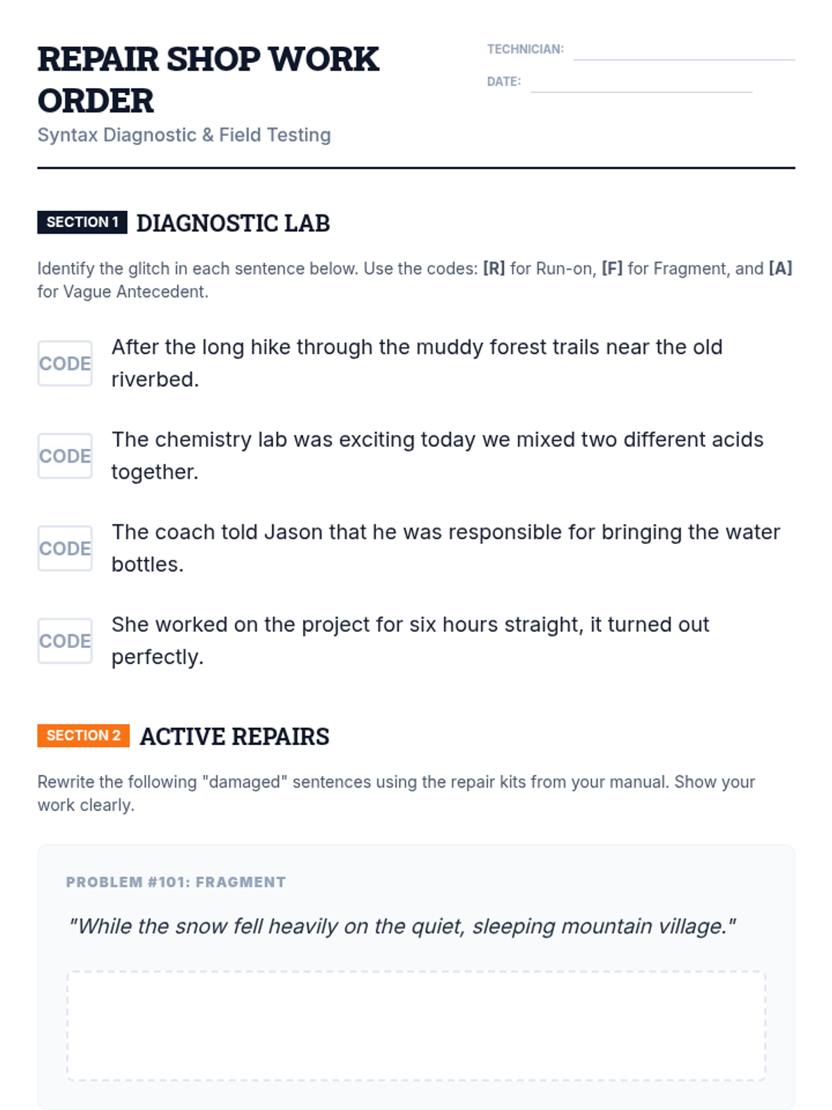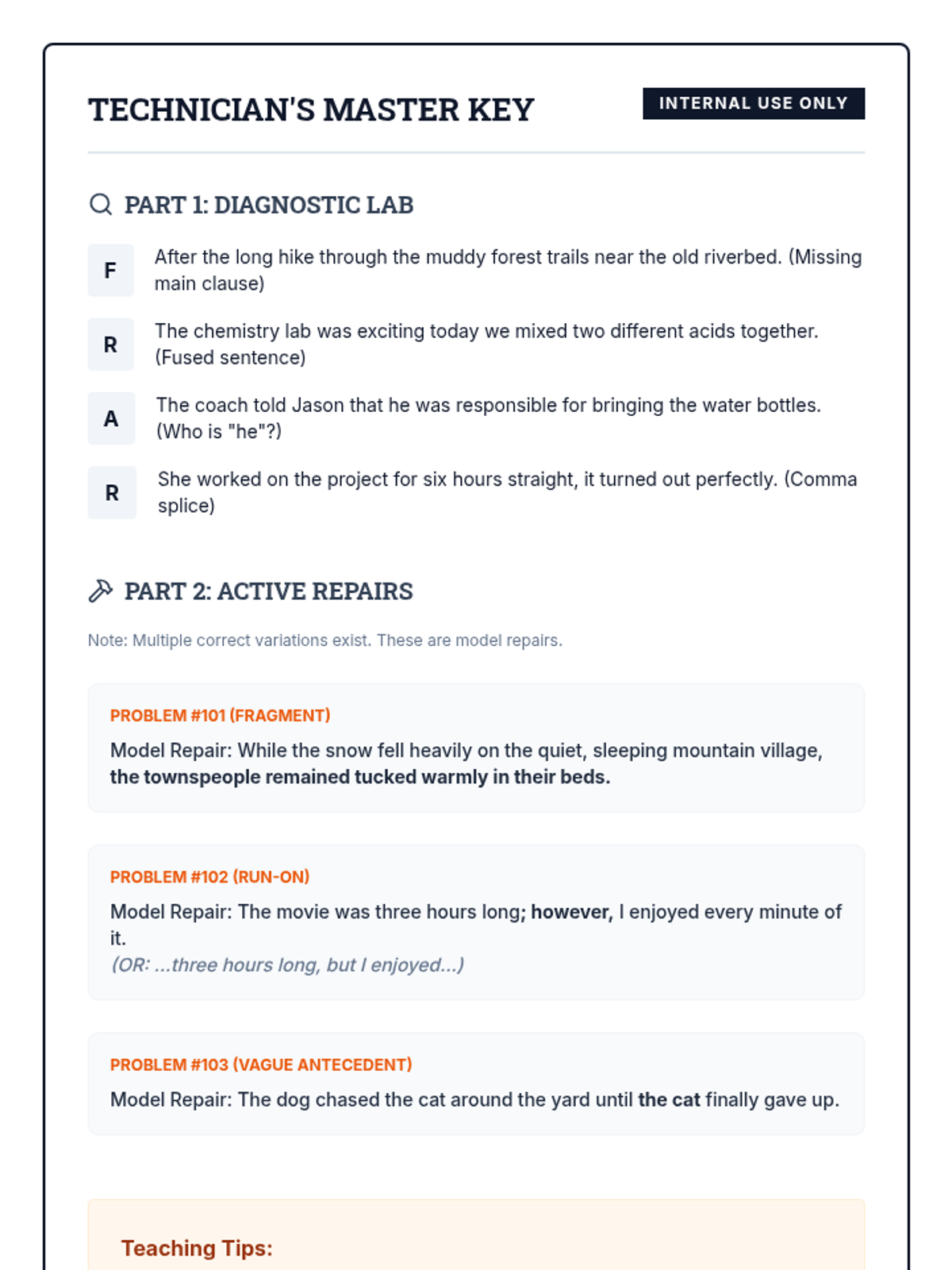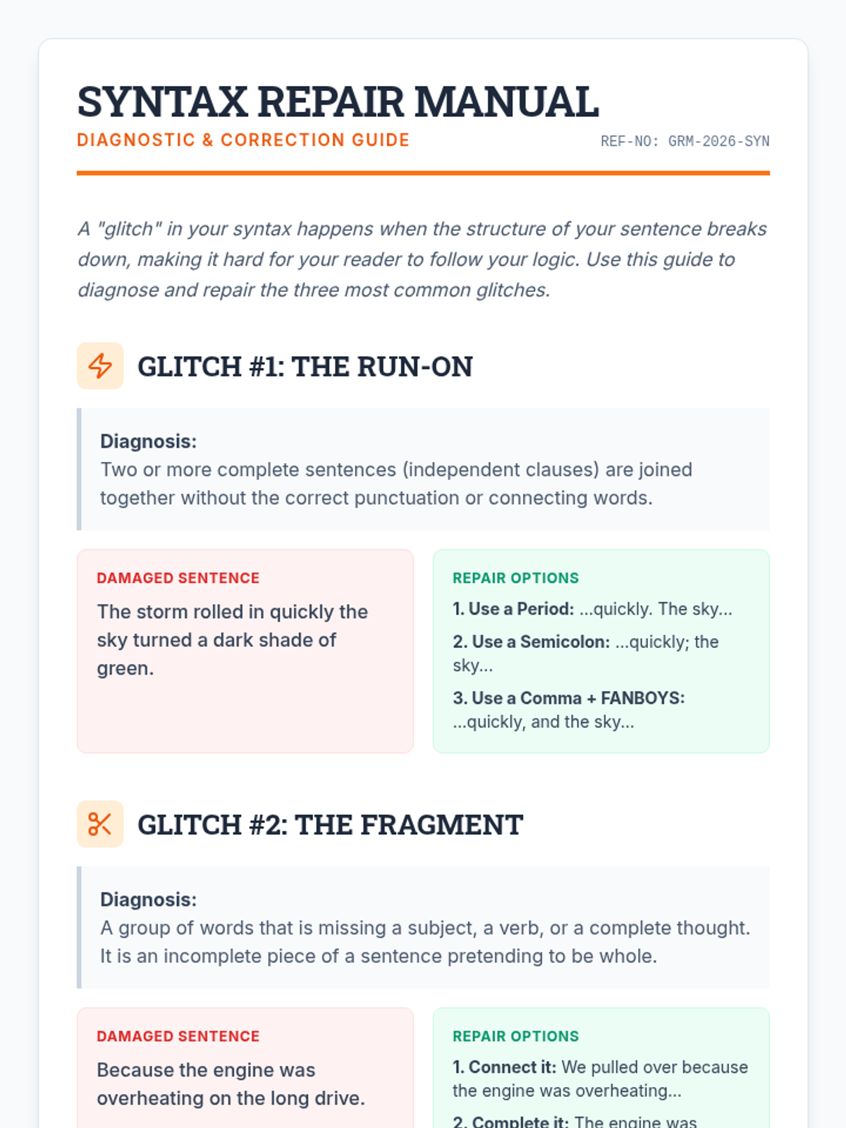 A 15-minute high-impact session focusing on identifying and repairing run-on sentences, sentence fragments, and vague pronoun-antecedent relationships. This lesson provides students with a 'repair manual' for common syntax glitches.
