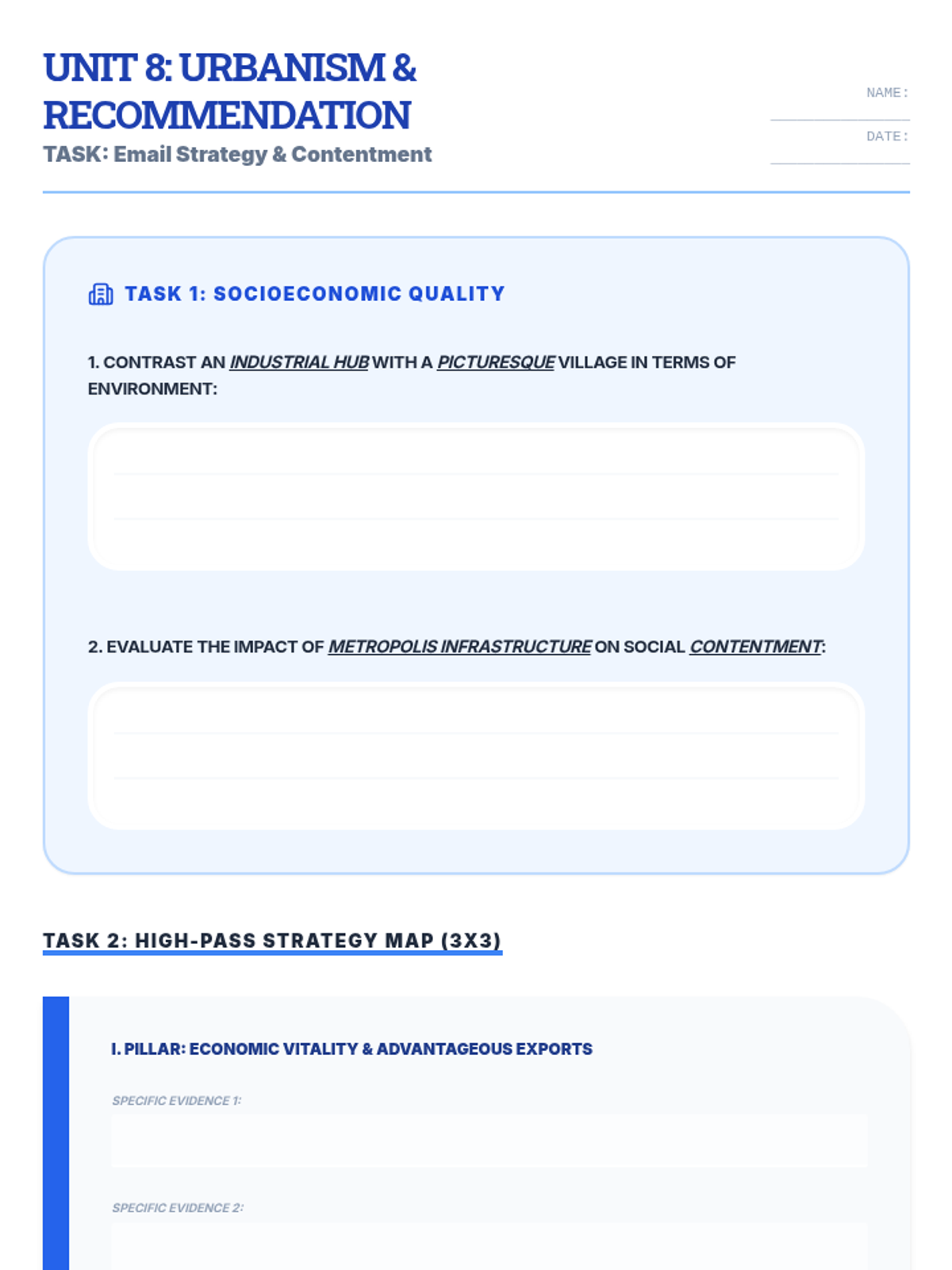 Teaches email etiquette and structure through a comparison of urban and rural life, focusing on sentence fragments and transitional words for comparison.