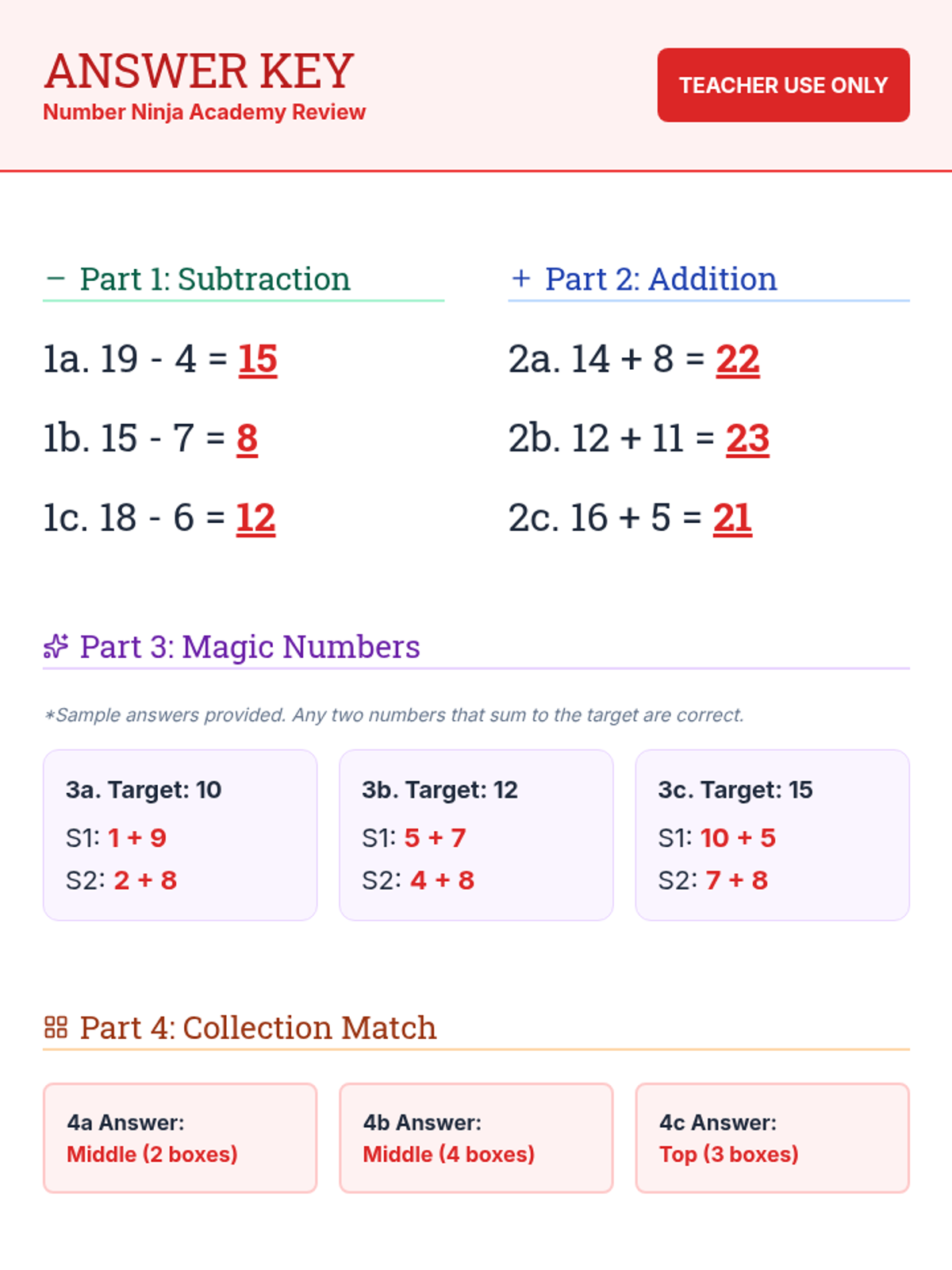A math review packet focusing on basic addition, subtraction, number combinations, and visual representation of groups, including a student worksheet and an answer key.