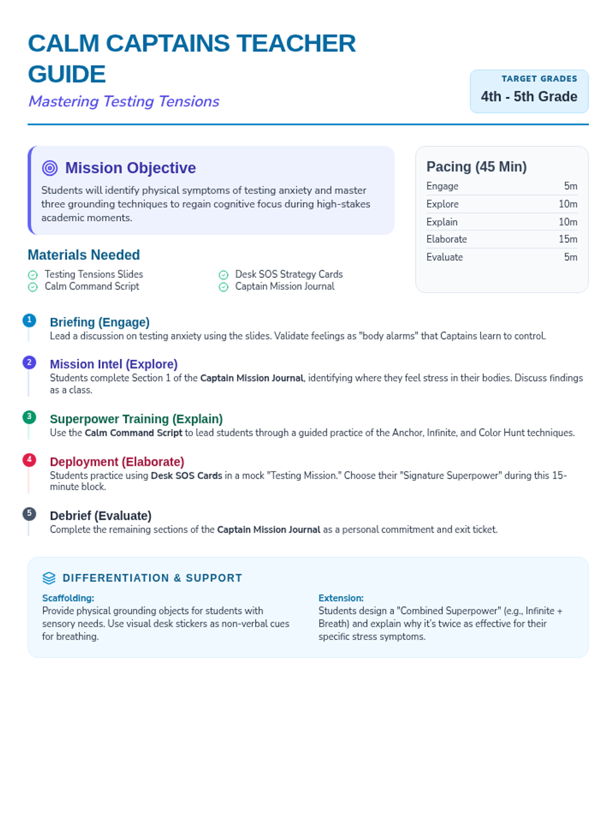 A stress-management lesson for 4th and 5th graders that transforms testing anxiety into 'superpower' grounding techniques. Students learn discrete, effective physical exercises to maintain focus and emotional control during exams.