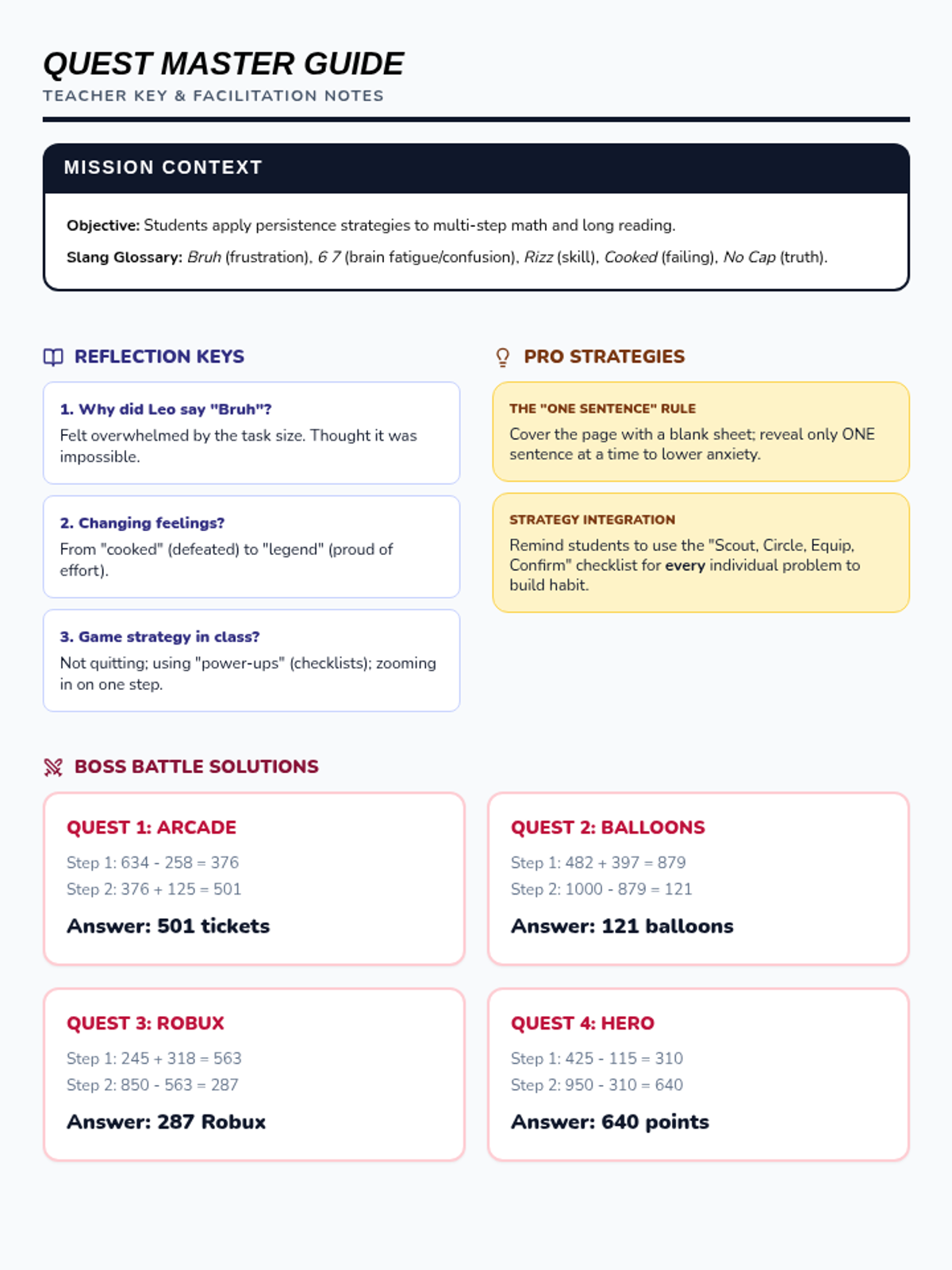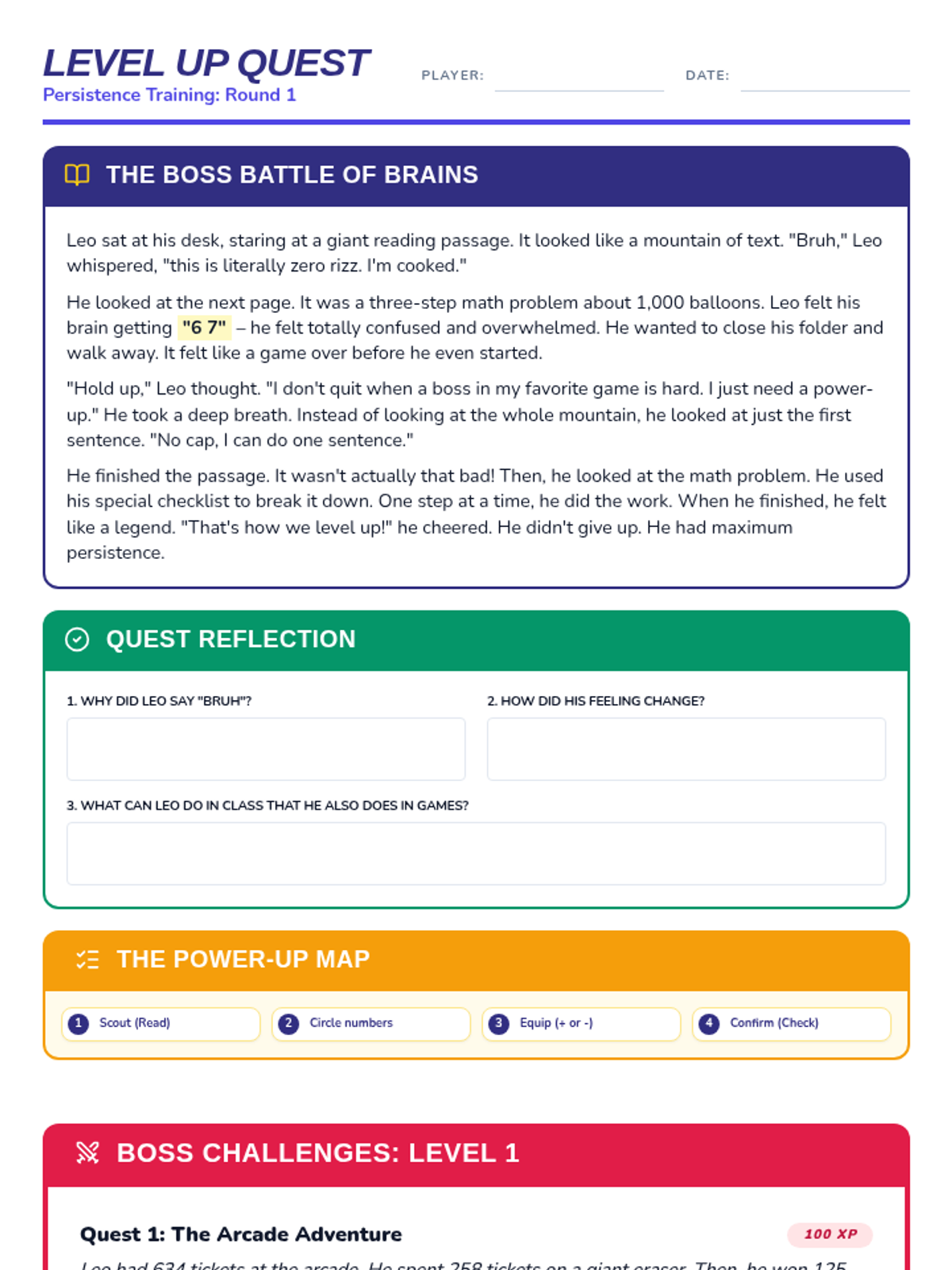 A lesson designed to help 3rd-grade students build persistence when facing multi-step math problems and long reading passages, using a gamer-themed social story and practical strategies.