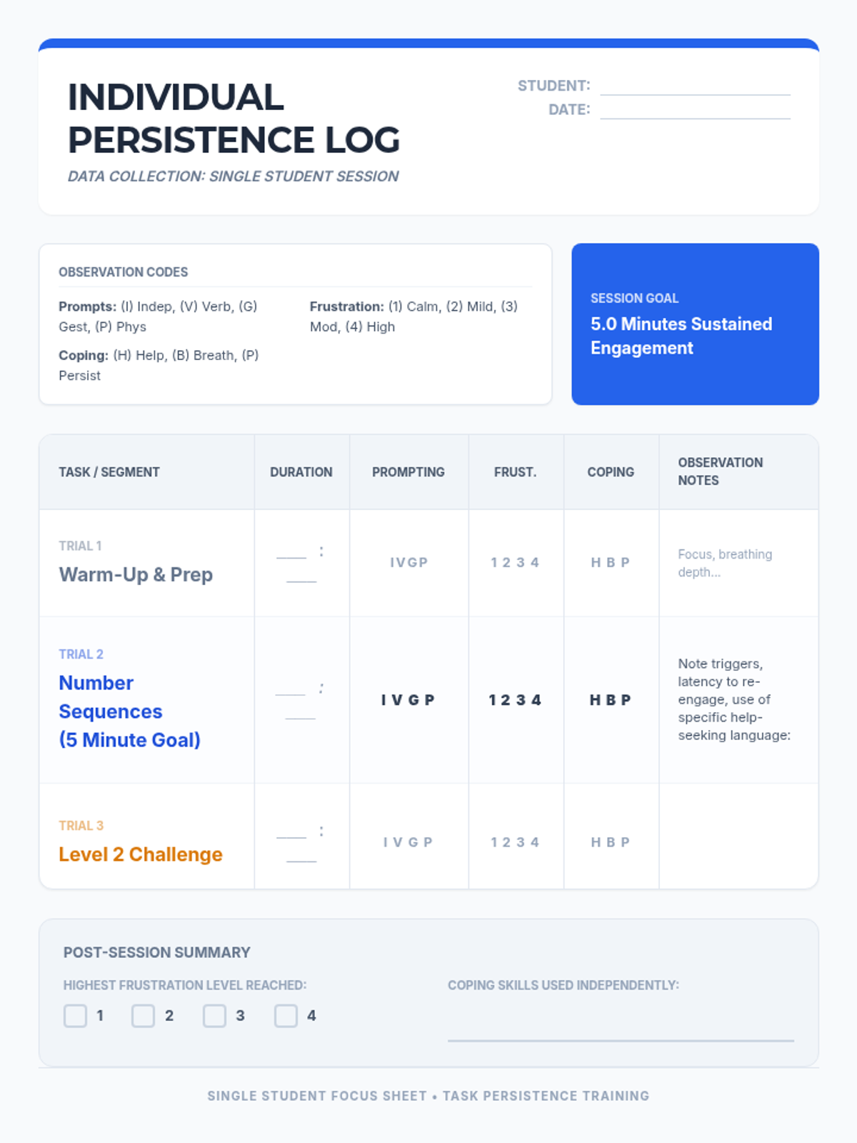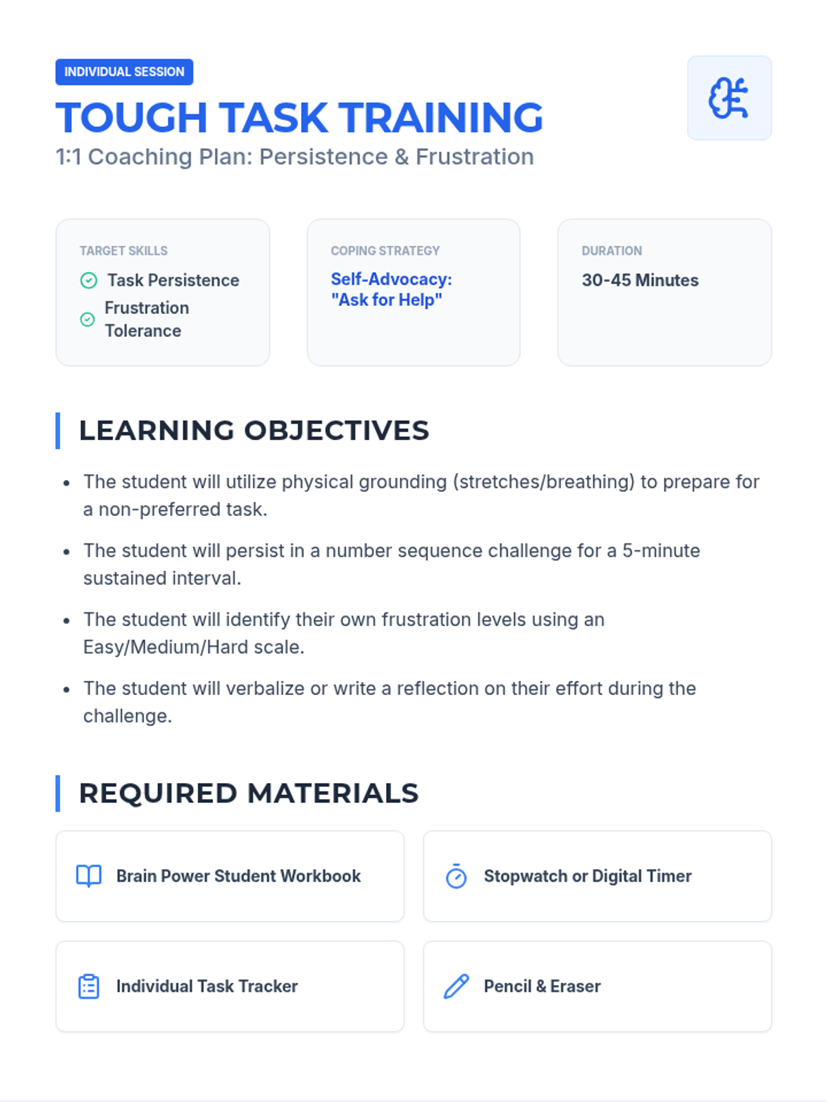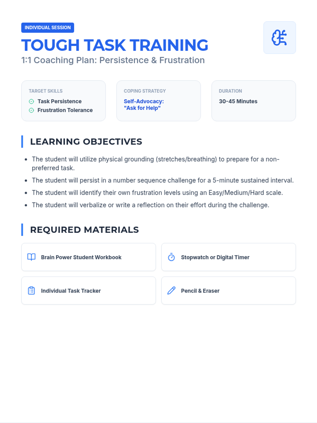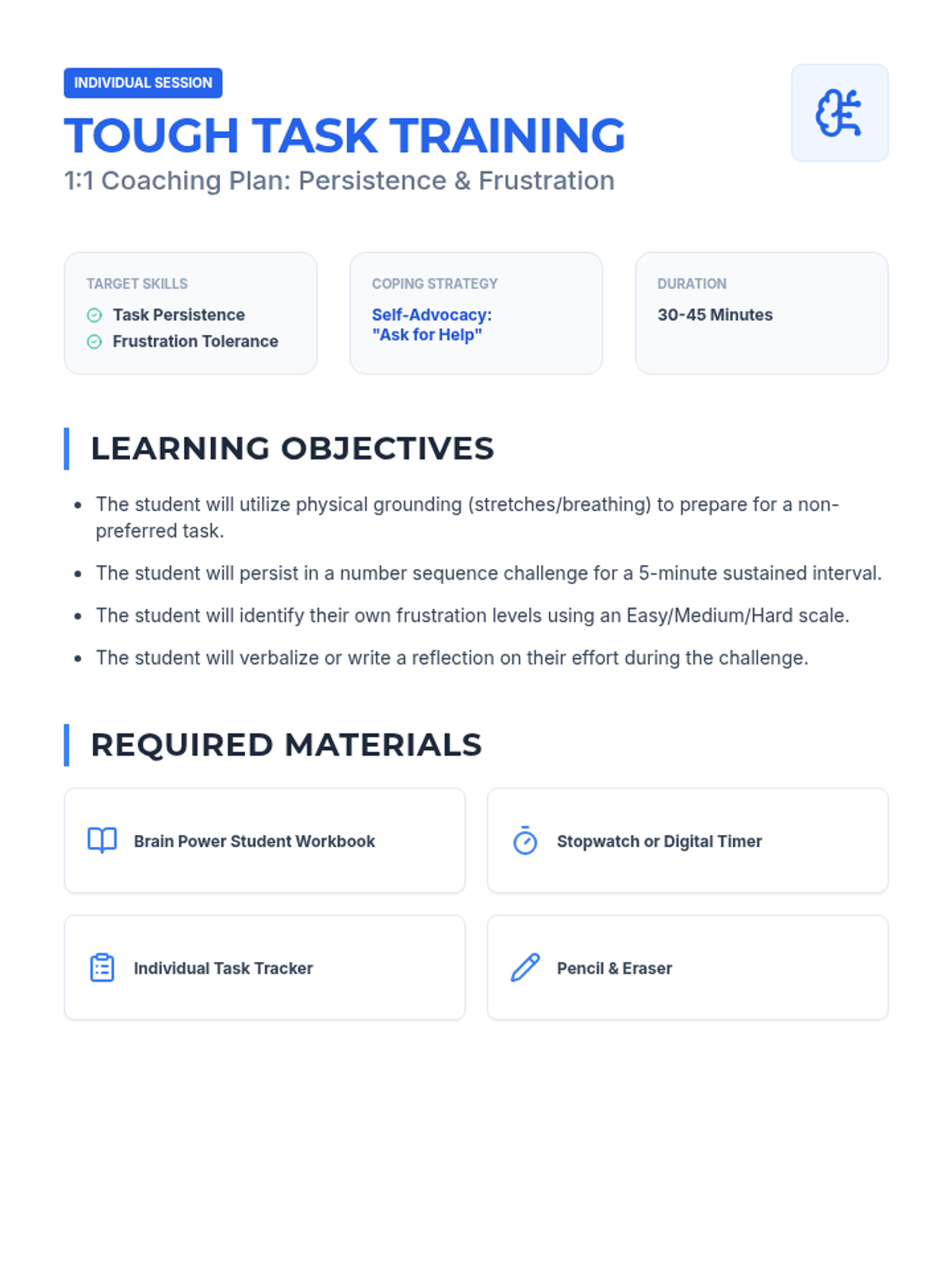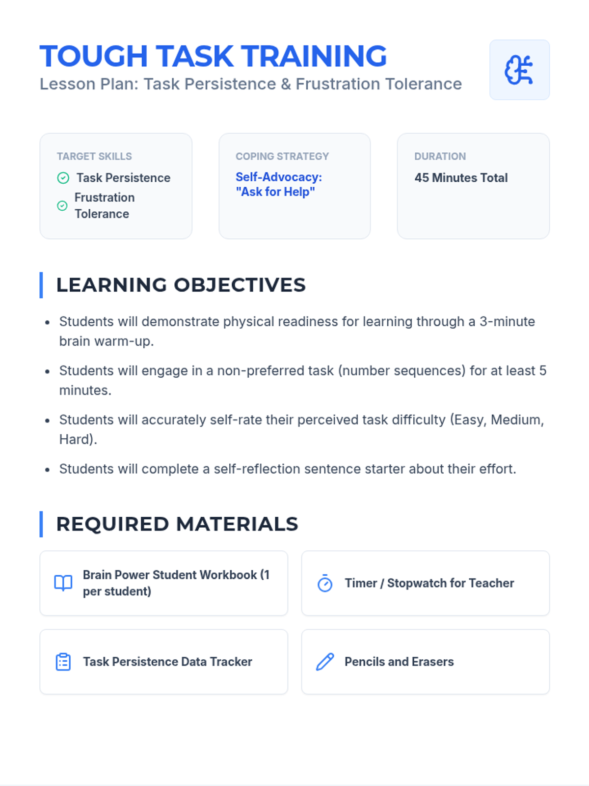 A comprehensive lesson focused on building task persistence and frustration tolerance when facing non-preferred tasks, specifically using number sequence challenges.