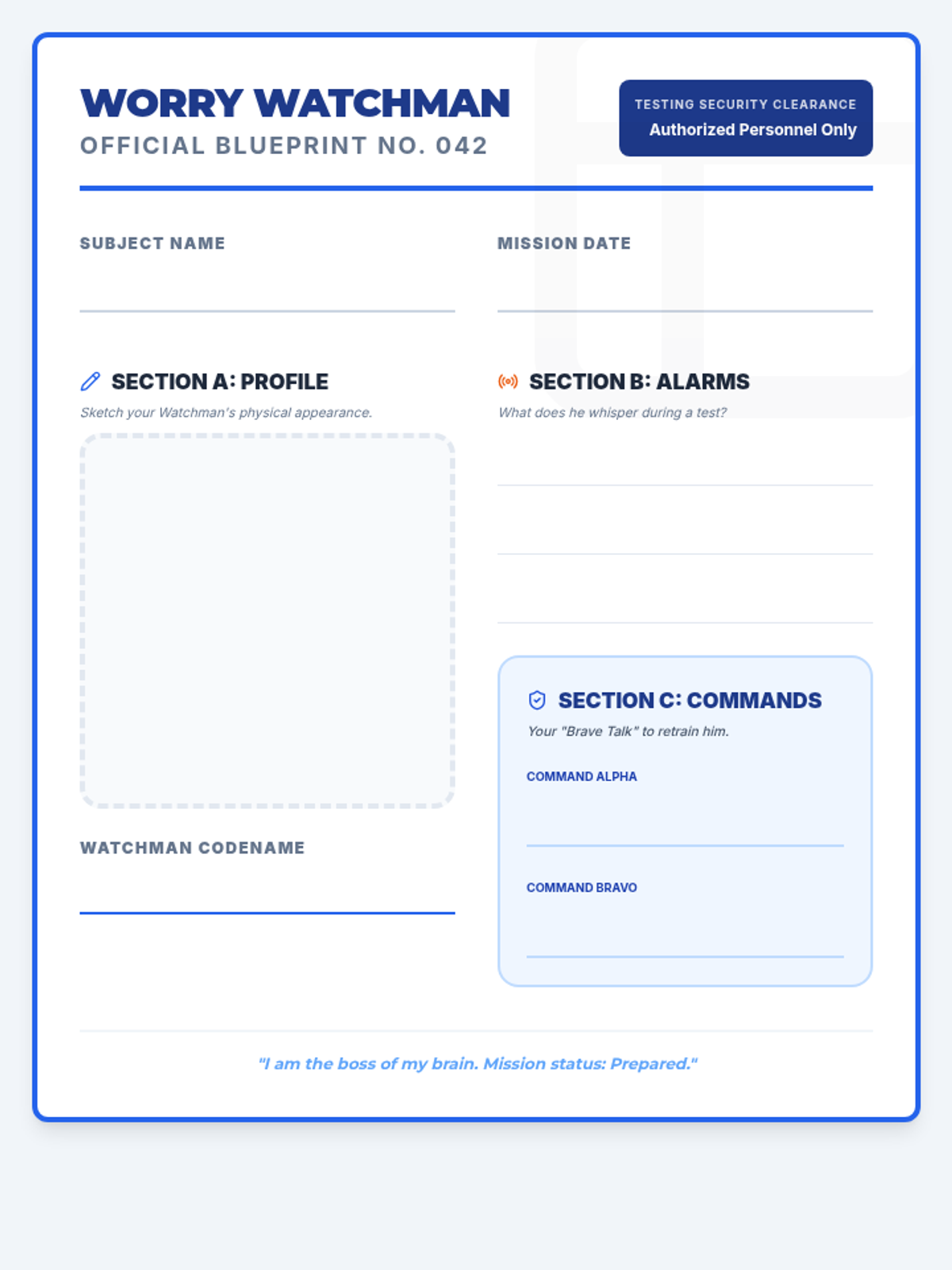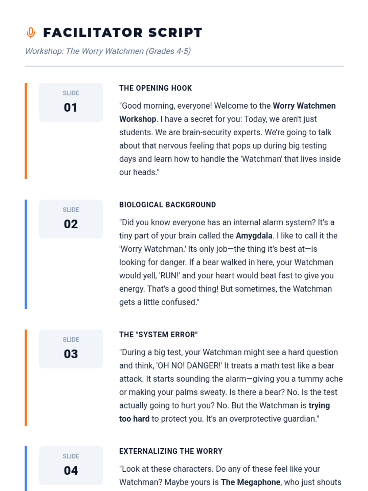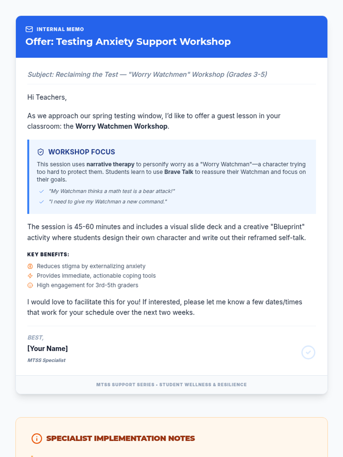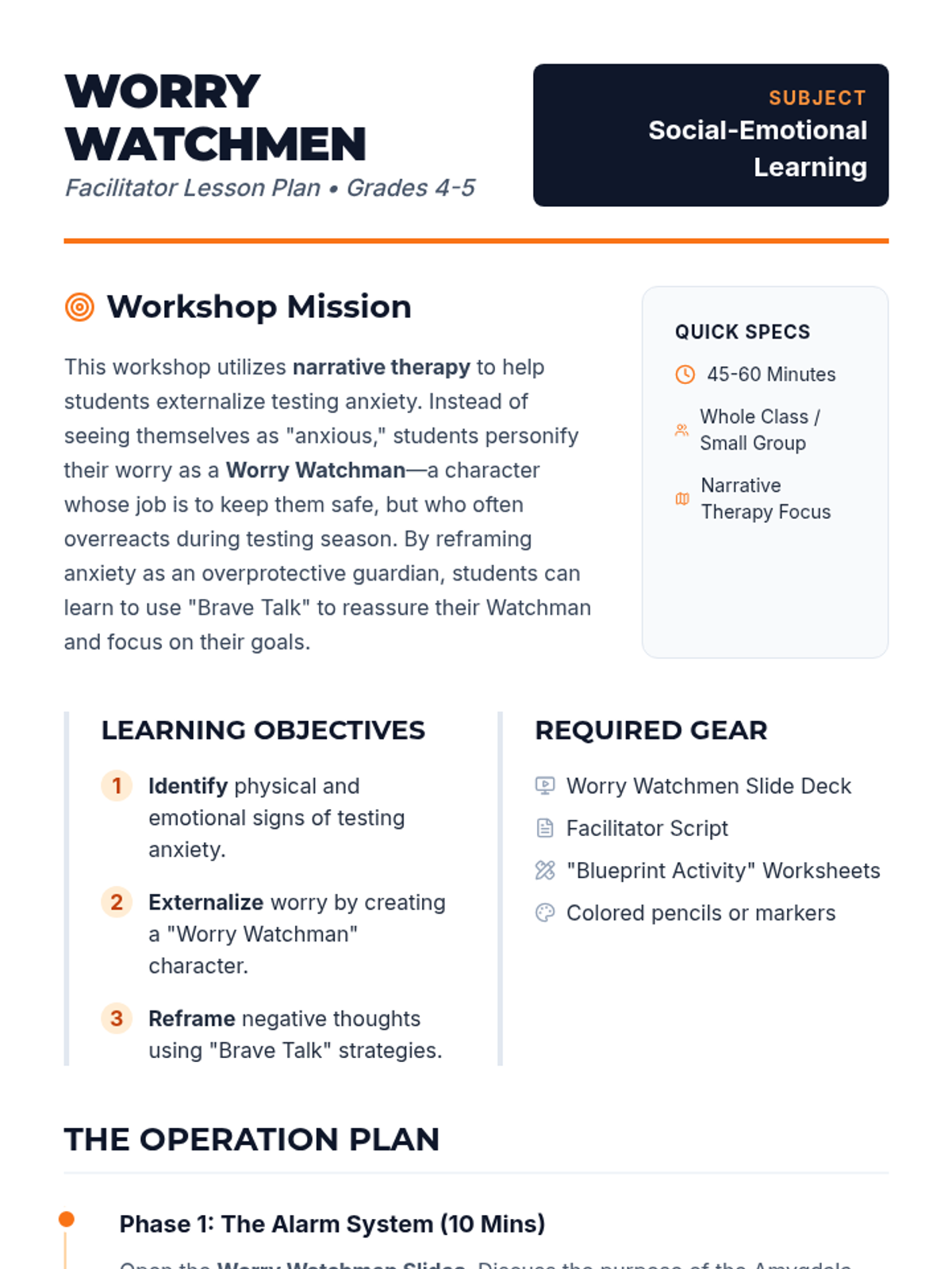 A workshop focused on managing testing anxiety by personifying worries as 'Worry Watchmen' who are trying too hard to protect students. Includes cognitive reframing techniques and narrative therapy approaches for 4th and 5th graders.