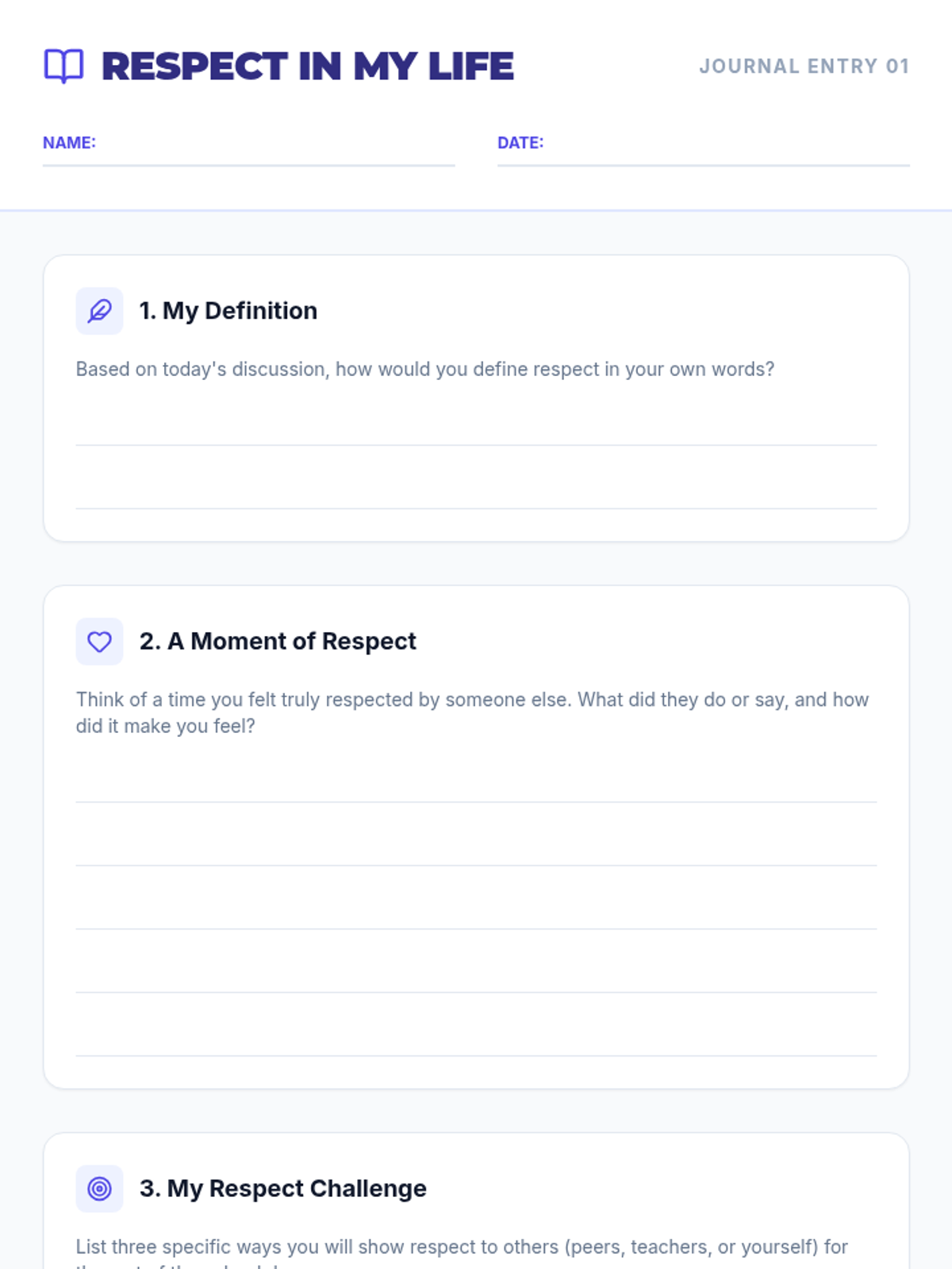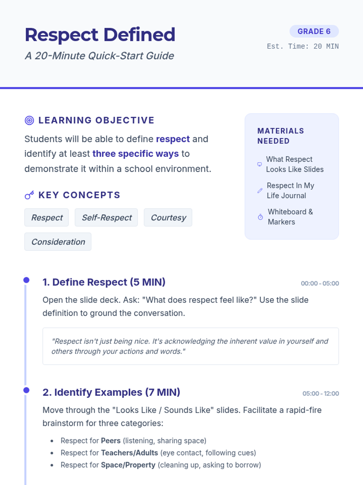 A 20-minute introductory lesson for 6th graders to explore the multi-faceted definition of respect and its practical applications in a school environment.