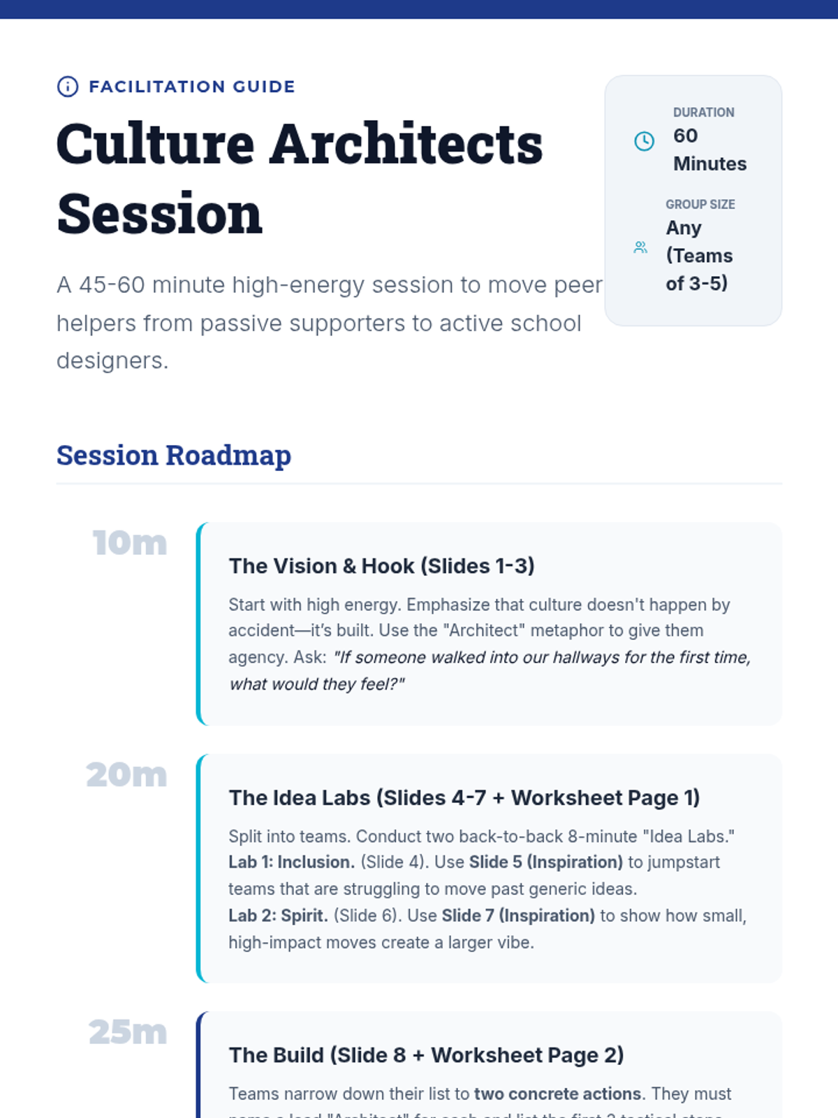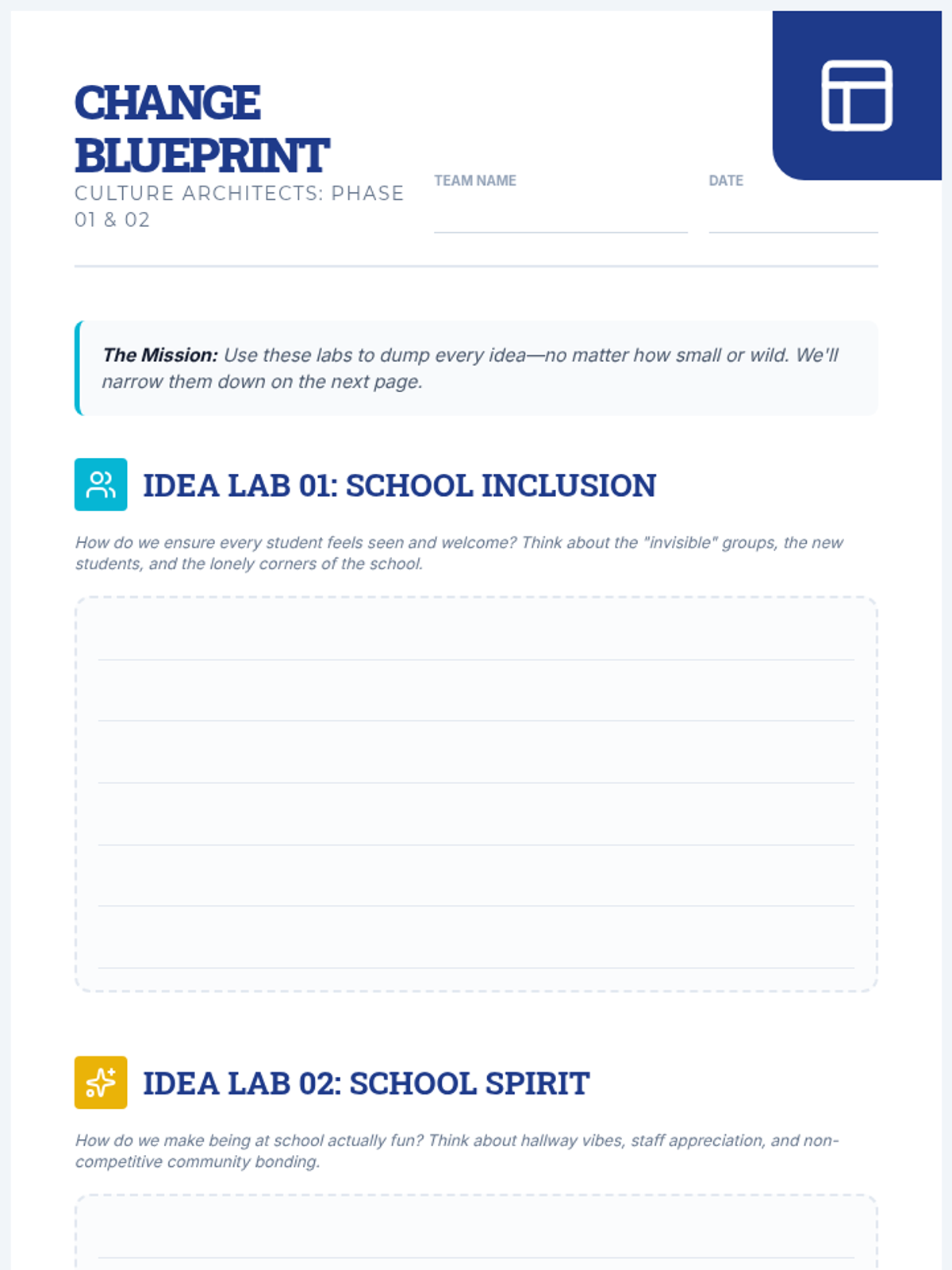 A high-energy brainstorming session designed to empower peer helpers to design and implement initiatives for school inclusion and community spirit. Students will transition from abstract goals to concrete action plans using a 'Culture Architect' framework.
