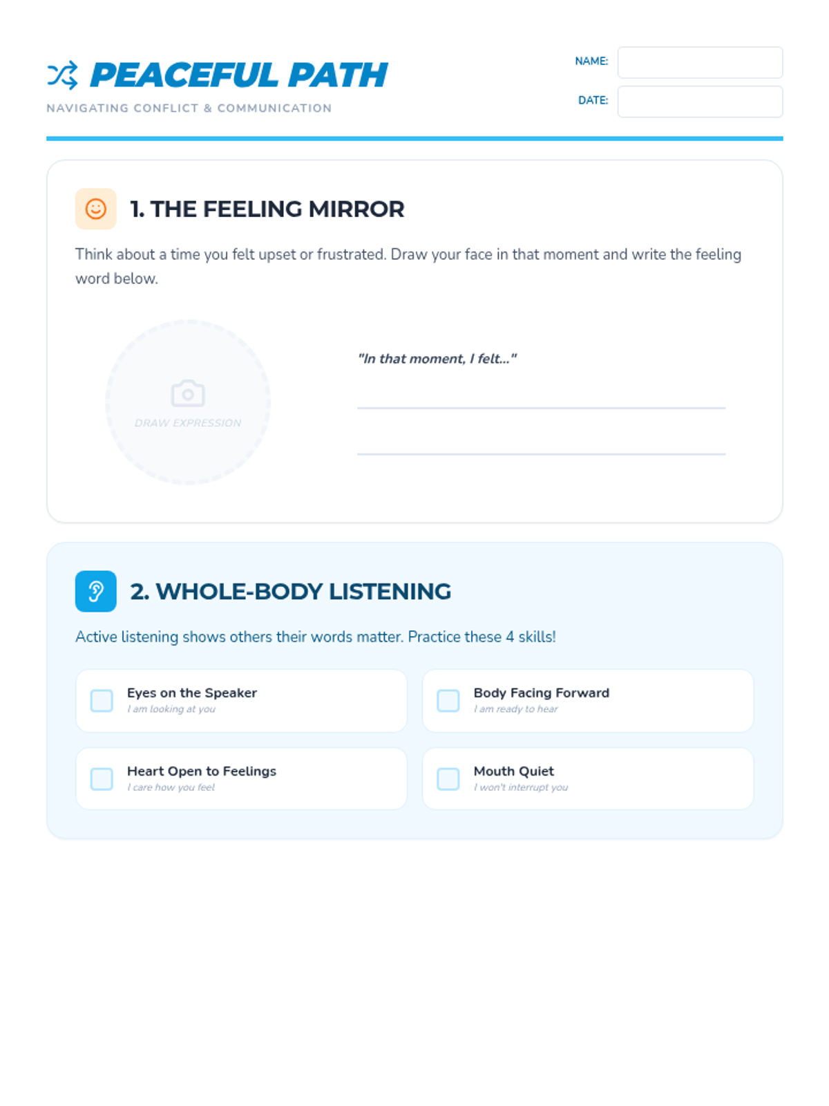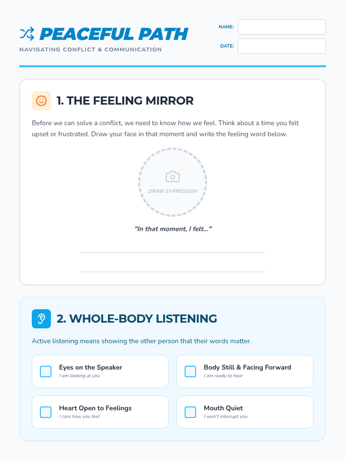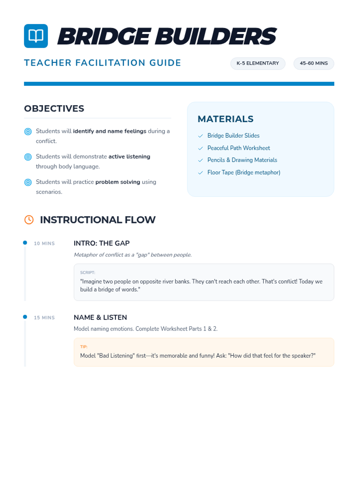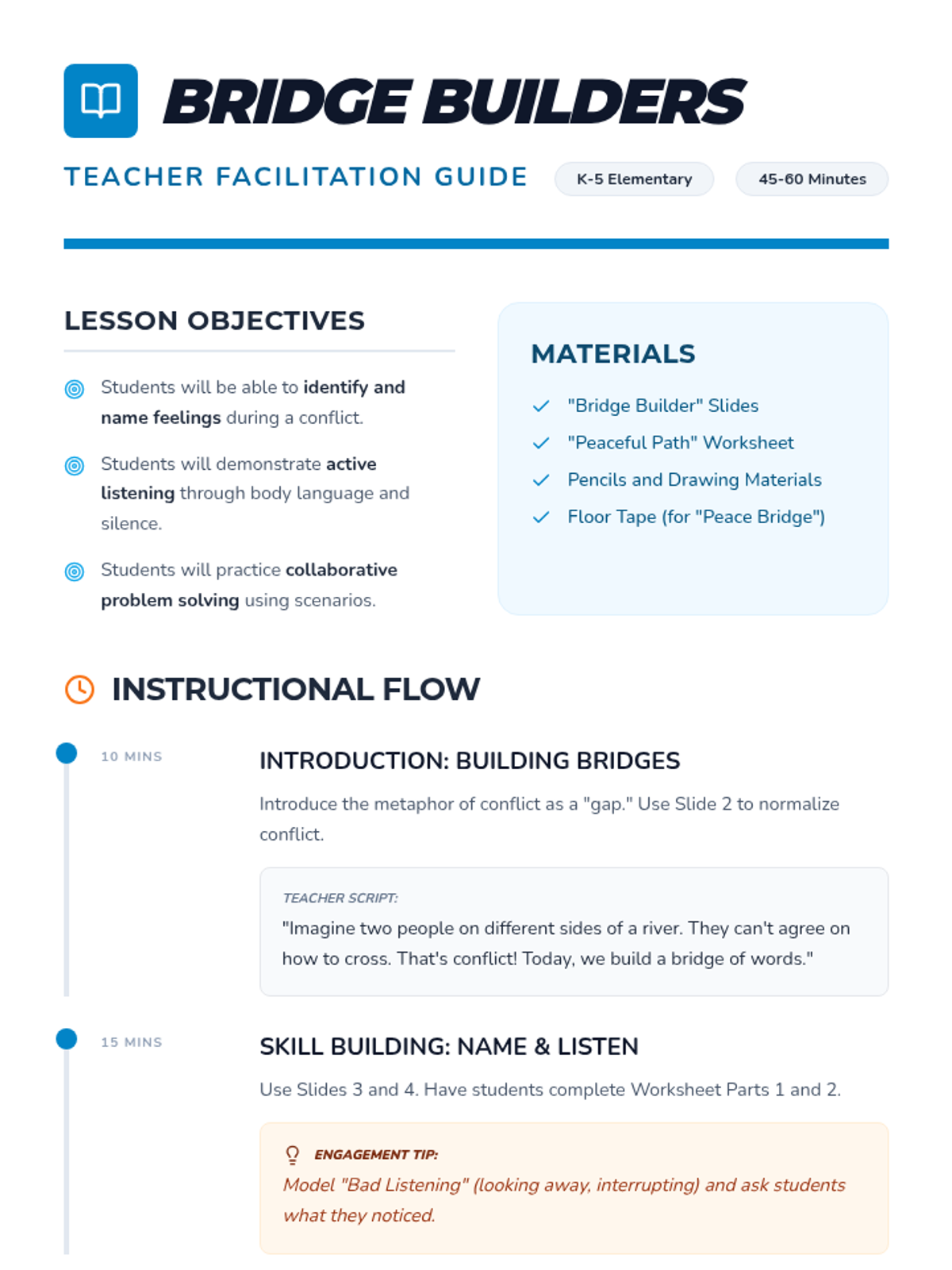 A lesson focused on teaching students how to navigate disagreements by identifying their emotions and practicing active listening skills. Includes a guided worksheet, instructional slides, and a teacher facilitation guide.