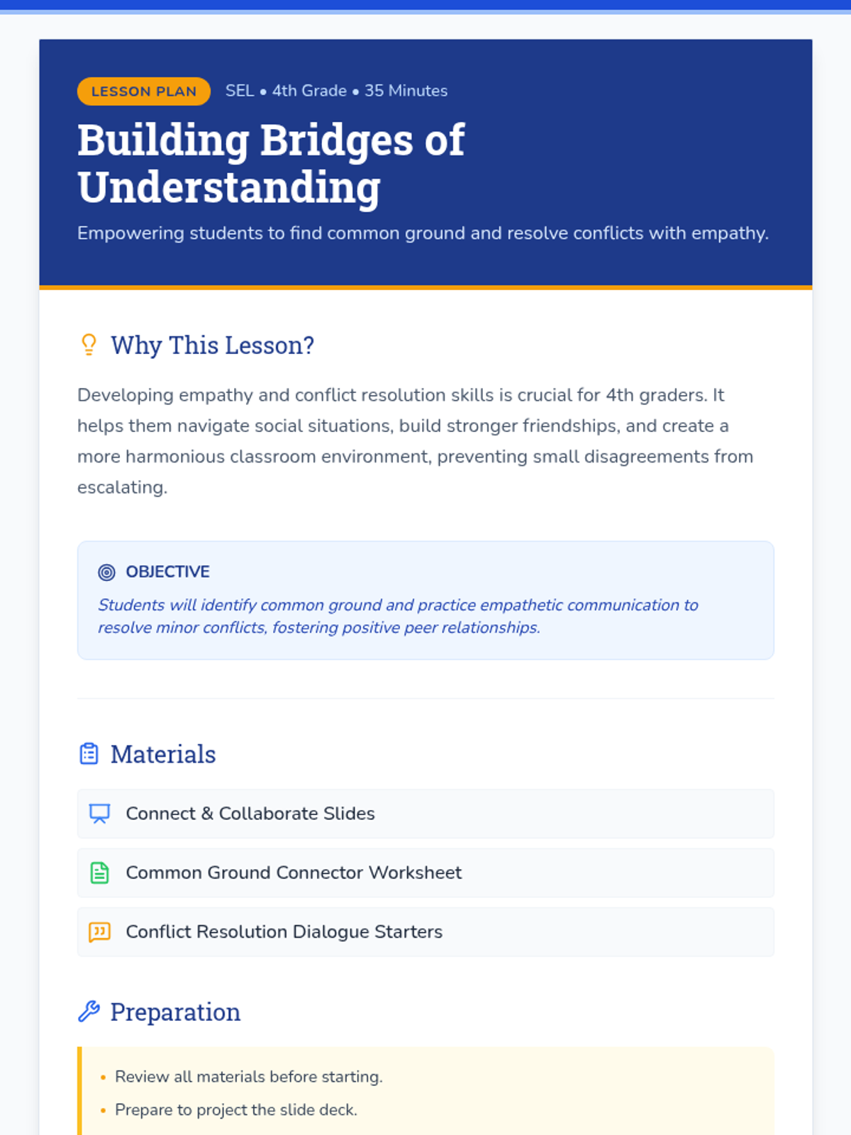 A 35-minute social-emotional learning lesson for 4th graders focused on developing empathy and conflict resolution skills through the metaphor of bridge building.