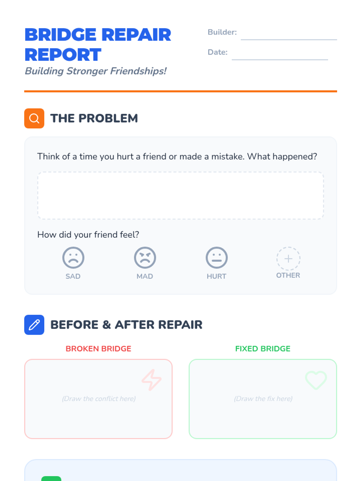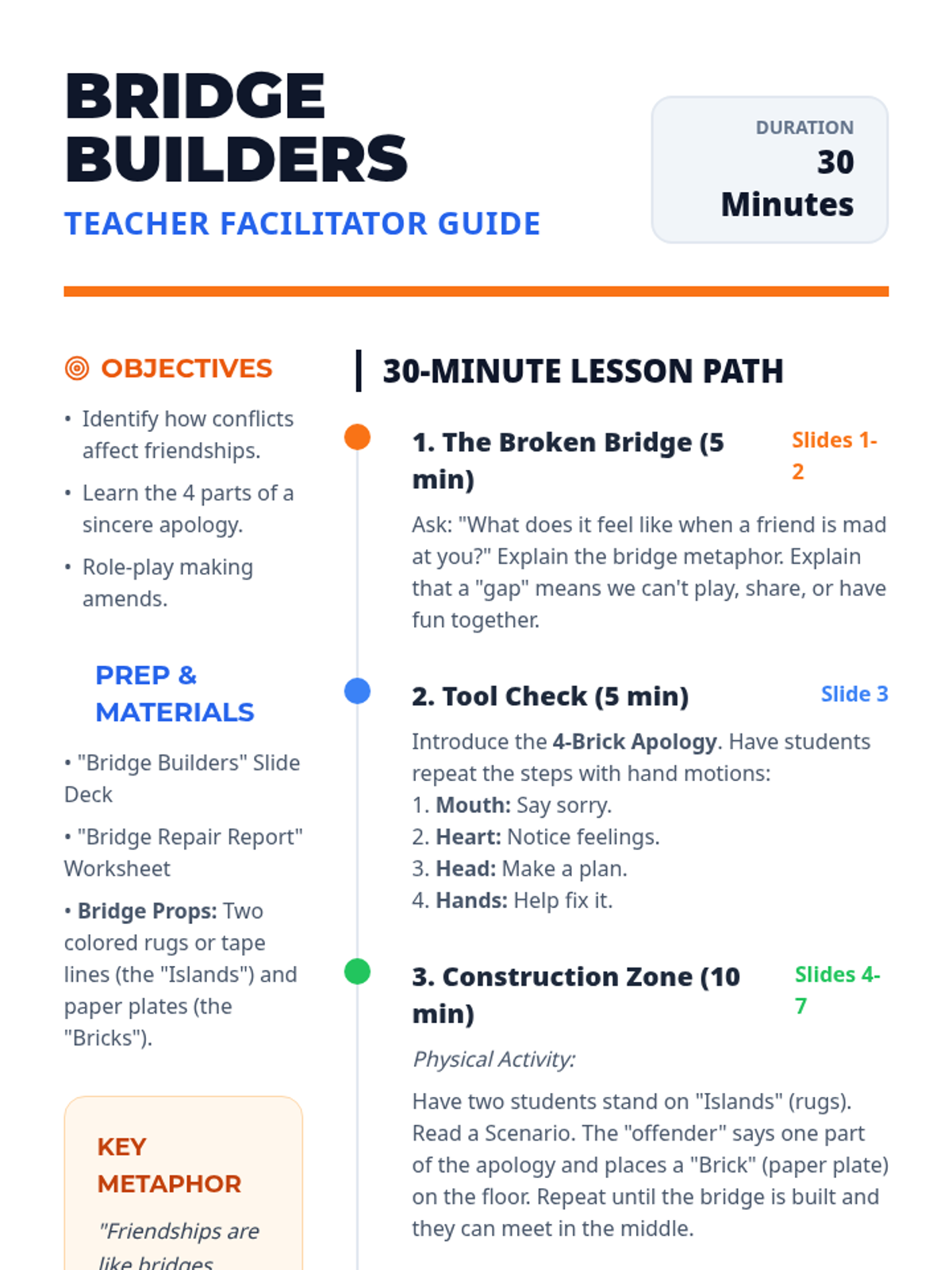 A 30-minute social-emotional learning lesson for 1st graders focused on resolving conflicts and delivering sincere apologies using a 'bridge-building' metaphor.