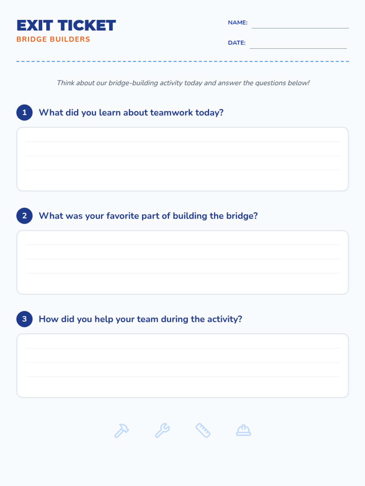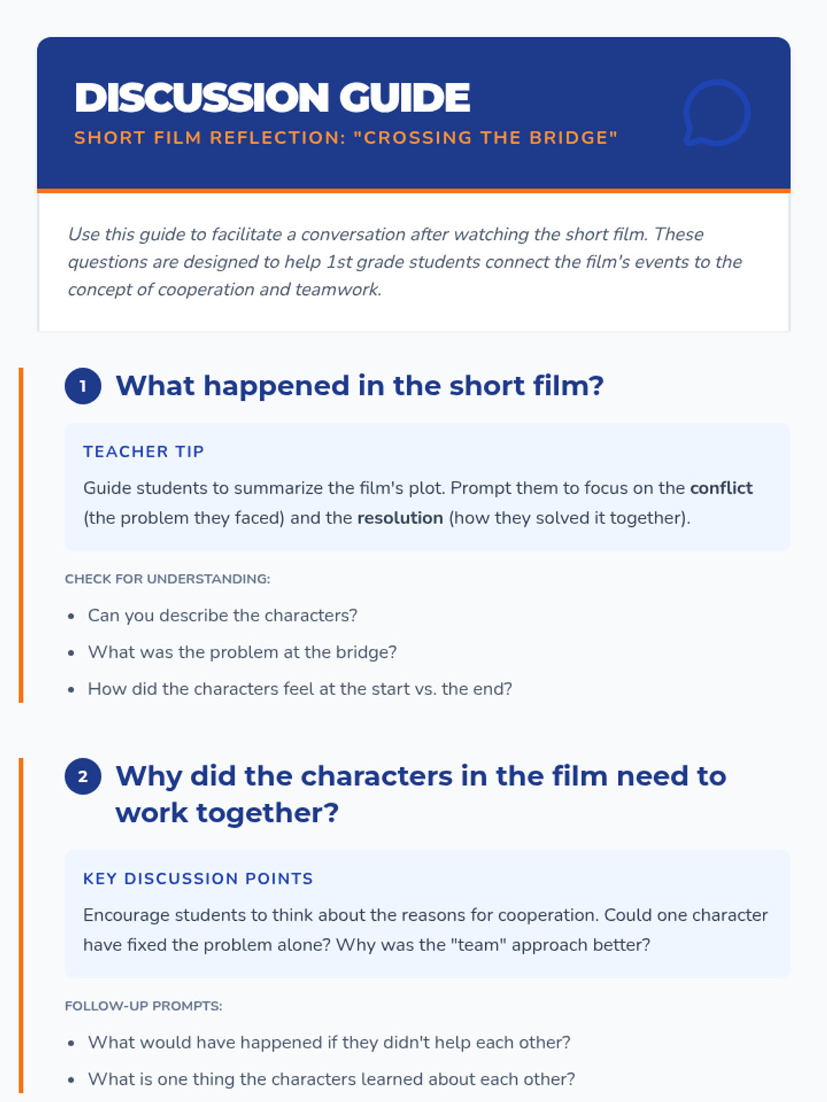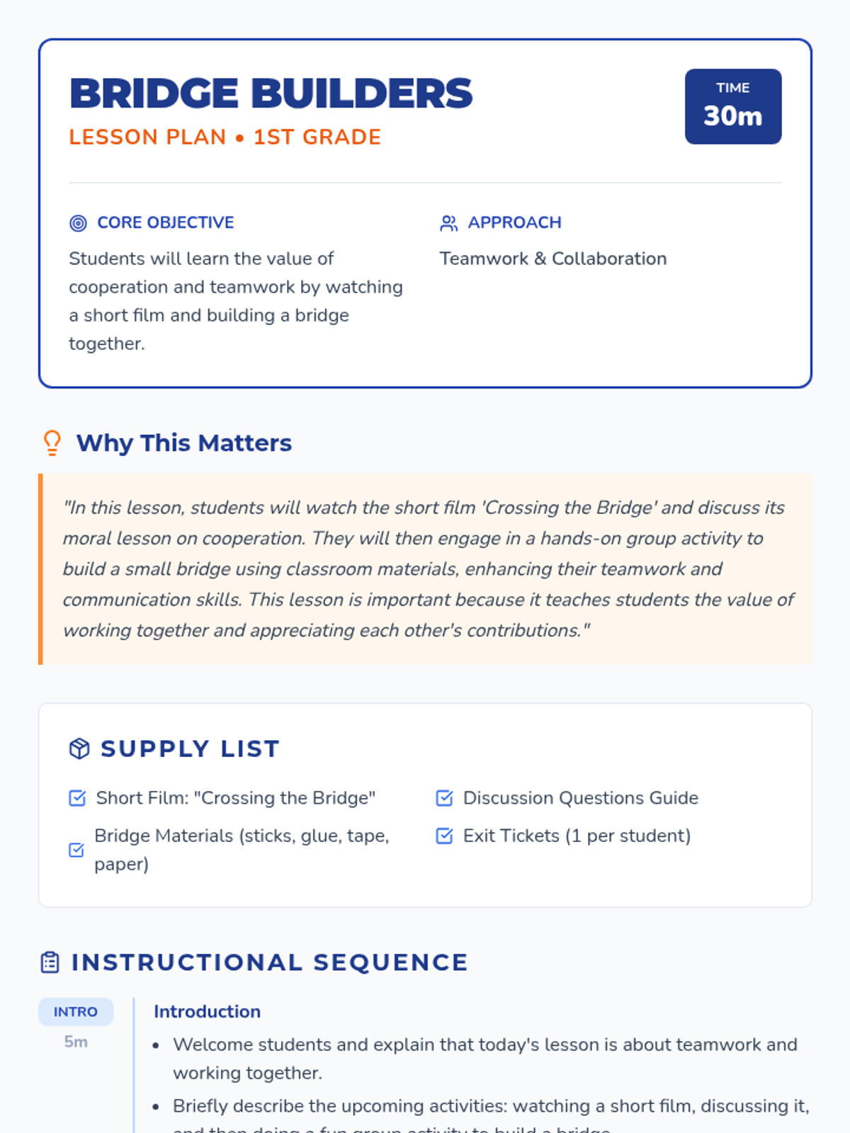 A 30-minute lesson for 1st grade focusing on cooperation and teamwork through a short film and a hands-on bridge-building activity.