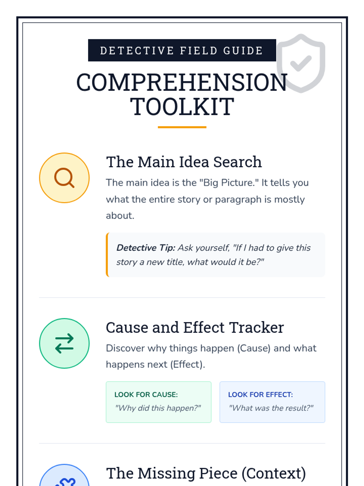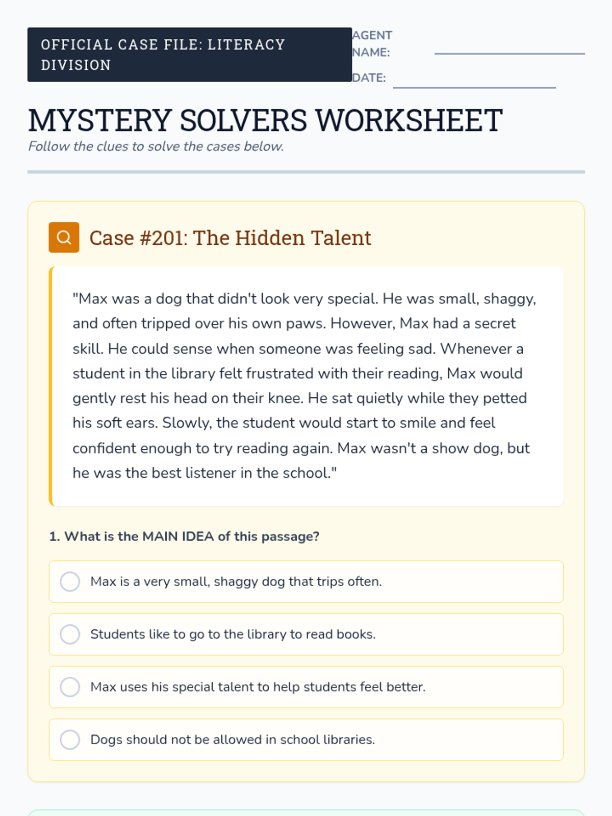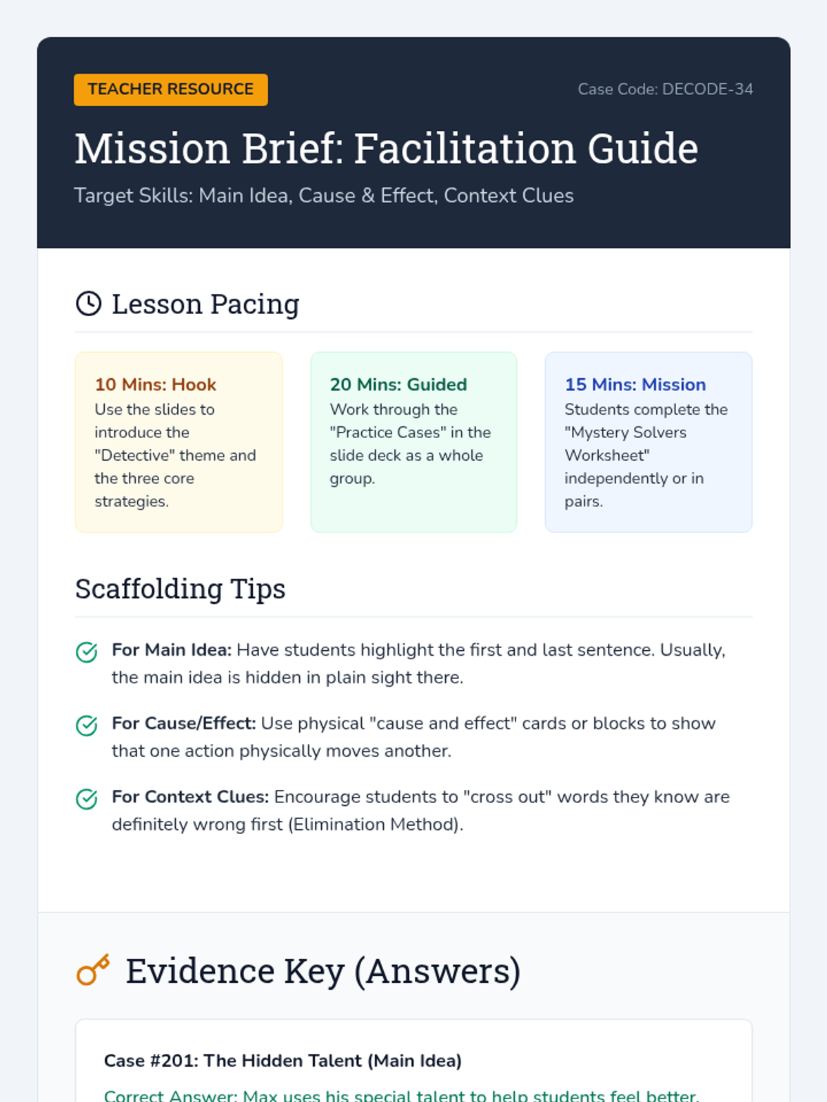 A reading intervention lesson designed to help 3rd and 4th graders master main idea, cause and effect, and sentence completion through a detective-themed series of activities. Students act as 'Reading Detectives' to uncover clues and solve literacy mysteries.