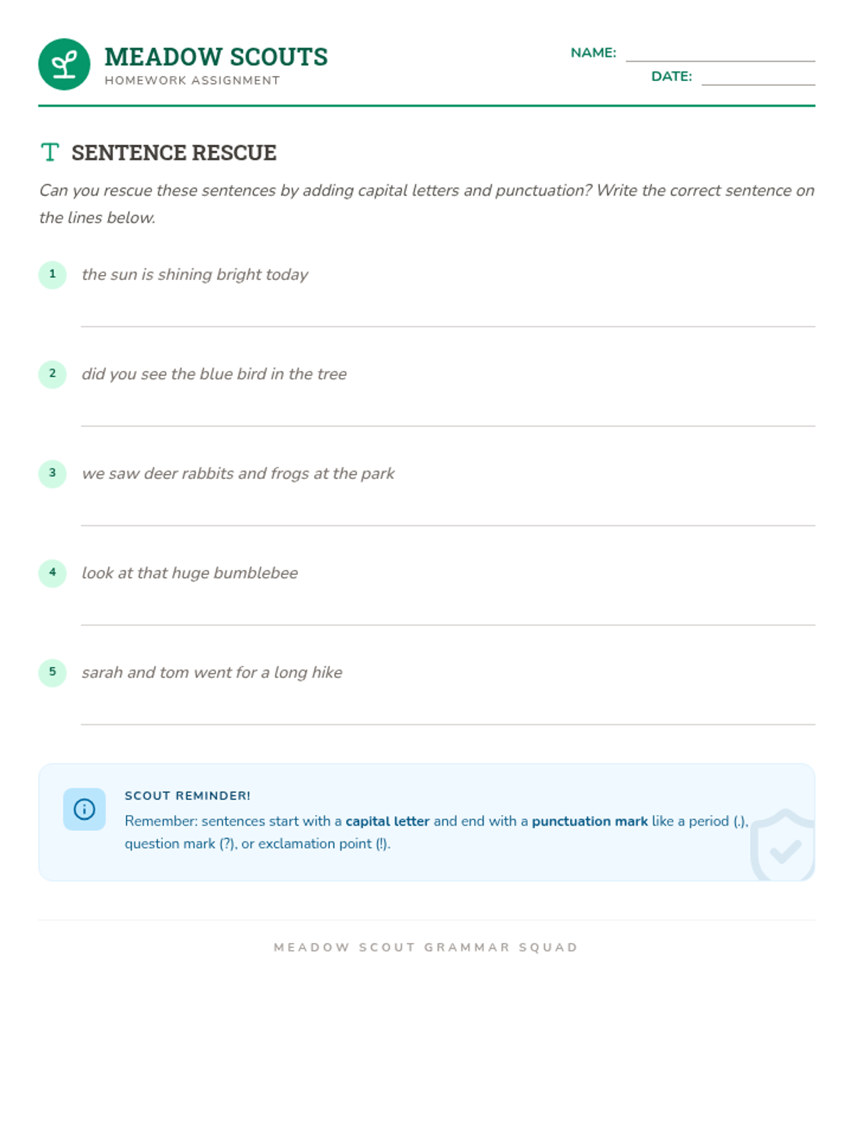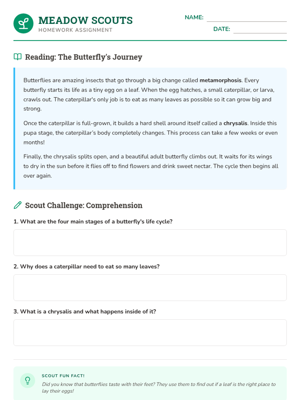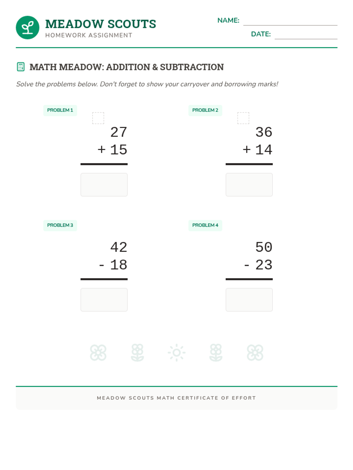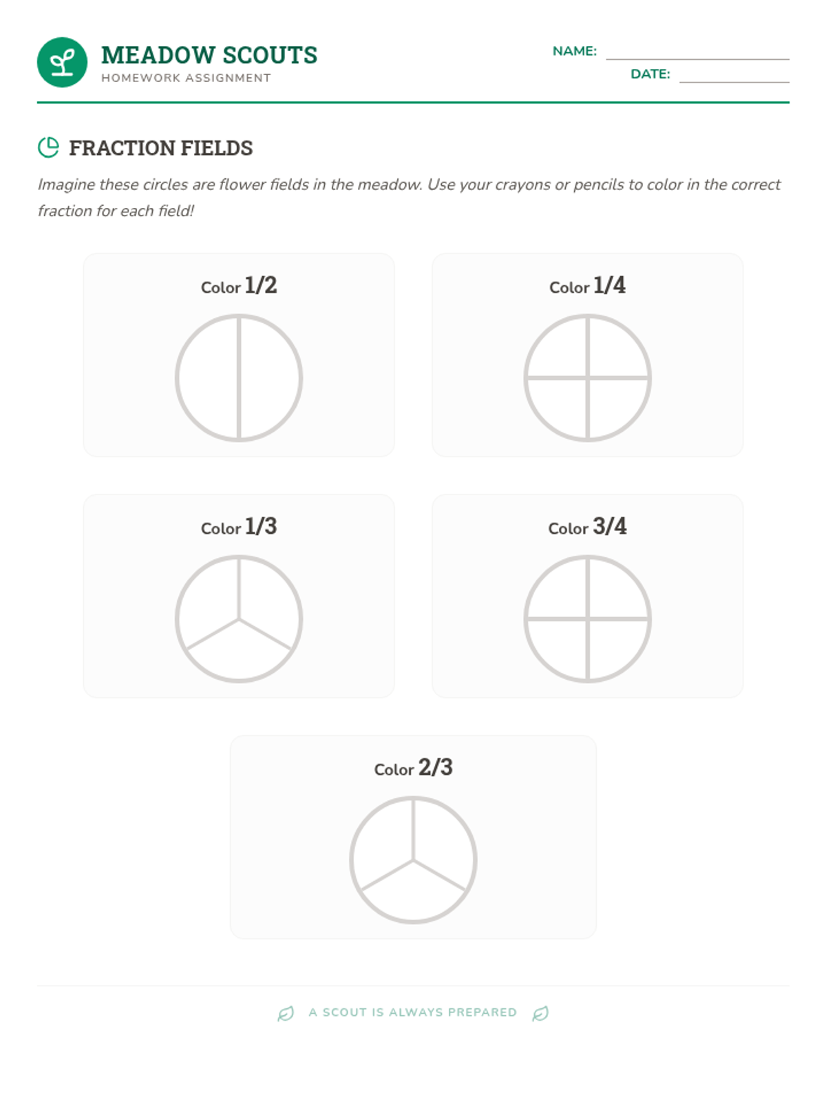 A collection of foundational homework worksheets covering reading comprehension, arithmetic, grammar, and basic fractions with a nature-inspired 'Meadow Scouts' theme.
