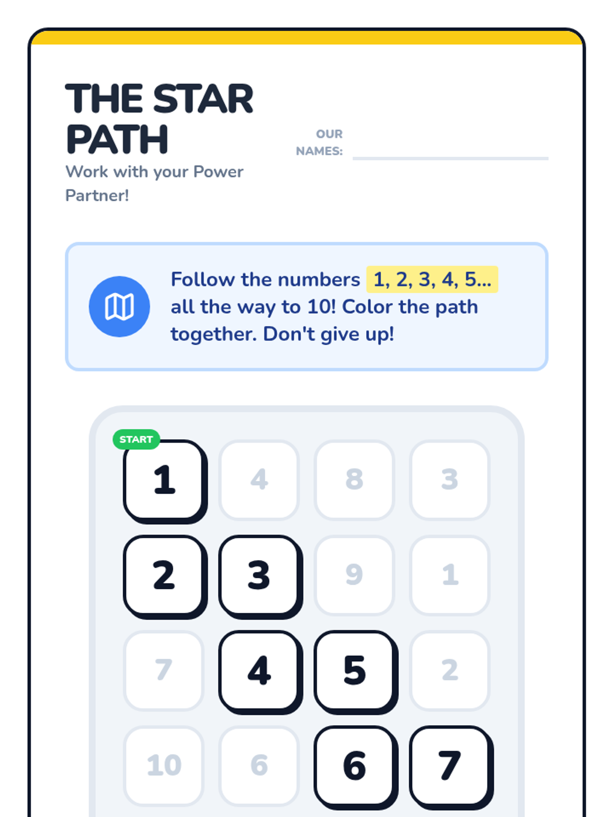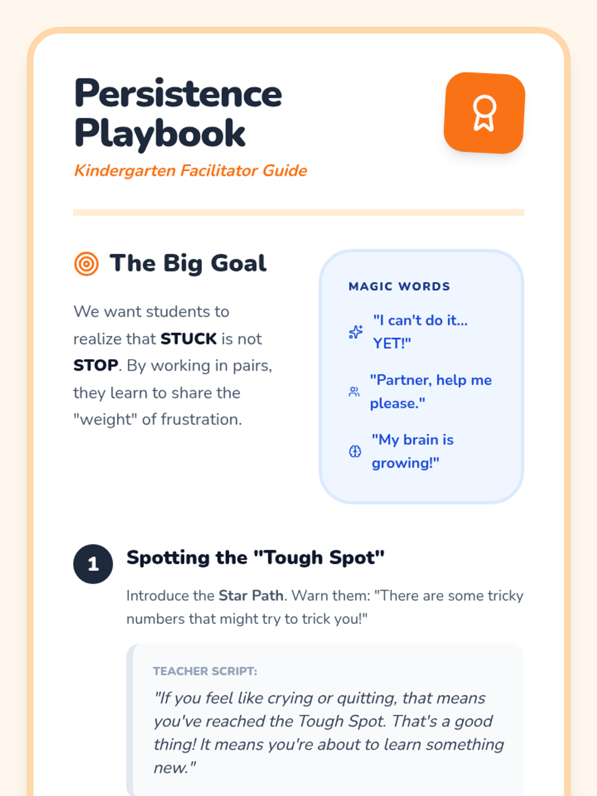A foundational social-emotional learning lesson for kindergarteners about persistence and working together. Students practice staying calm when things are hard and helping friends through a collaborative counting and path-finding challenge.