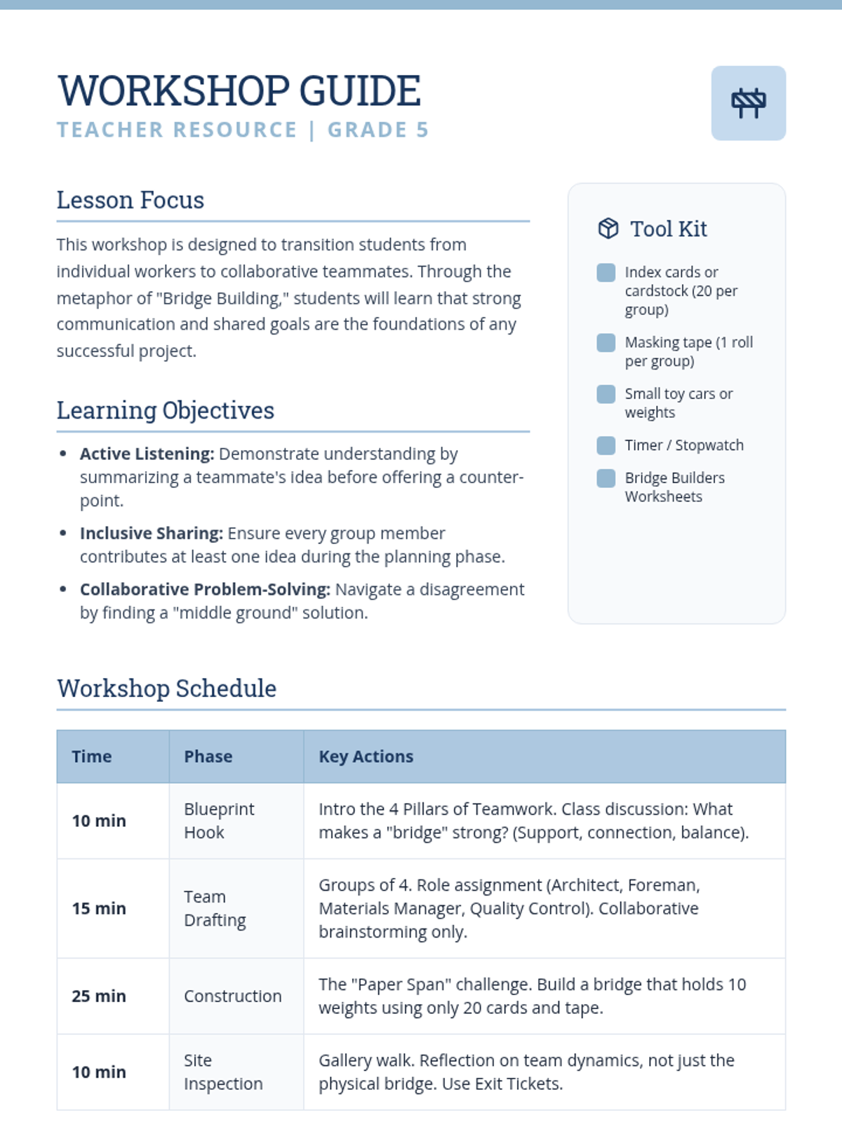 A hands-on workshop where 5th graders develop collaboration and teamwork skills through engineering-style creative challenges. Students practice active listening, respectful sharing, and collective problem-solving.