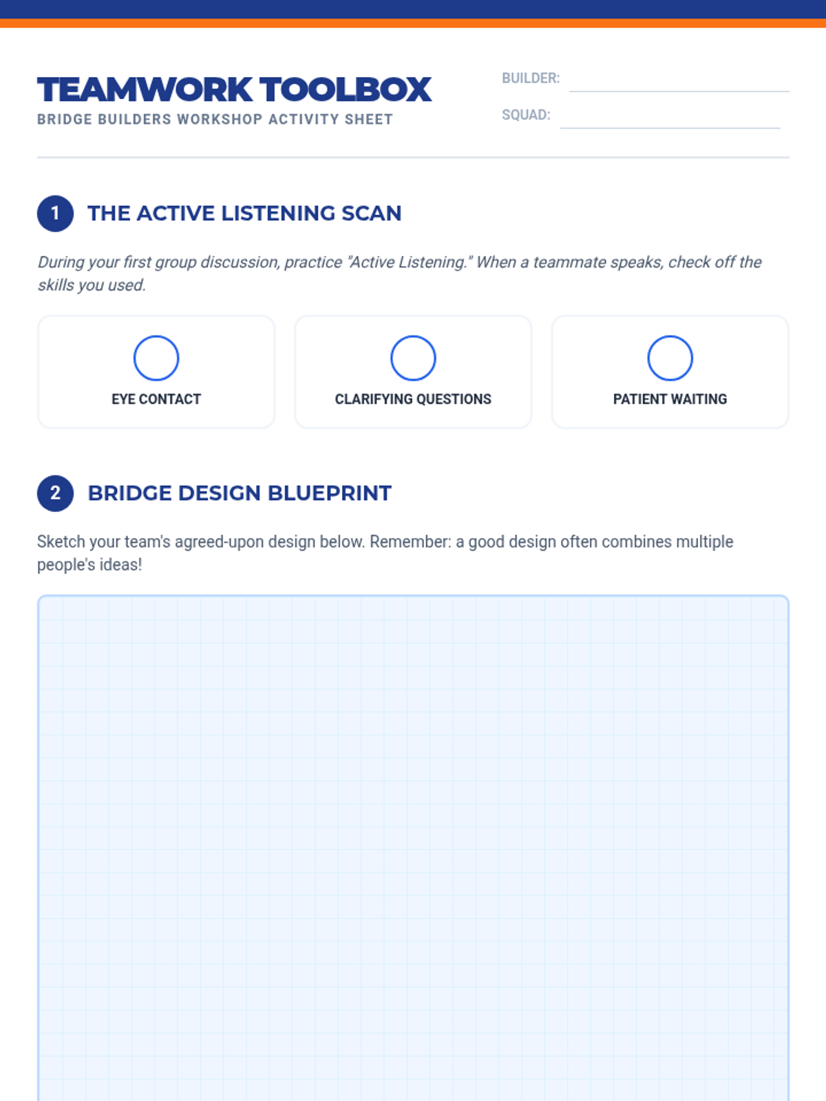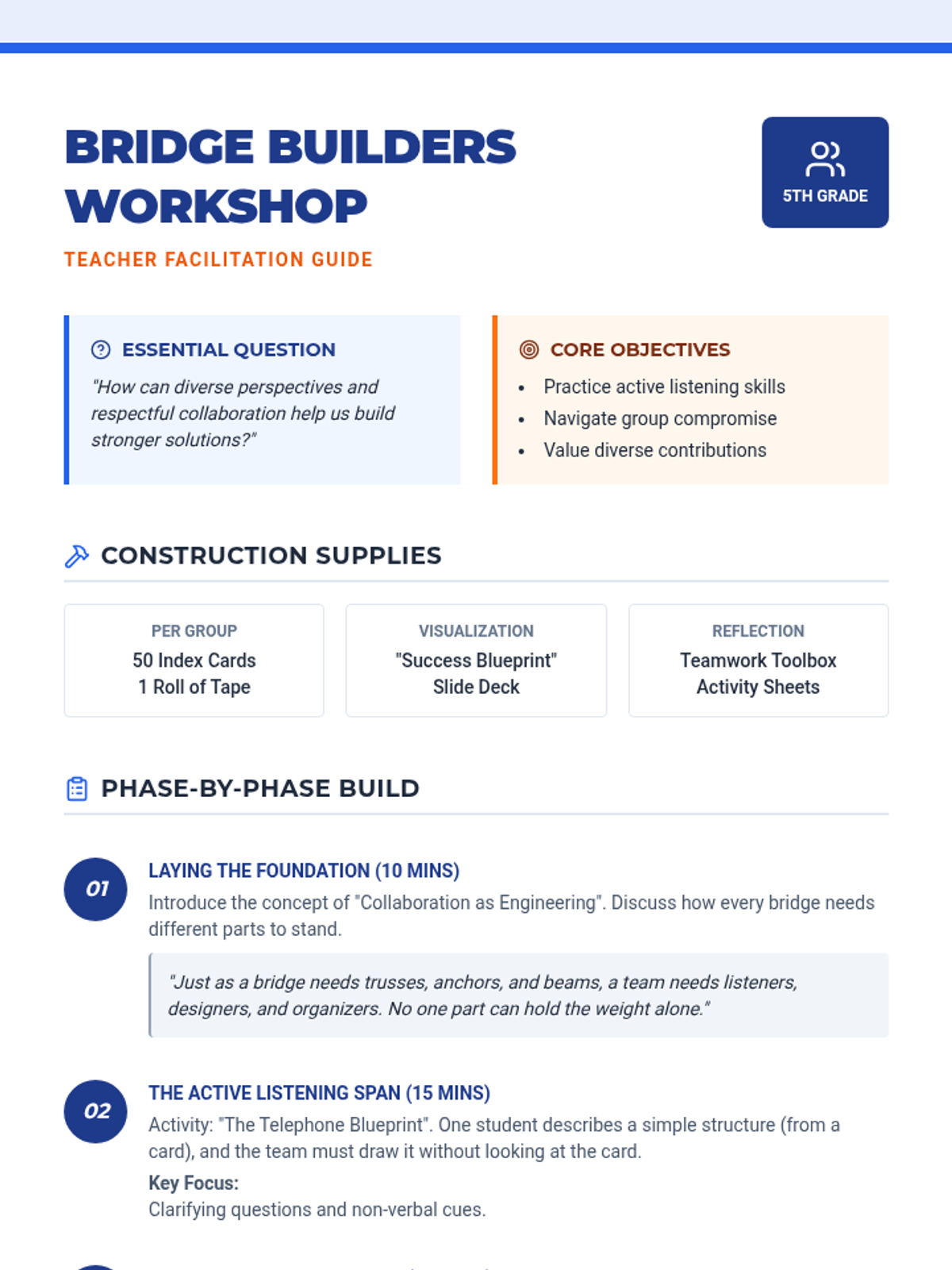 This lesson cultivates essential collaboration and teamwork skills through hands-on engineering-themed challenges. Students learn to listen actively, share ideas respectfully, and appreciate diverse contributions while building literal and metaphorical bridges.