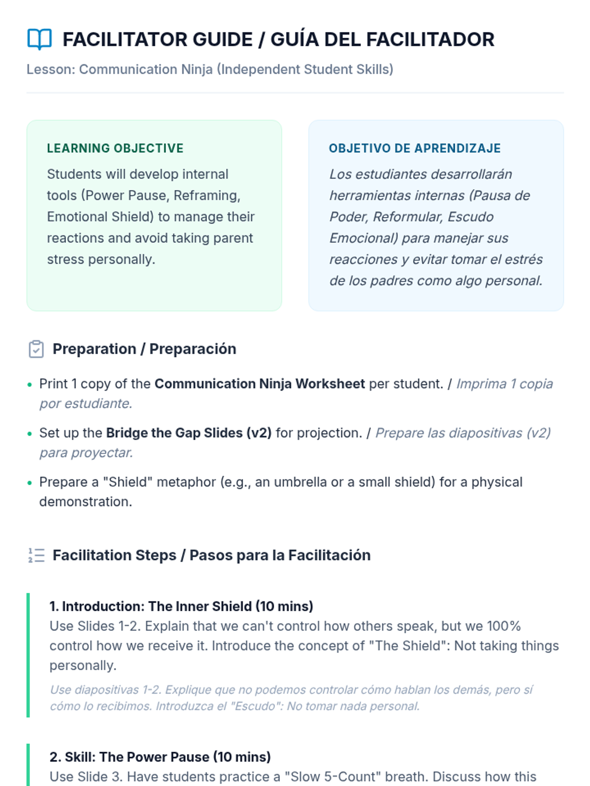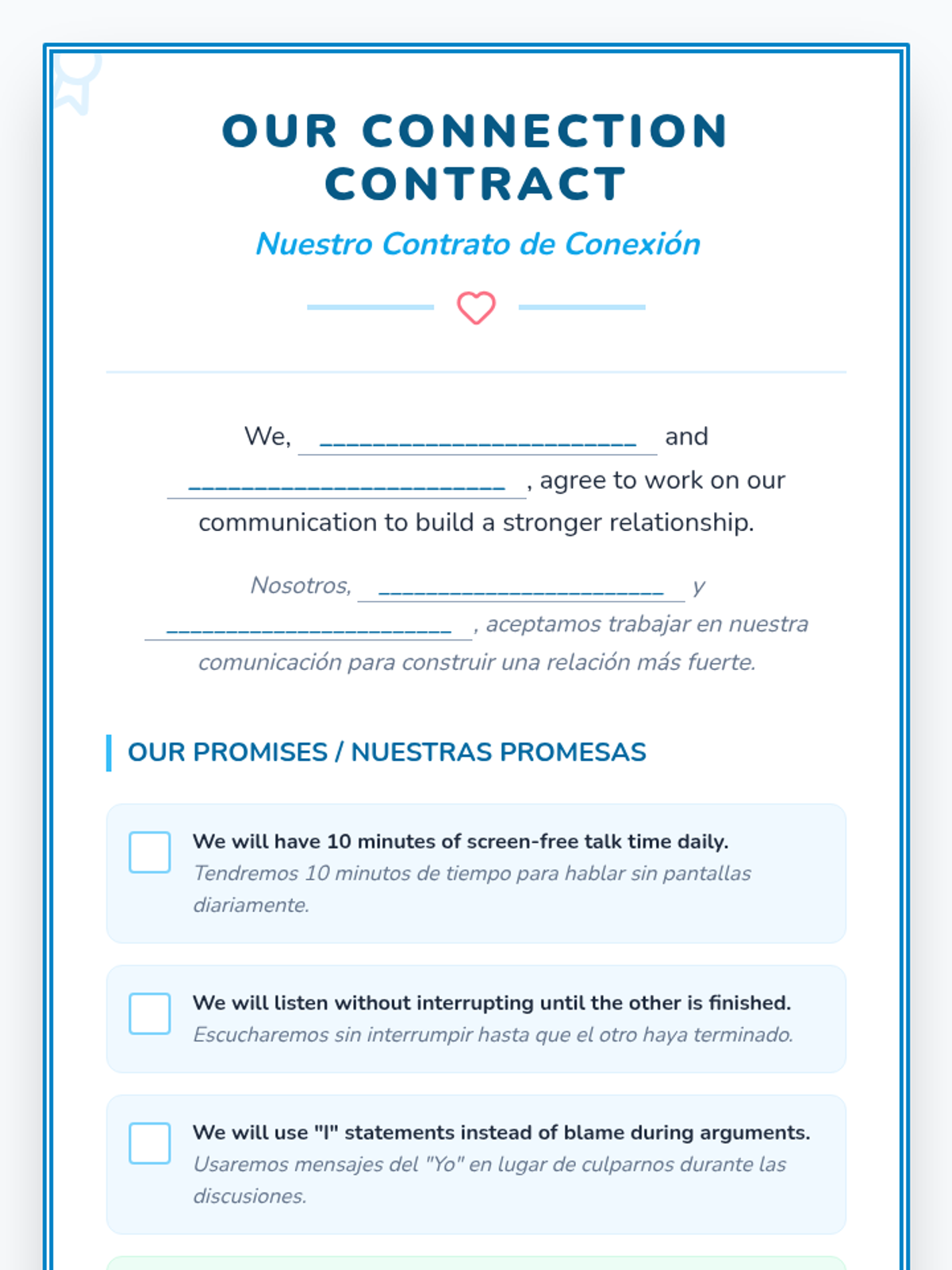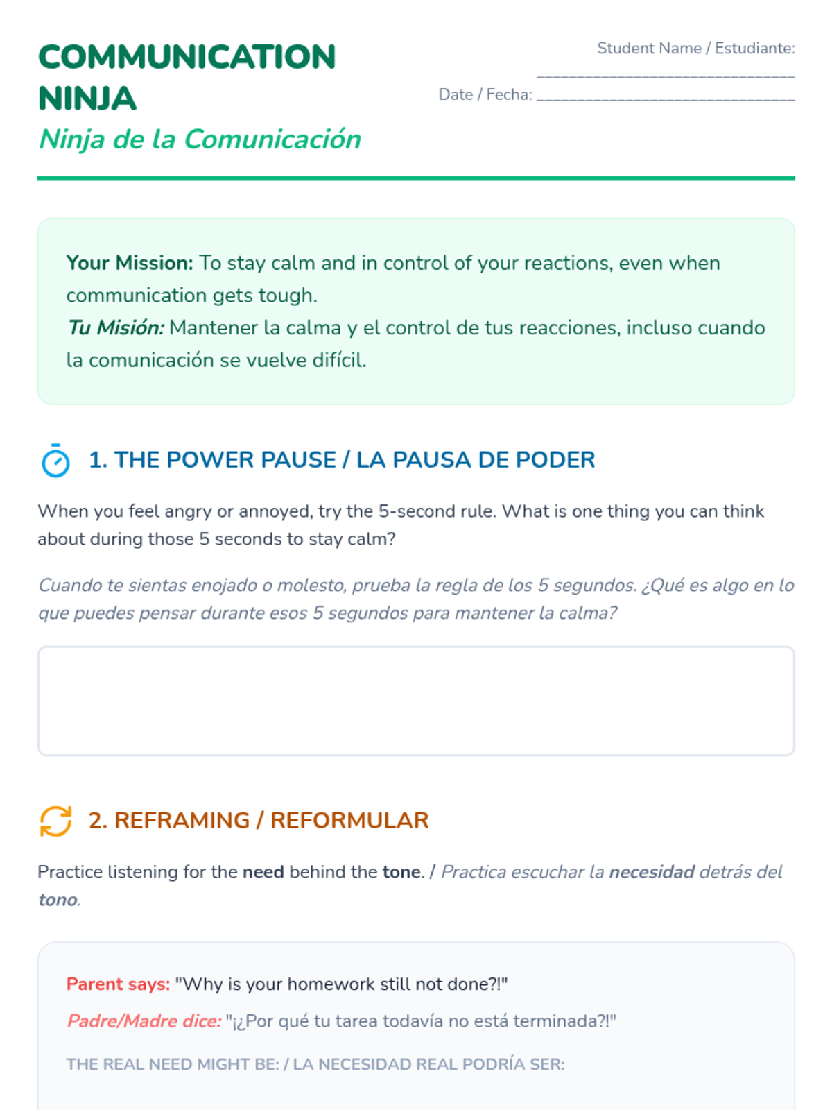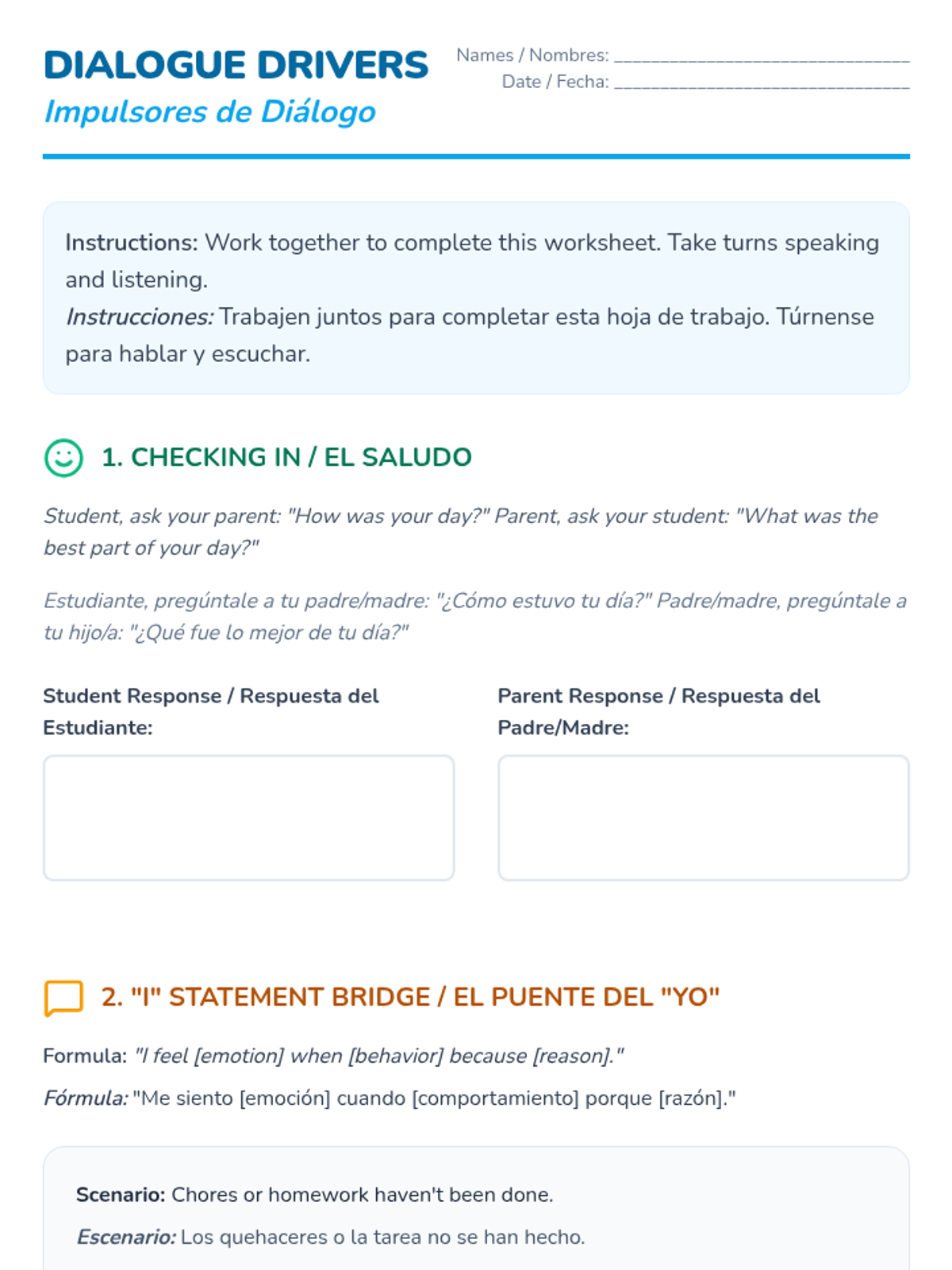 A bilingual lesson designed for 6th-grade students and their parents to improve communication through active listening and 'I' statements. Includes slides, a shared worksheet, a connection contract, and a facilitation guide.
