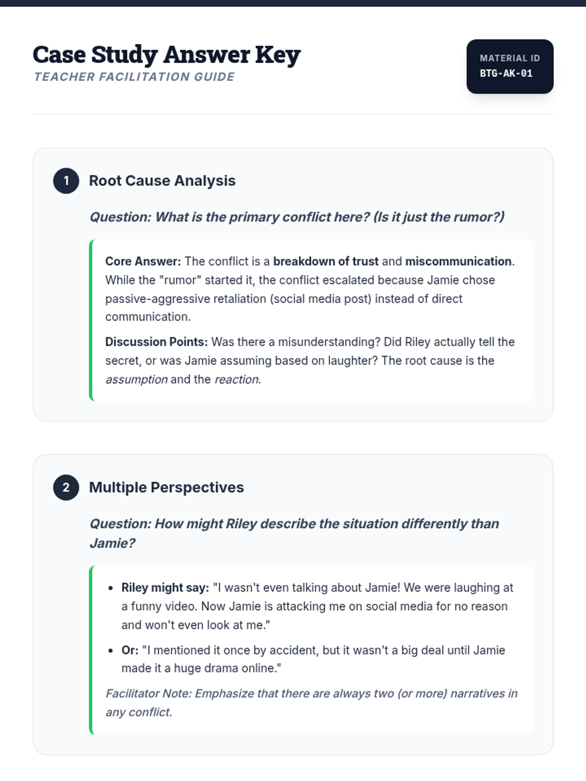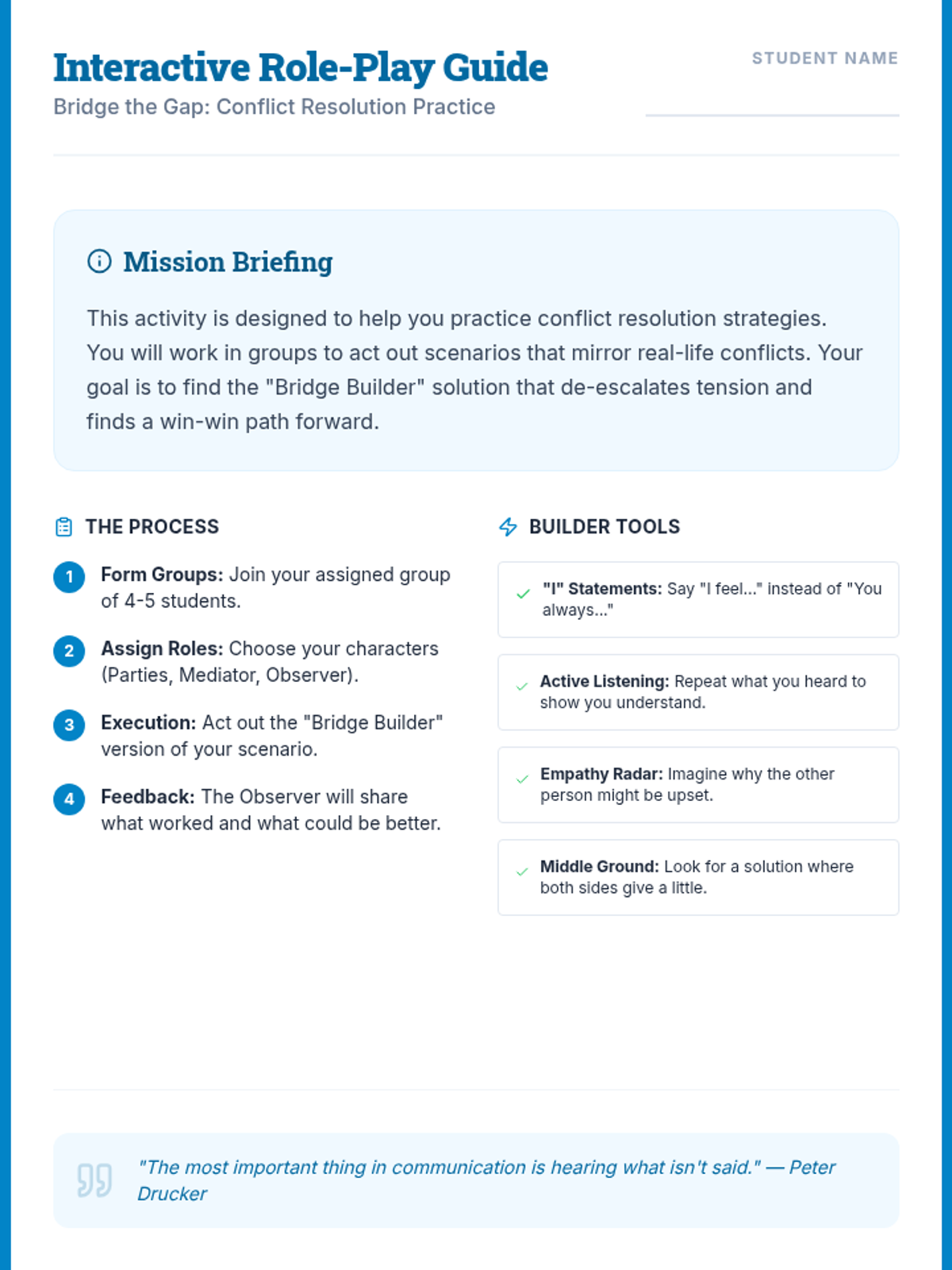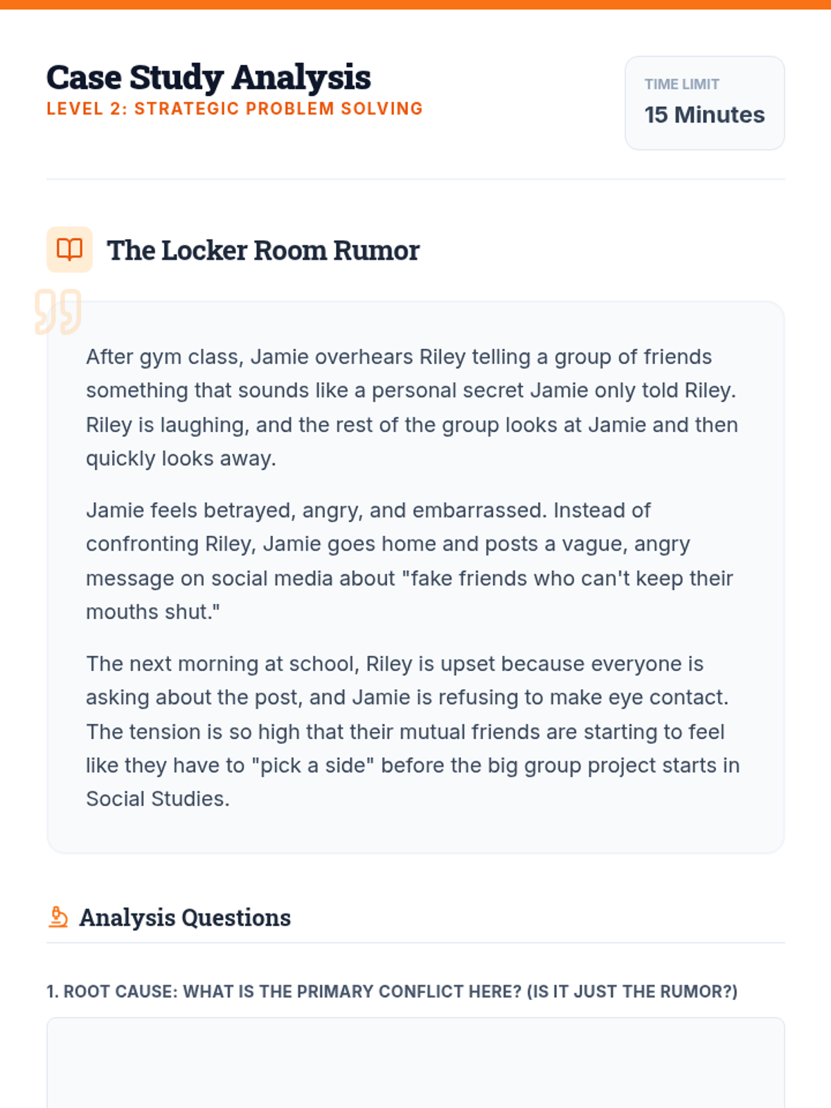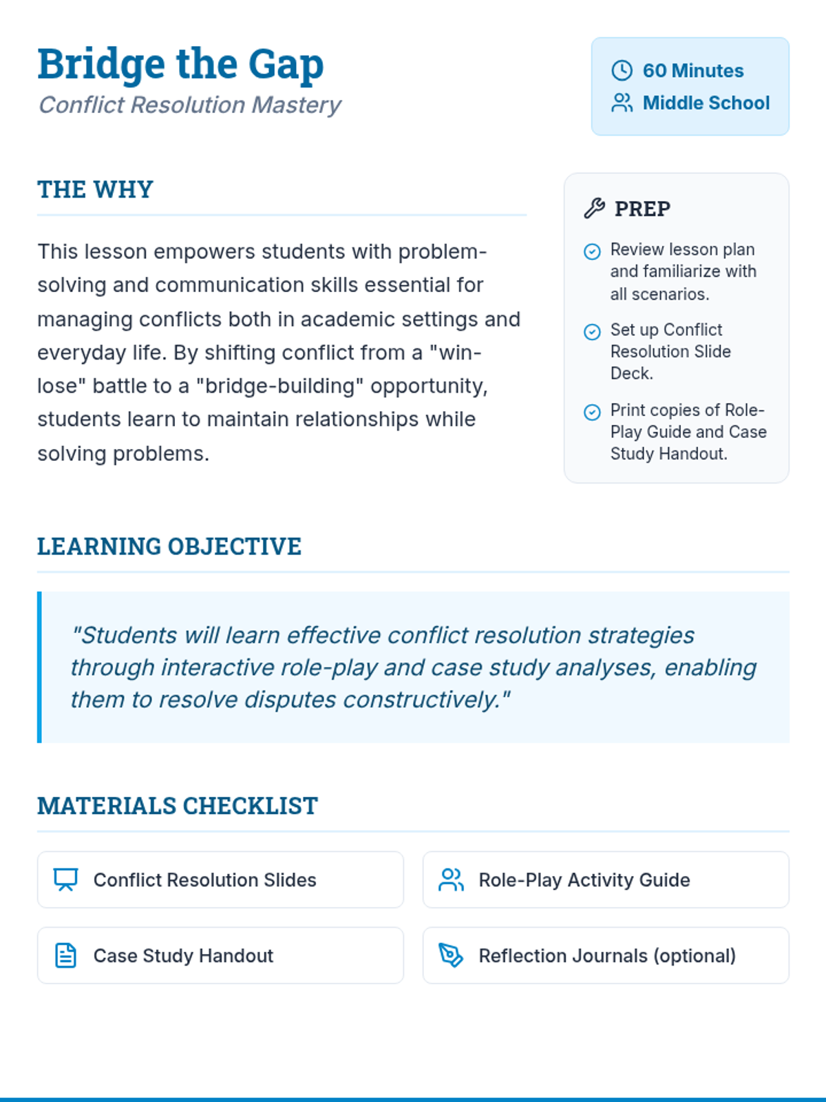 This 60-minute lesson empowers middle school students to transform conflicts into constructive conversations through interactive role-play and case study analysis. Students will develop essential communication, empathy, and problem-solving skills to navigate academic and personal conflicts effectively.