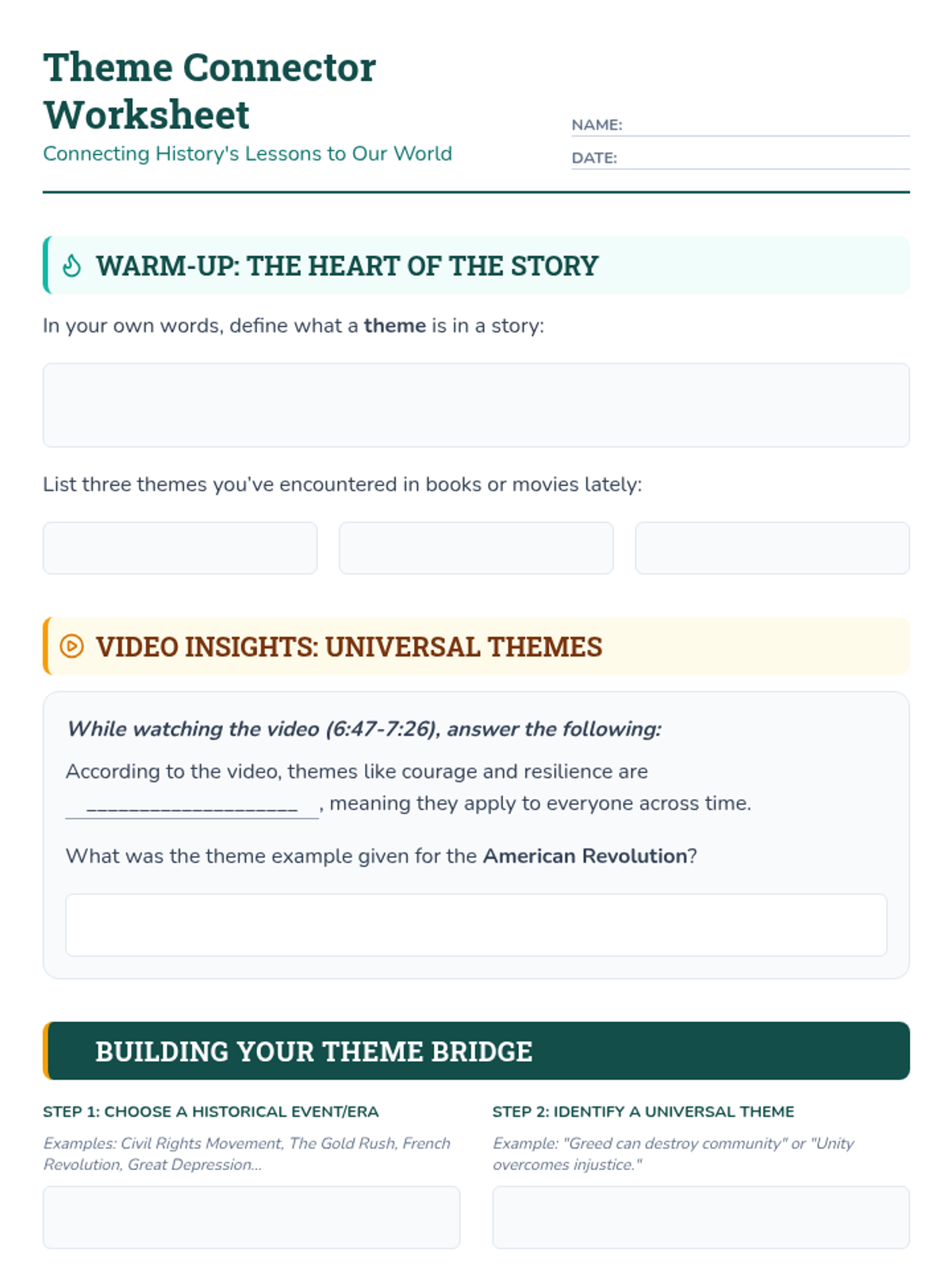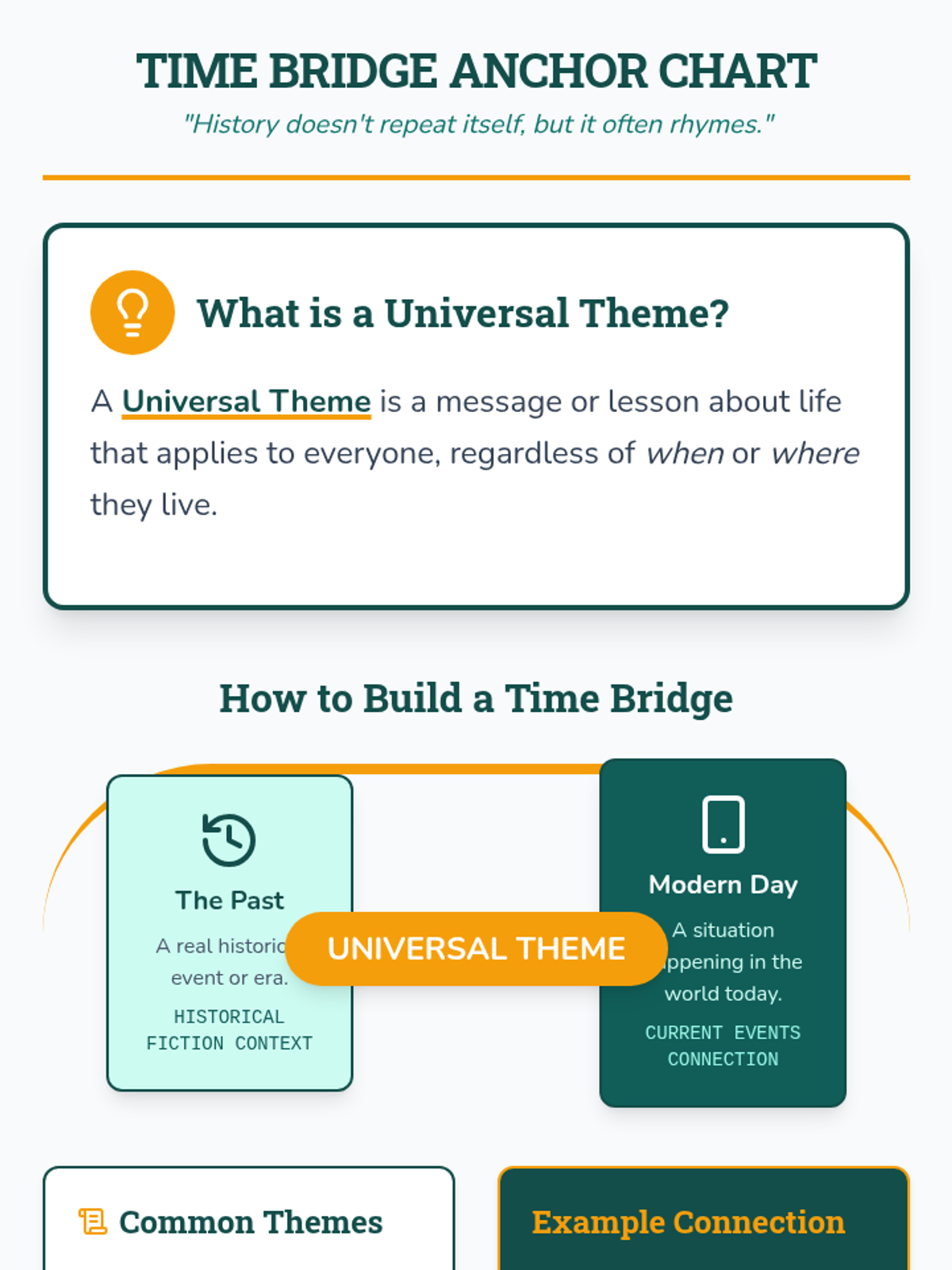Students will explore how historical fiction uses universal themes to connect the past and present. They will analyze specific historical events and their core messages to build a 'Theme Bridge' to modern-day situations.