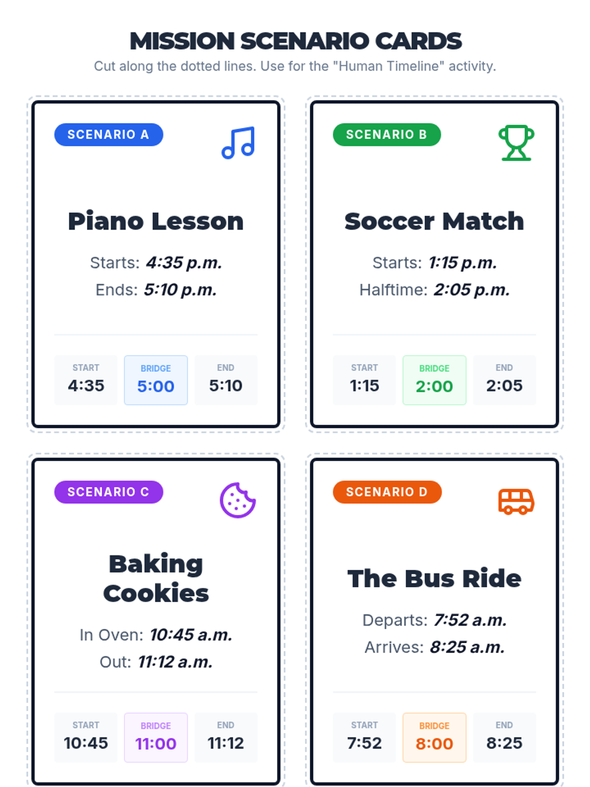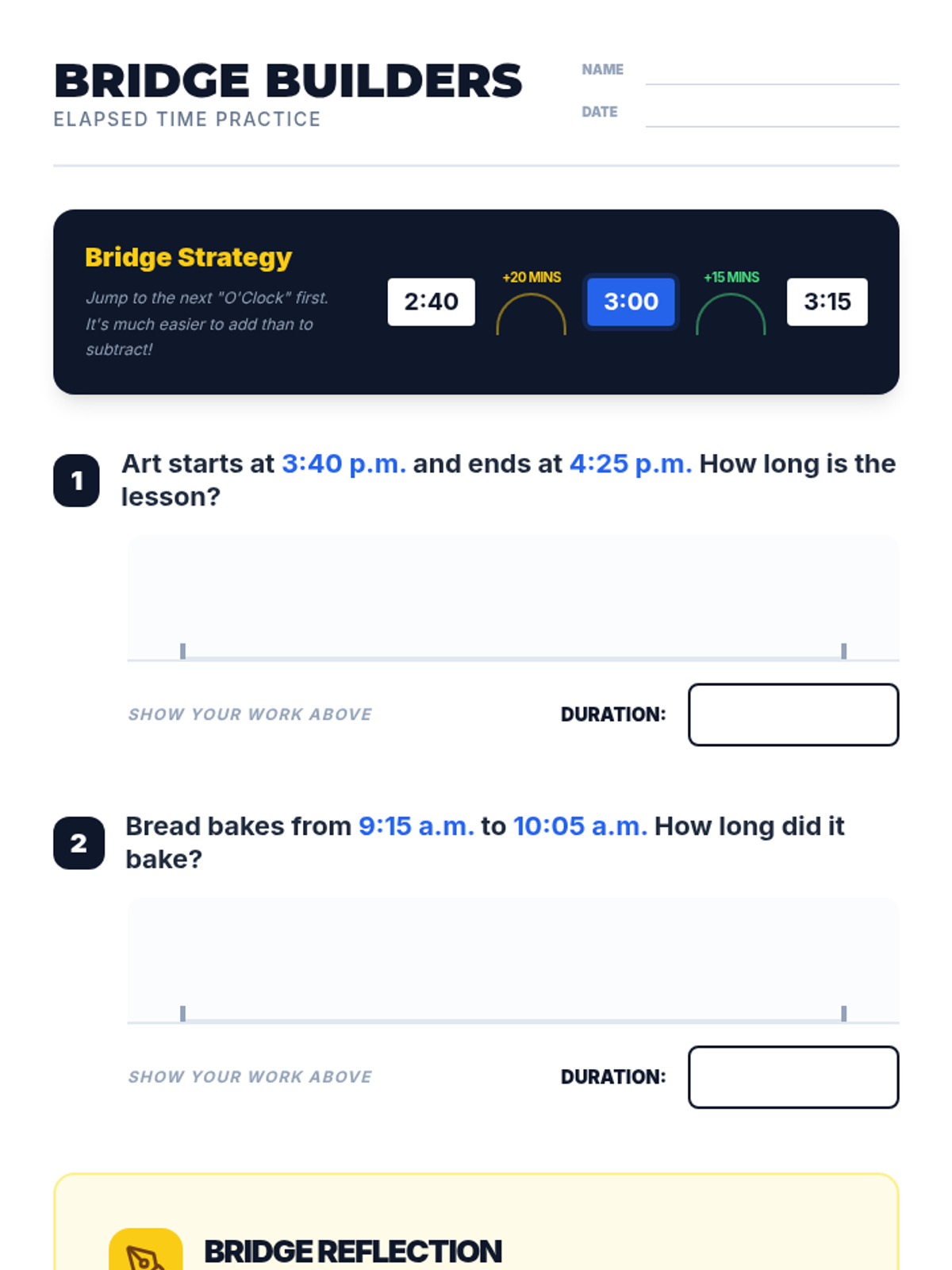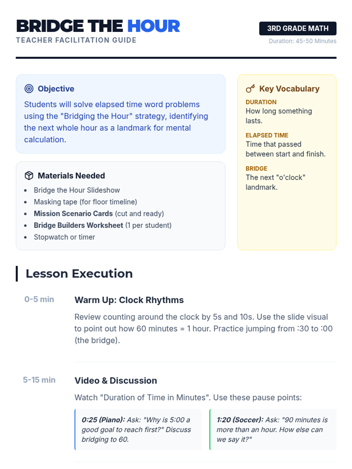 Students will learn the 'Bridging the Hour' strategy for elapsed time, using a video to visualize 'arcs' to the next hour and a physical 'Human Timeline' activity to build conceptual understanding.