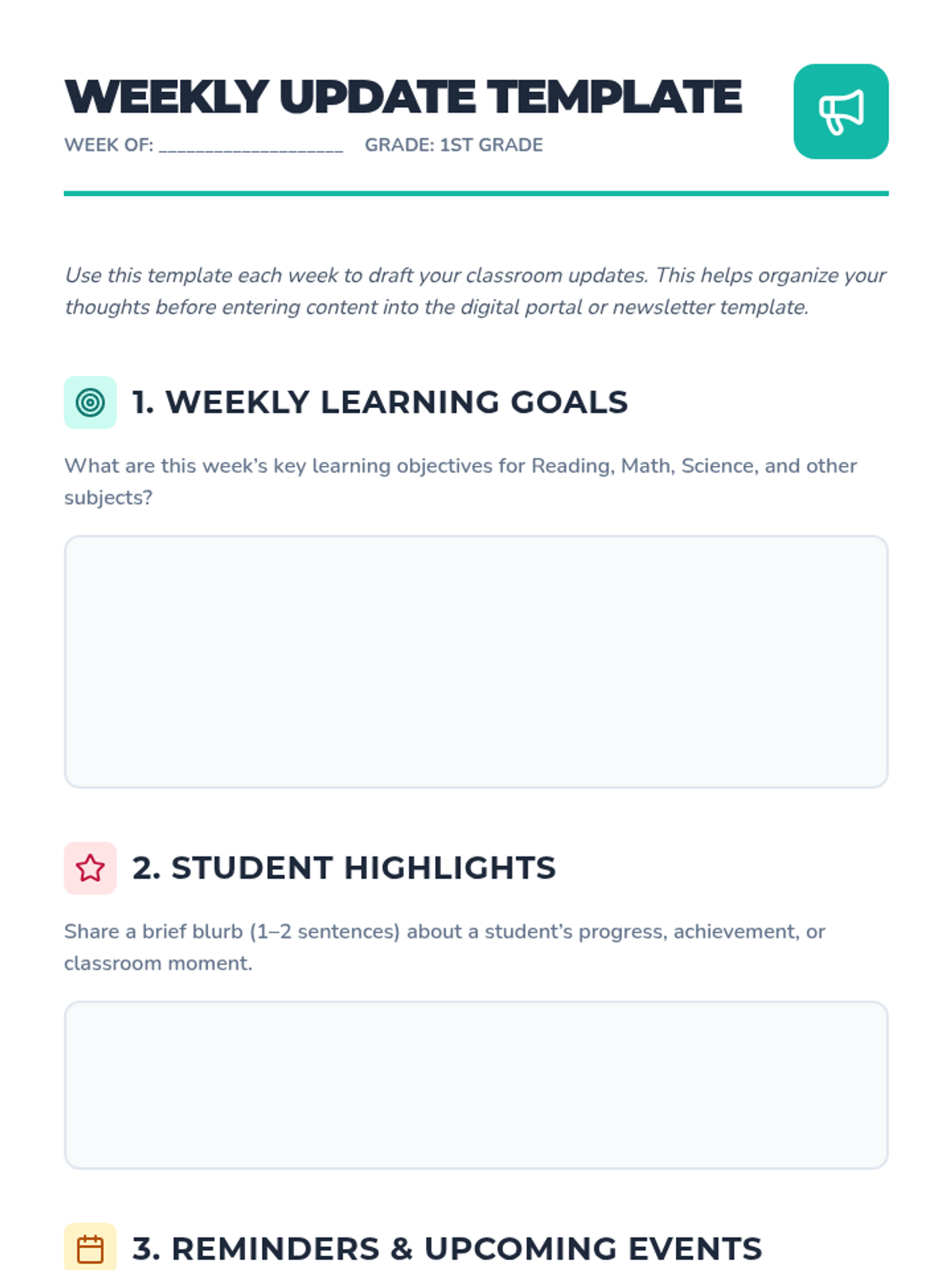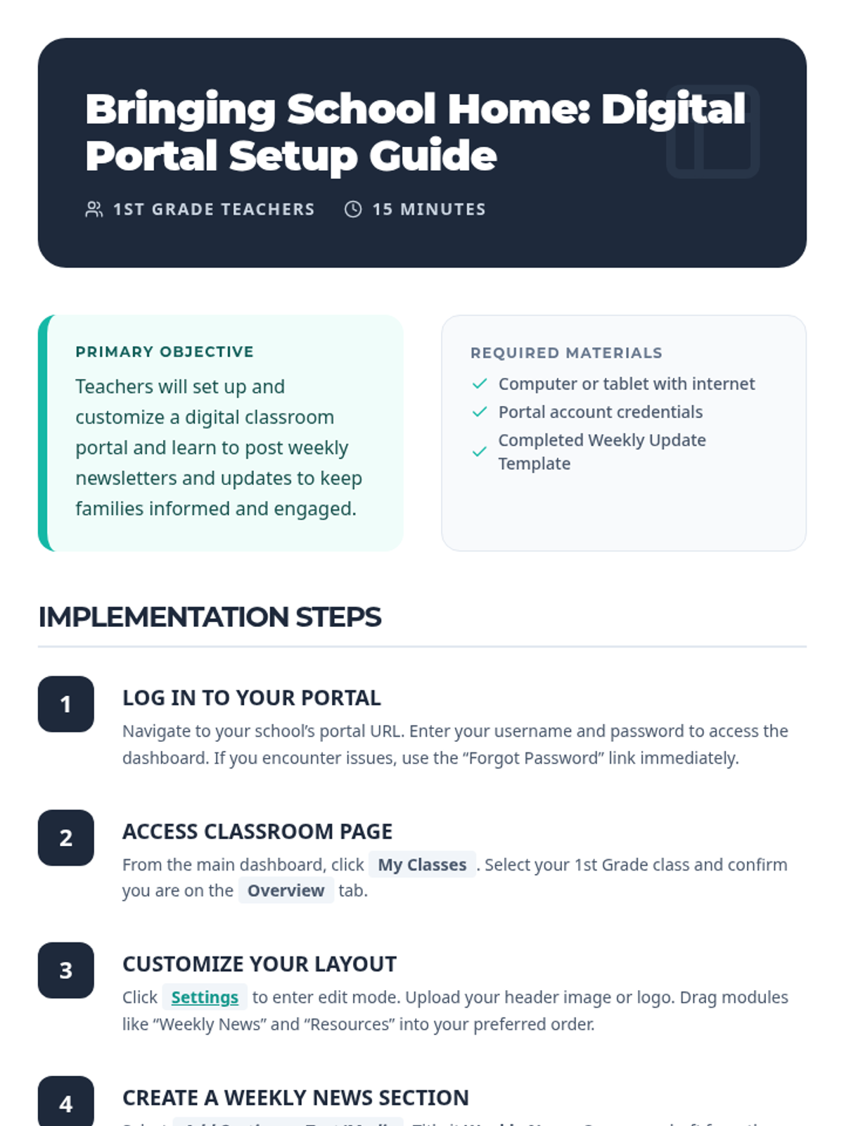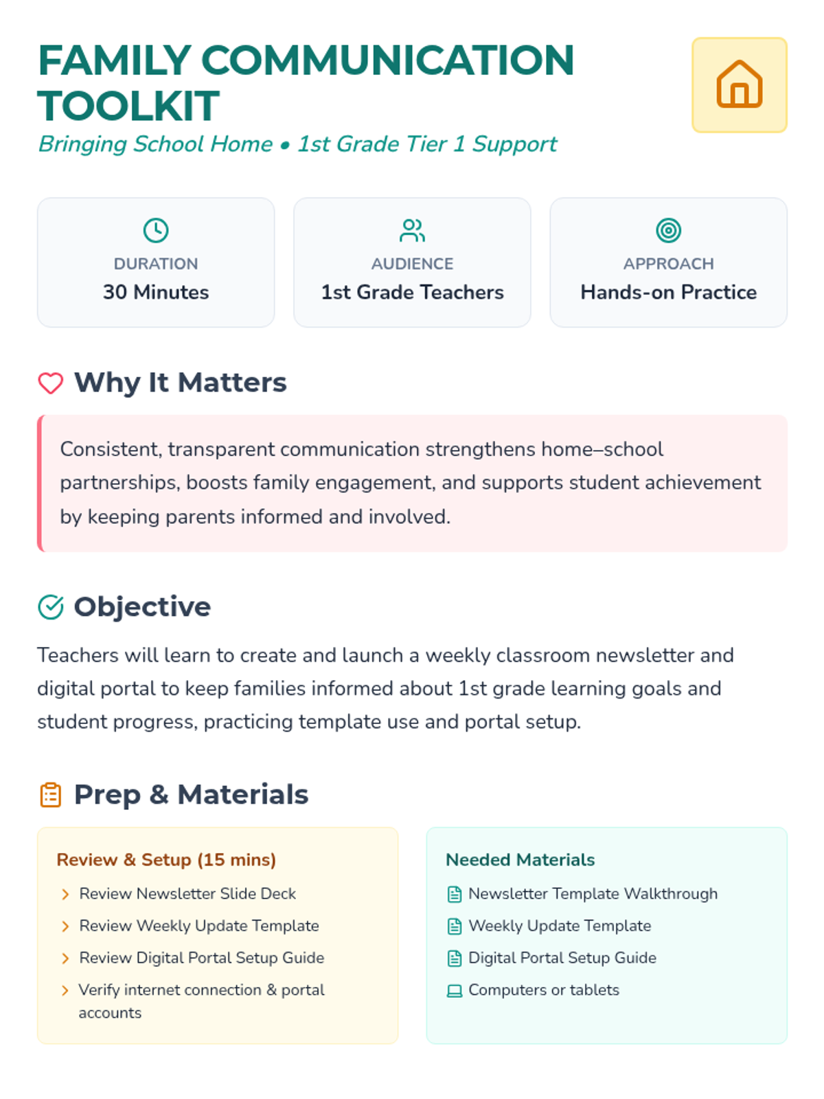 A concise toolkit helping teachers launch a weekly newsletter and digital portal to keep families informed about learning goals and student progress. This lesson supports 1st Grade educators in building strong family engagement through clear communication channels in a 30-minute weekly session.