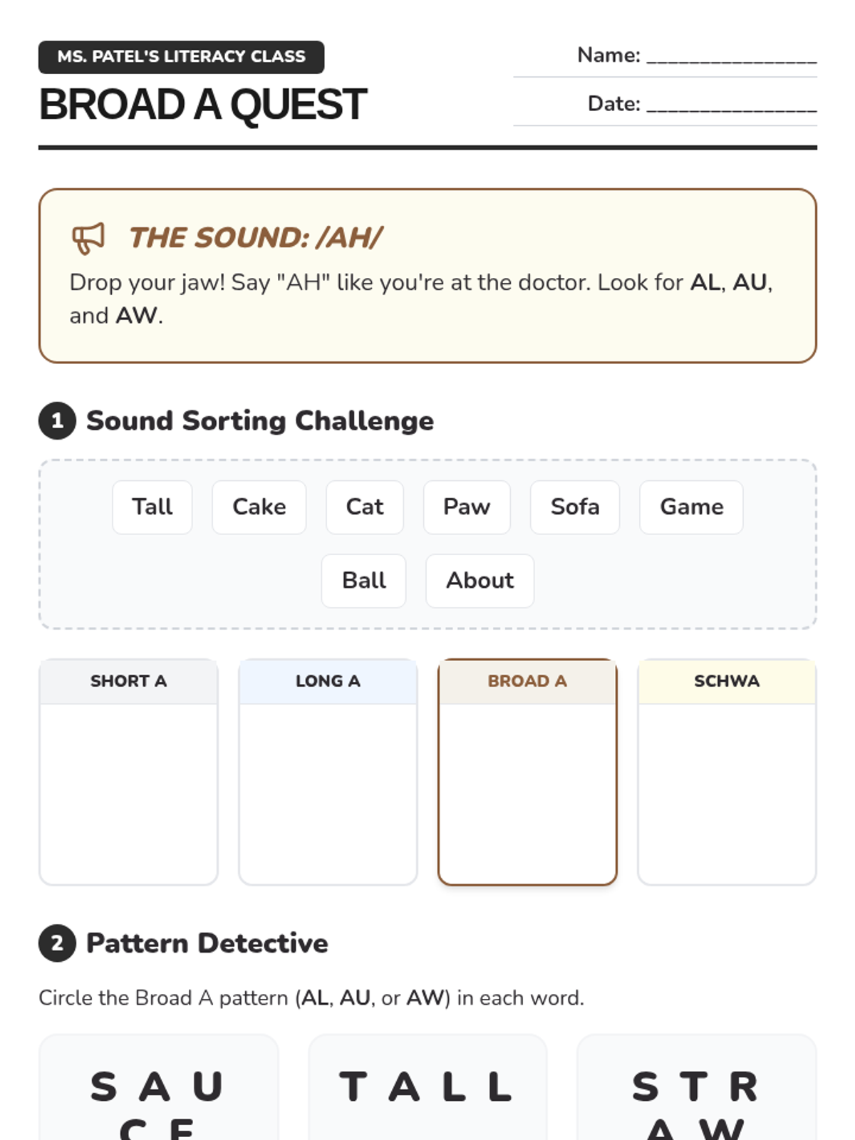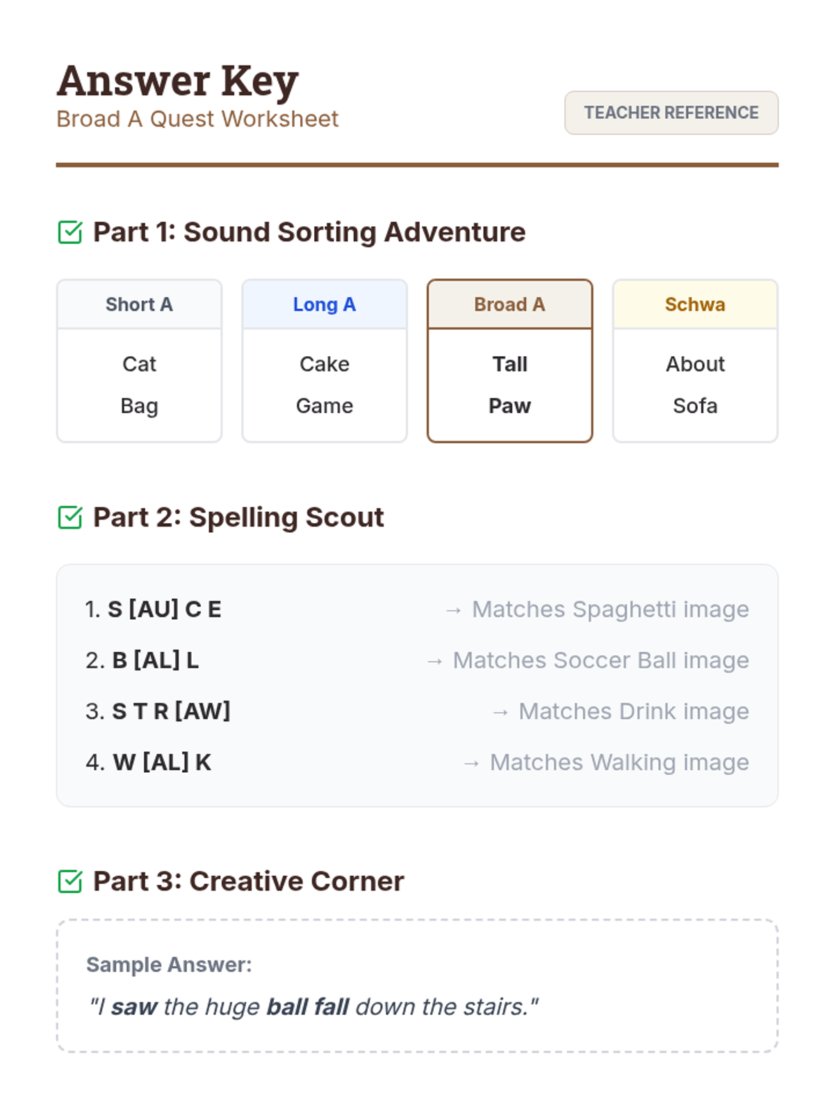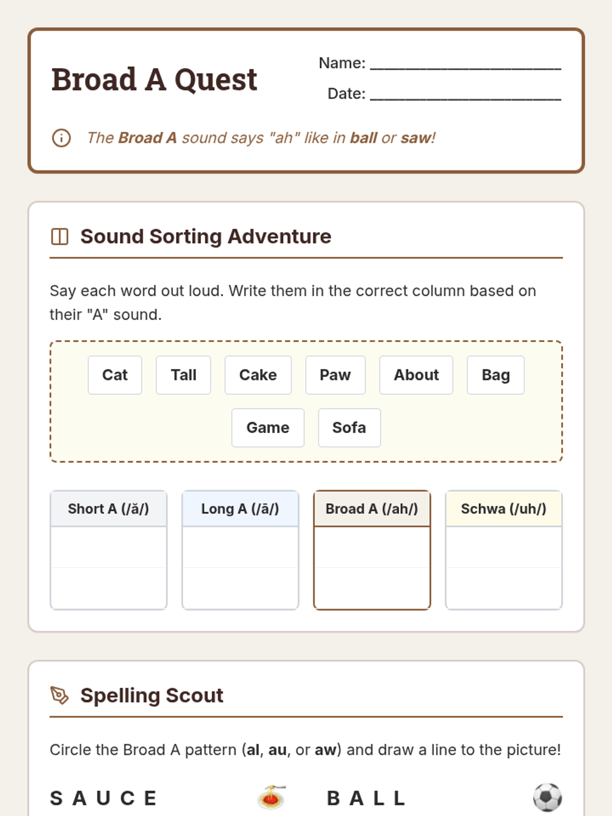 A comprehensive guide to the Broad A vowel sound, distinguishing it from short, long, and schwa sounds through phonics patterns like 'al', 'aw', and 'au'.