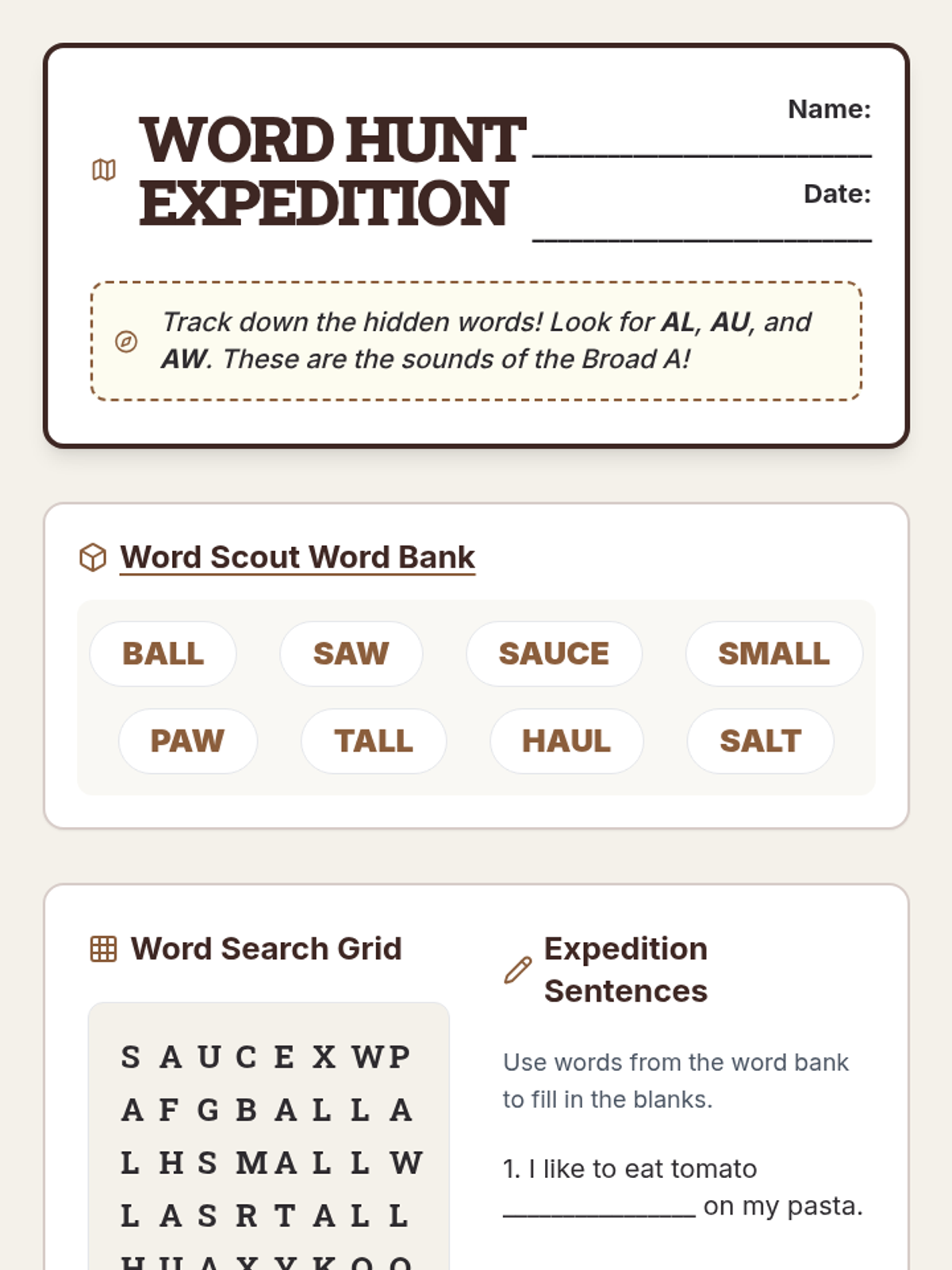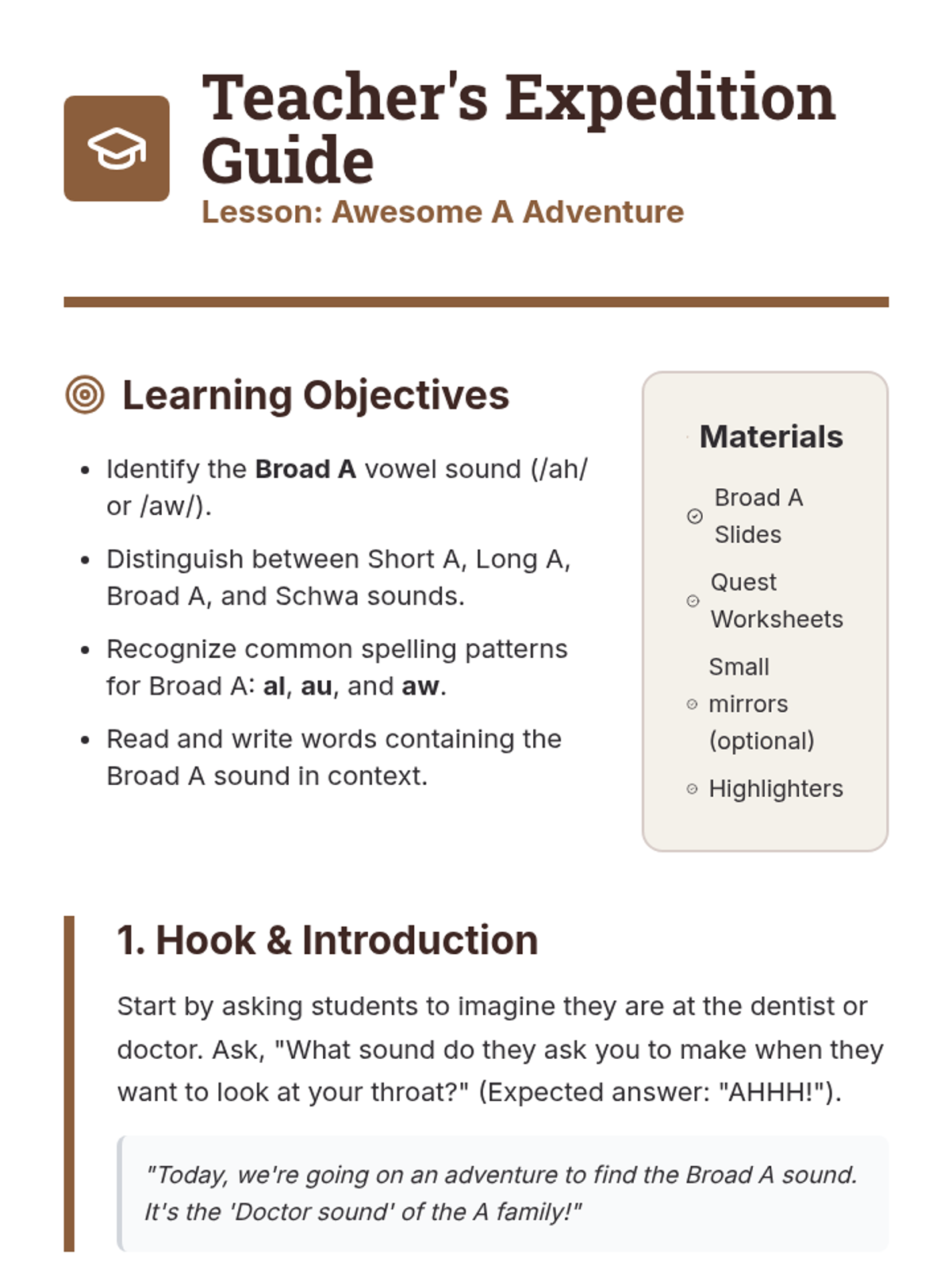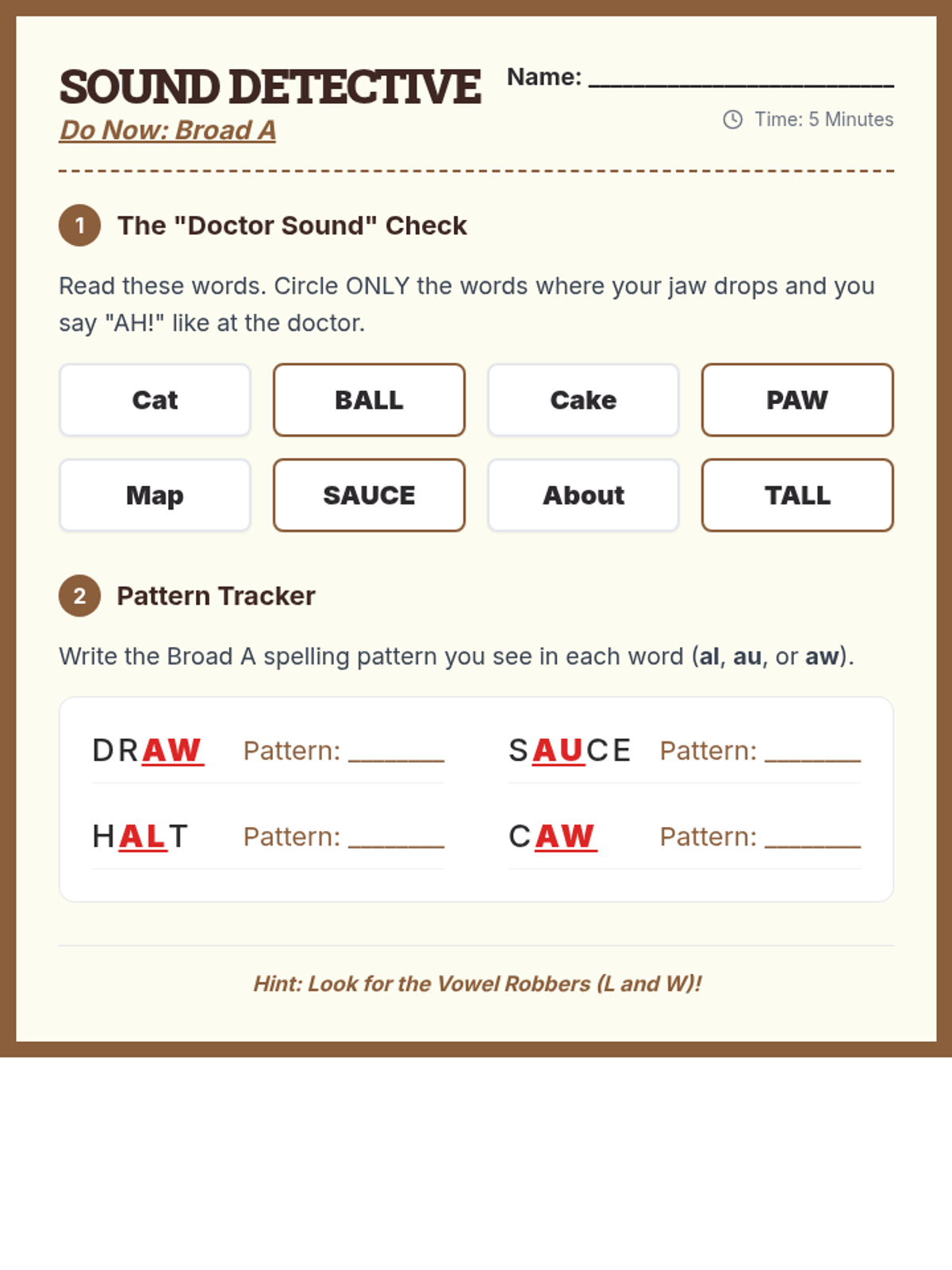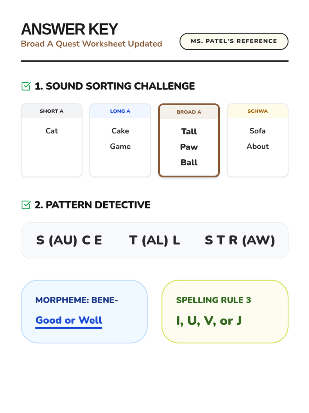 A comprehensive guide to the Broad A vowel sound, distinguishing it from short, long, and schwa sounds through phonics patterns like 'al', 'aw', and 'au'.