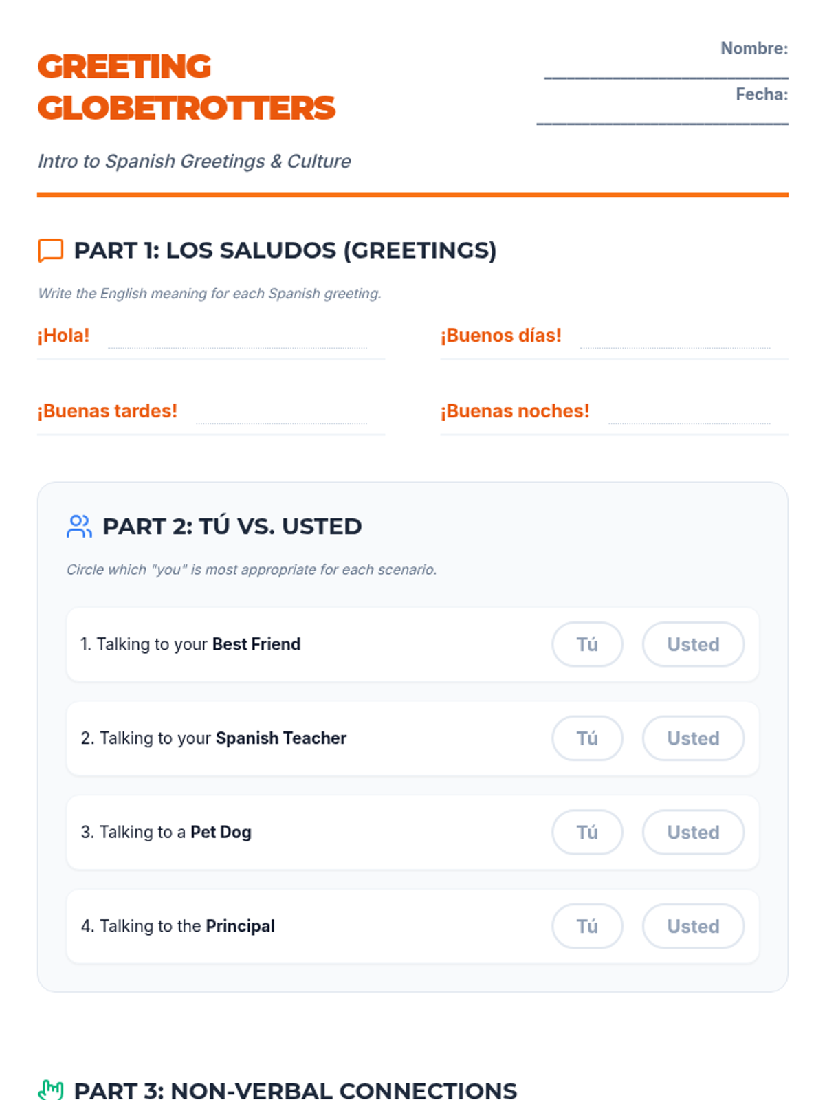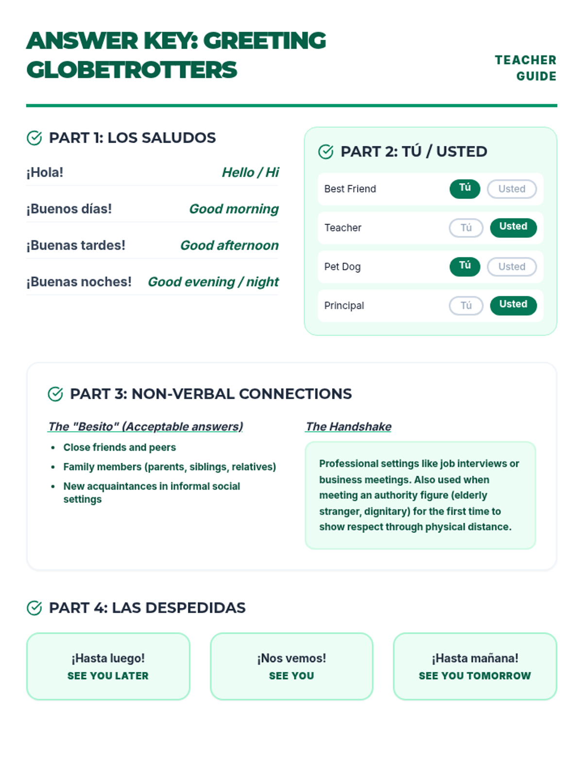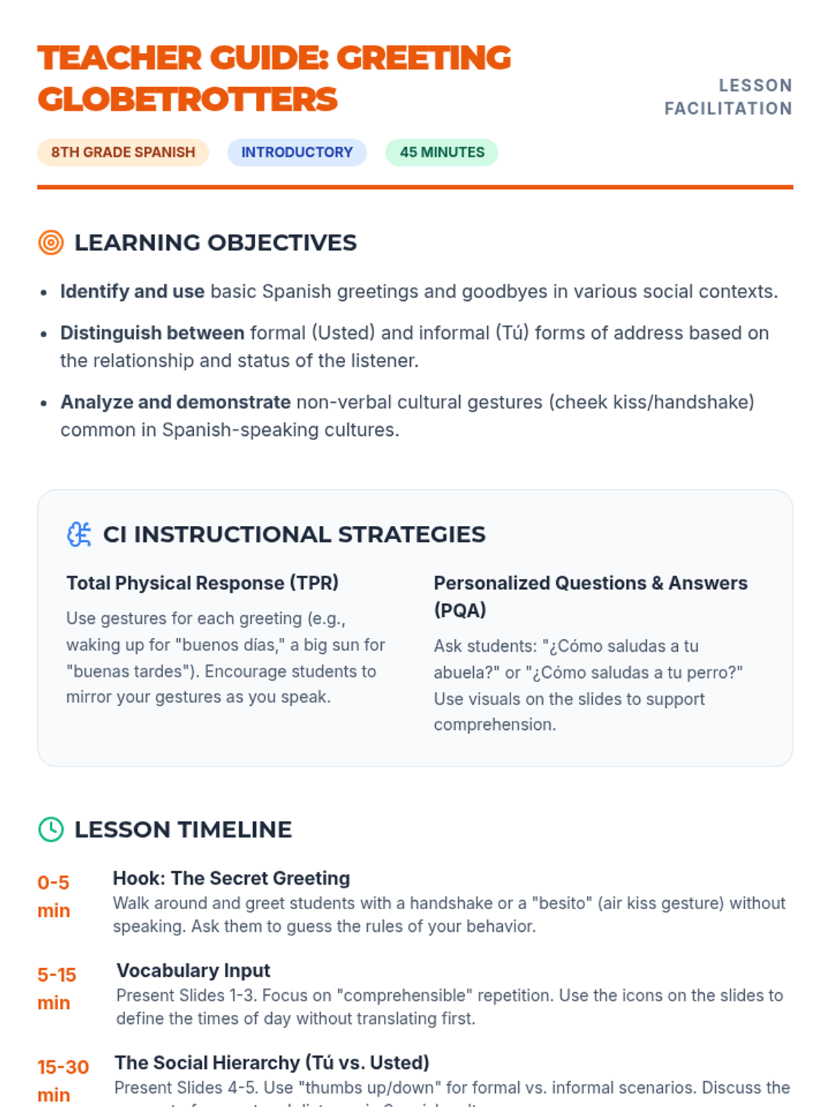 An introductory lesson for 8th grade Spanish beginners focused on greetings, goodbyes, and cultural gestures using Comprehensible Input (CI) strategies. Students will distinguish between formal and informal contexts and learn traditional non-verbal greetings like the 'besito'.