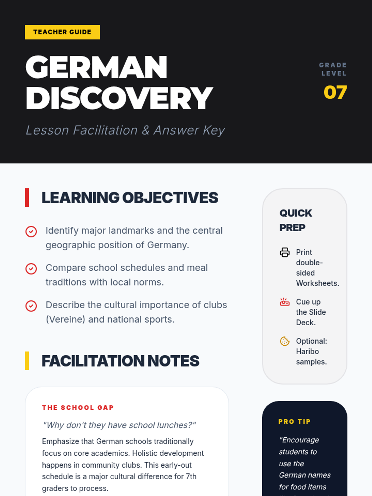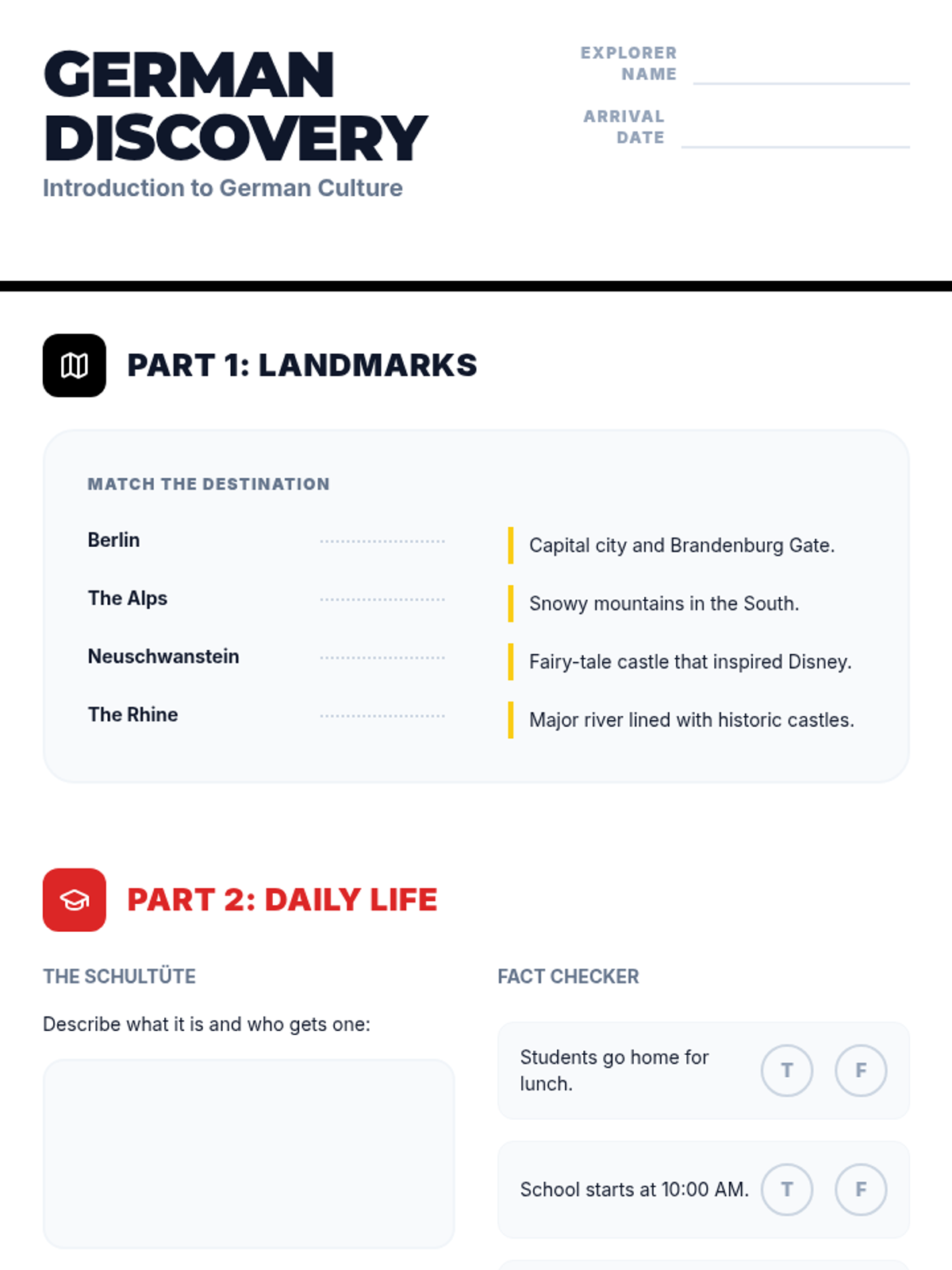 An introductory exploration of German culture for 7th graders, covering daily life, traditions, geography, and leisure activities. Students will compare their own lives with those of German teenagers.