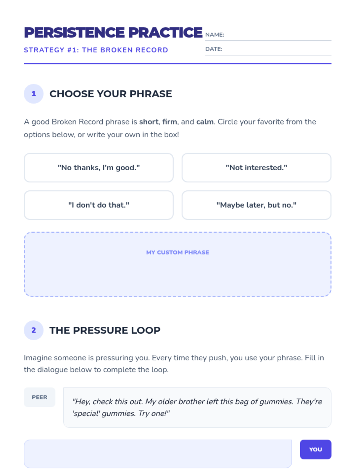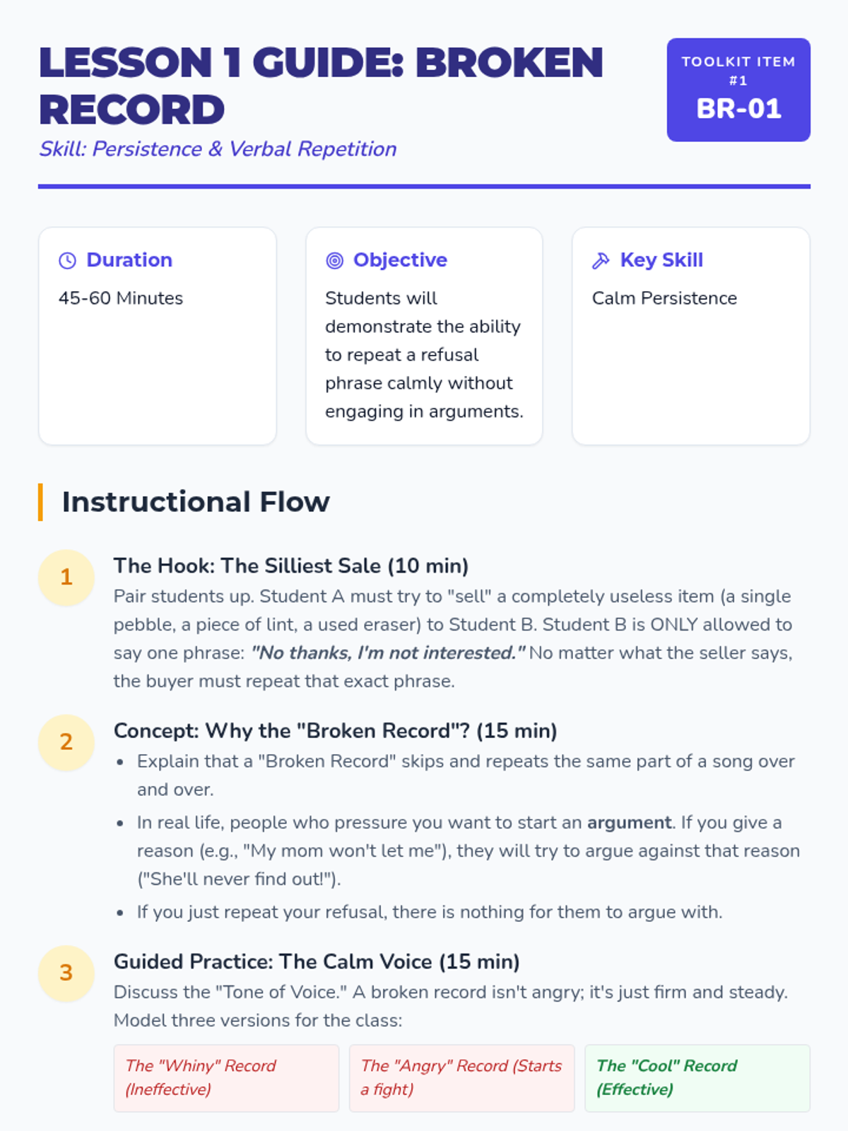 Students learn the 'Broken Record' strategy: repeating a calm refusal without arguing. They practice persistence through a low-stakes sales game.