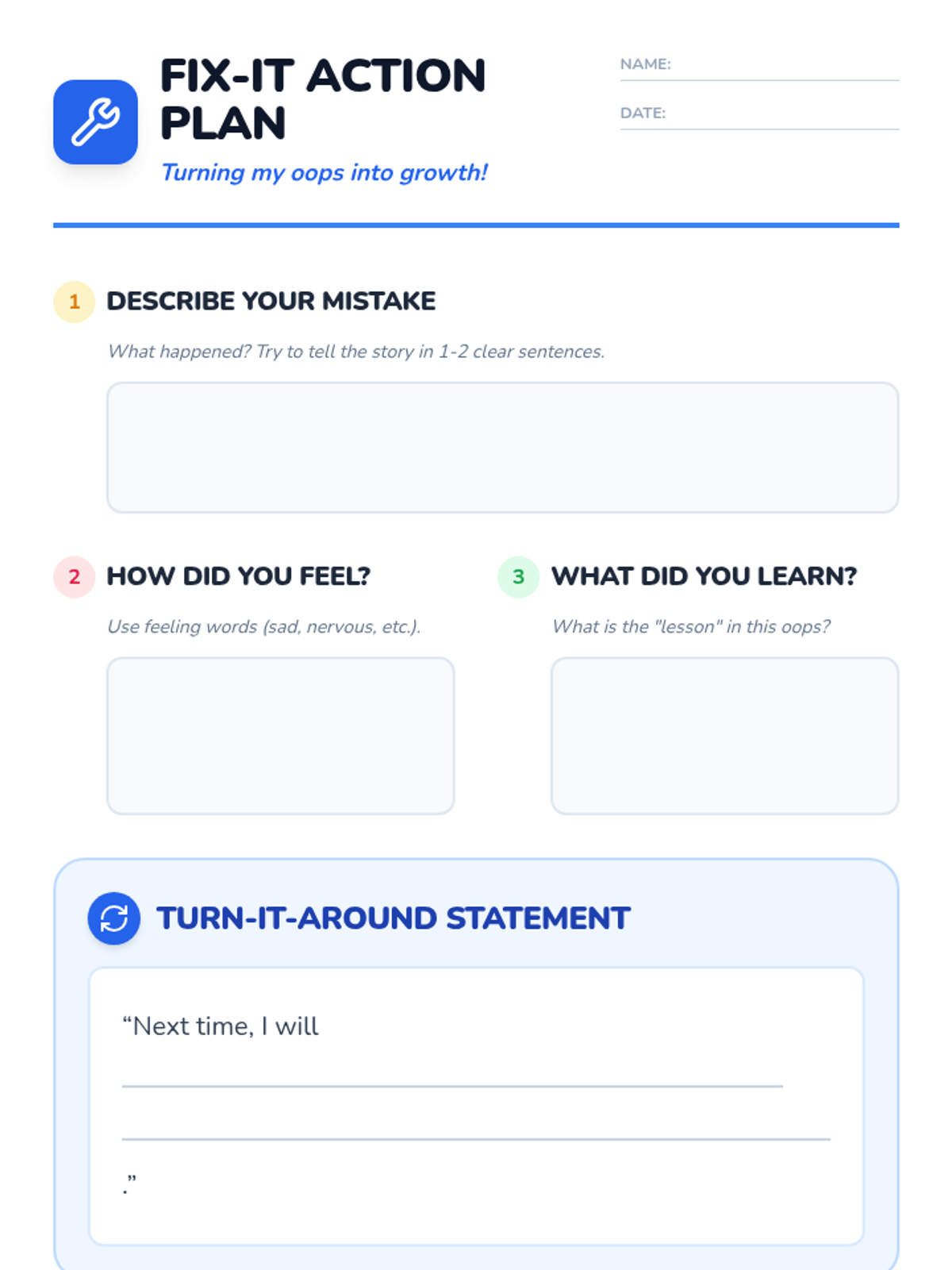A restorative practice resource designed to help fourth-grade students reflect on classroom disruptions, identify emotions, and plan better choices for the future.