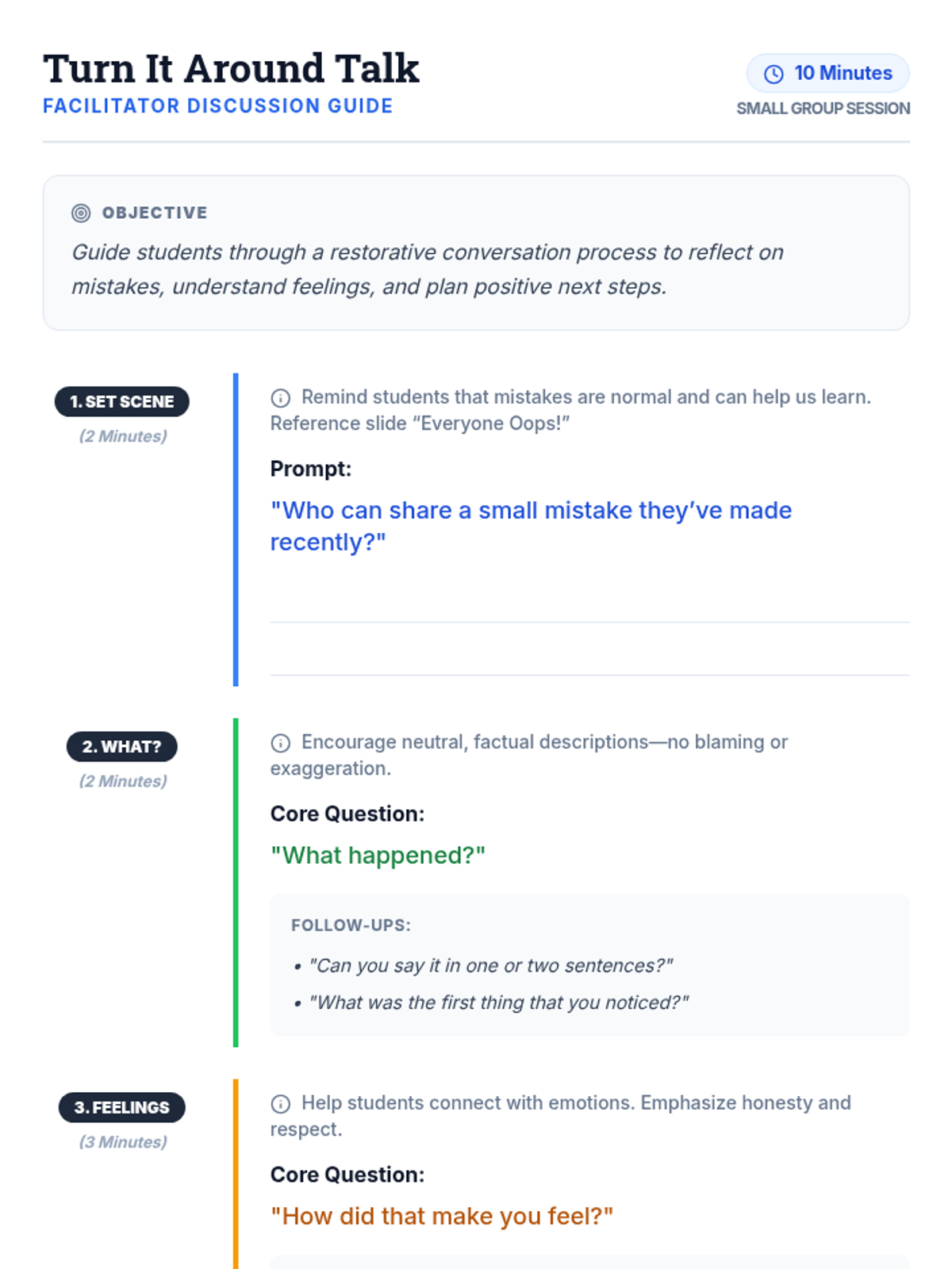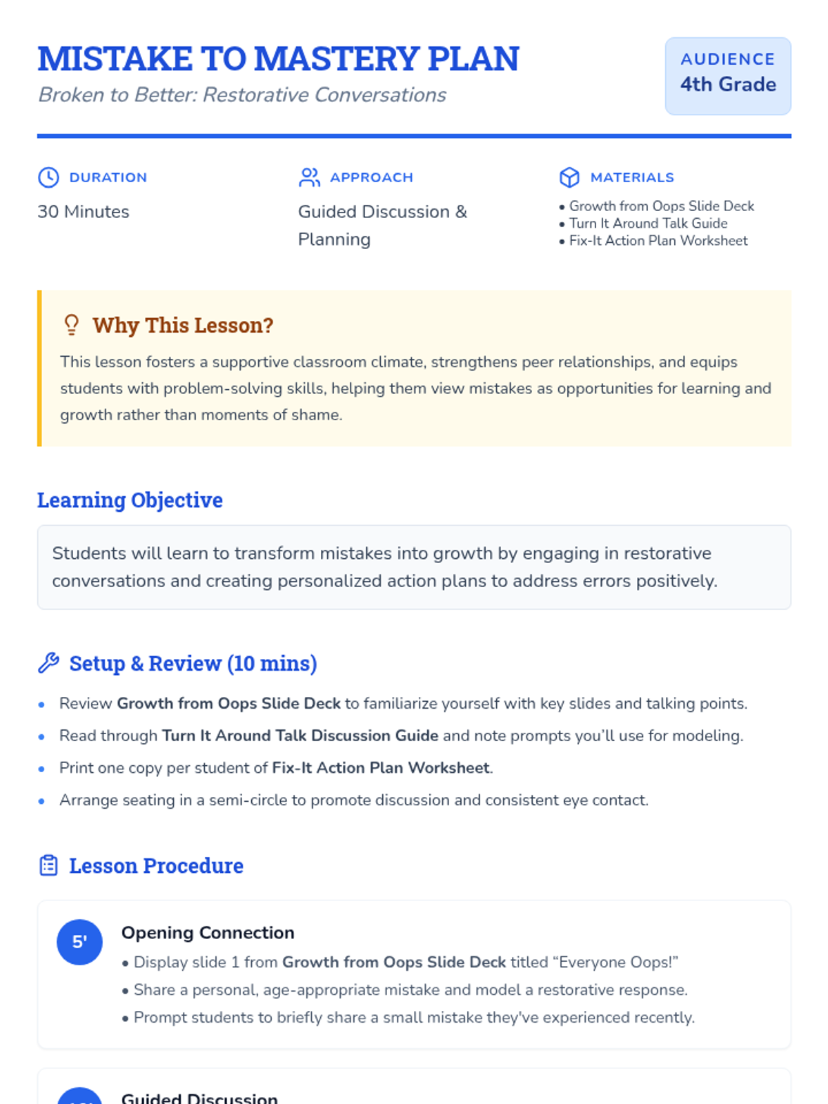 A 30-minute Tier 2 SEL lesson for 4th graders focused on restorative conversations and transforming mistakes into learning opportunities through guided discussion and action planning.