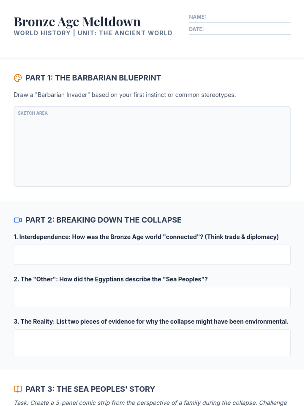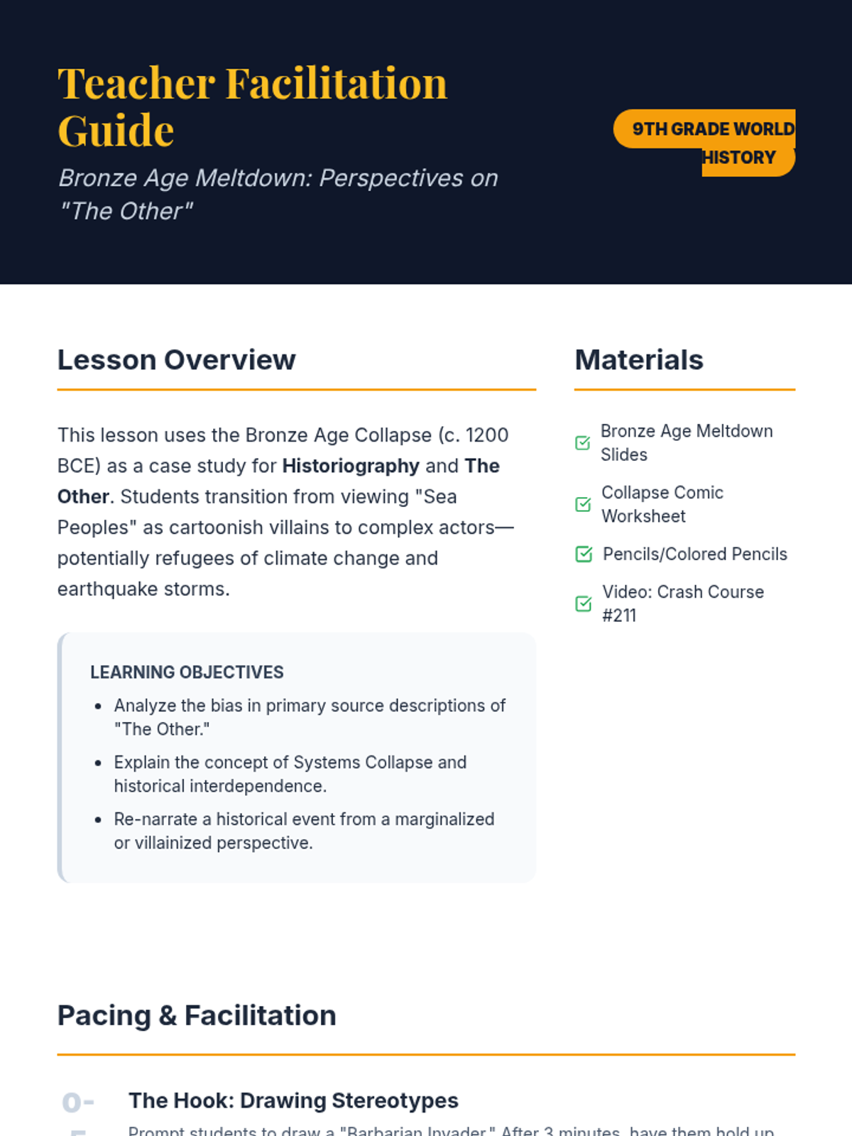 A 9th-grade world history lesson exploring the concept of 'The Other' through the lens of the Sea Peoples and the Bronze Age Collapse. Students analyze historical bias, transition from viewing 'barbarians' as villains to potential refugees, and create a narrative comic strip based on evidence from the Crash Course World History series.