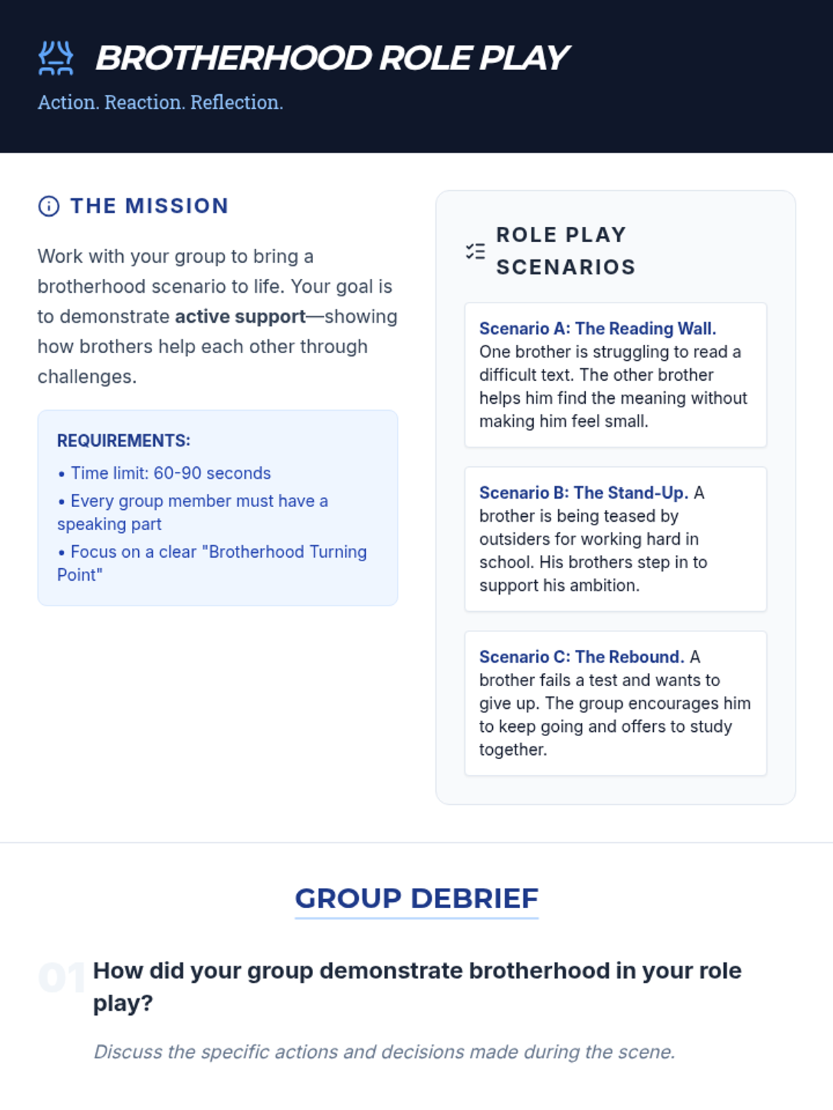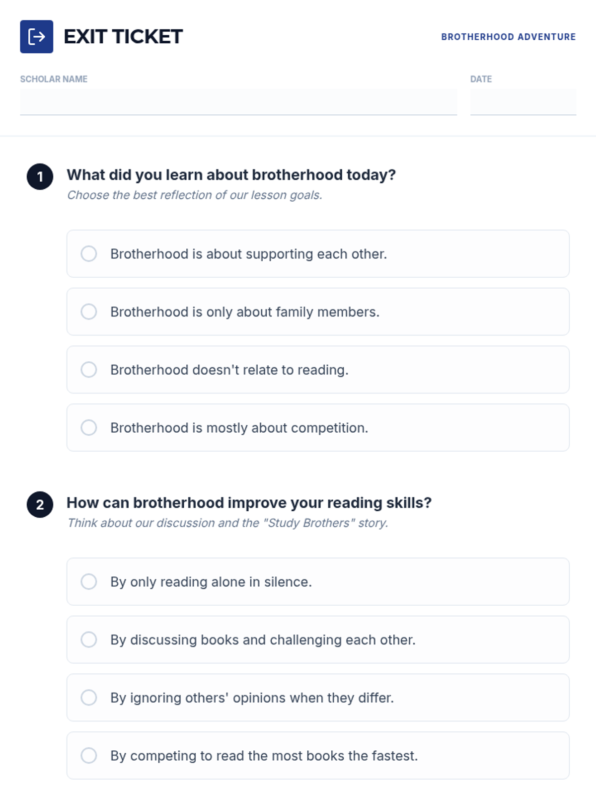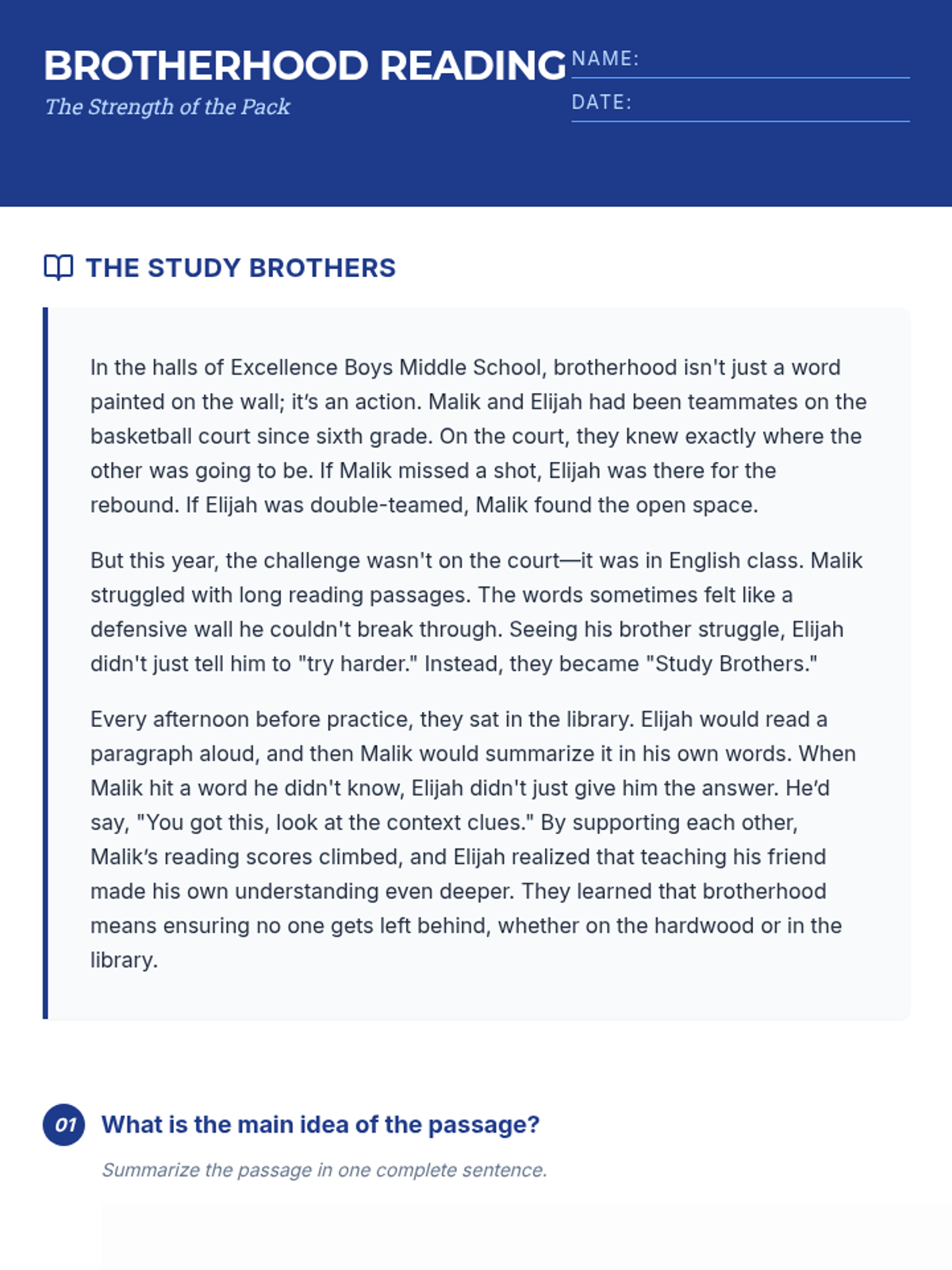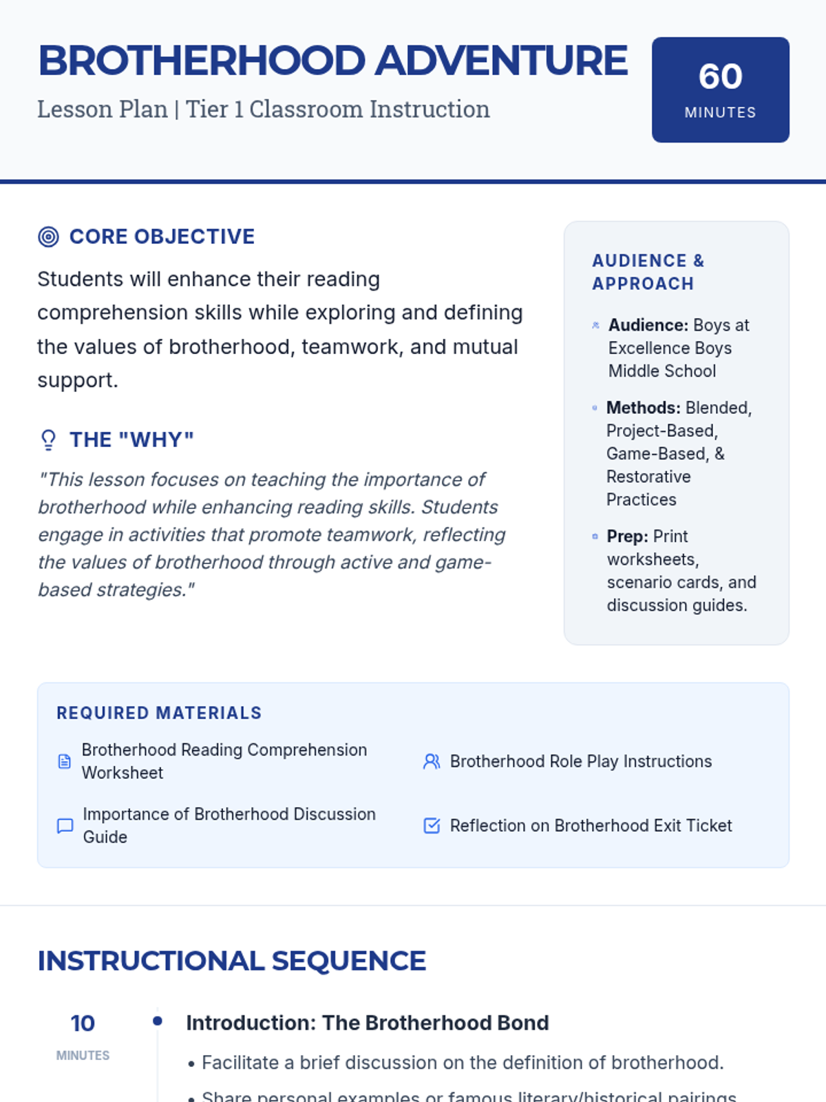 A middle school lesson designed for Excellence Boys, focusing on the intersection of literacy and brotherhood. Students explore how supporting one another enhances both their community and their reading skills through comprehension, role-play, and reflective discussion.