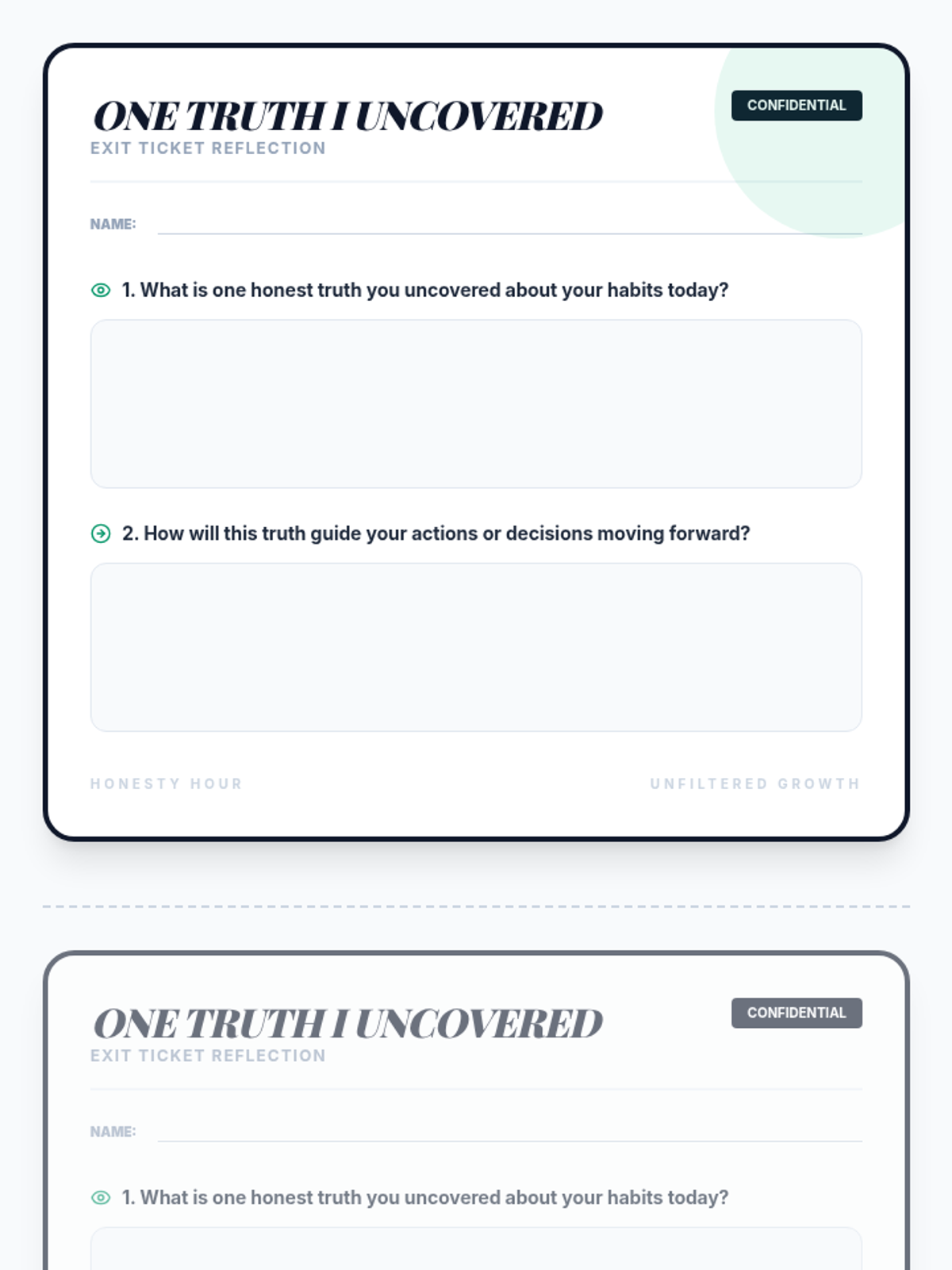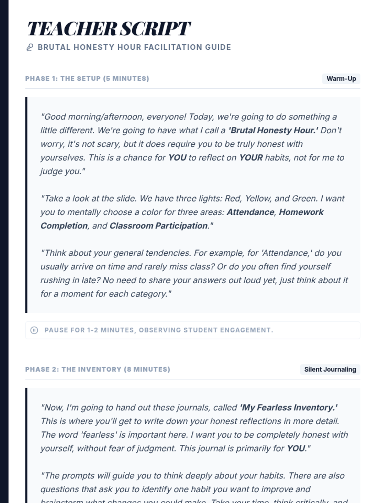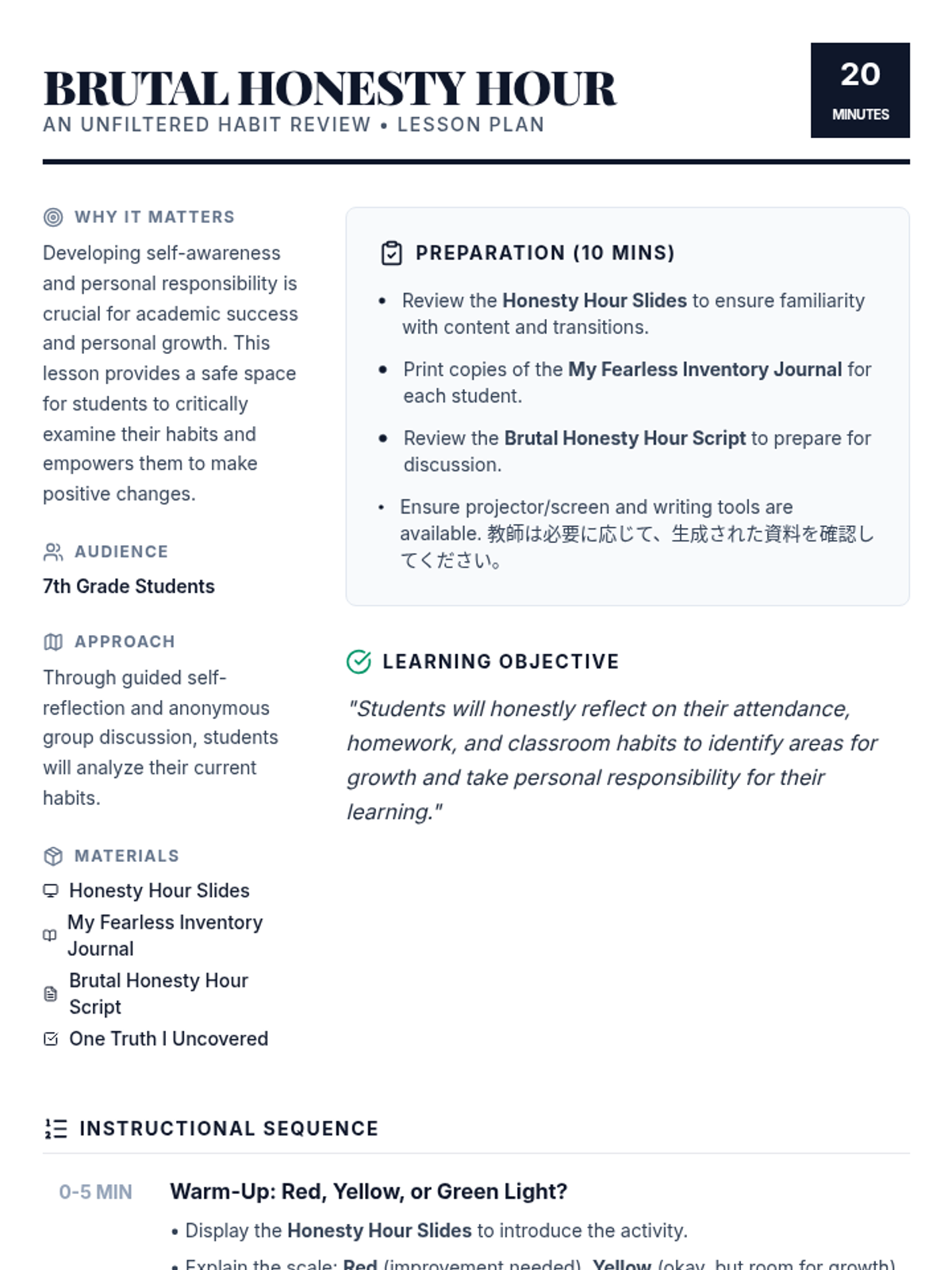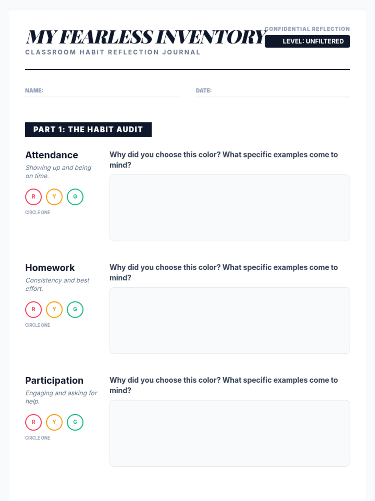 A 20-minute self-reflection session for 7th graders to critically and honestly evaluate their attendance, homework, and participation habits. Students use a 'fearless inventory' approach to identify personal growth areas without judgment.