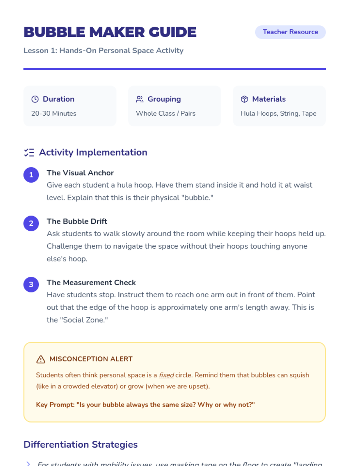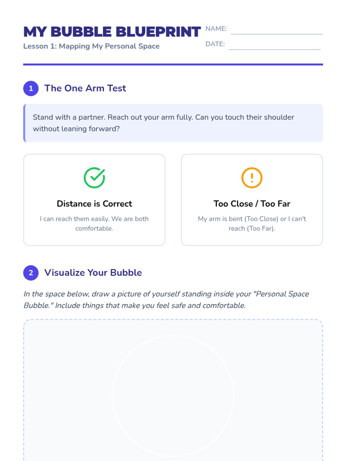 Students use visual aids like hula hoops to define their 'personal space bubble' and learn the fundamental arm's-length rule.