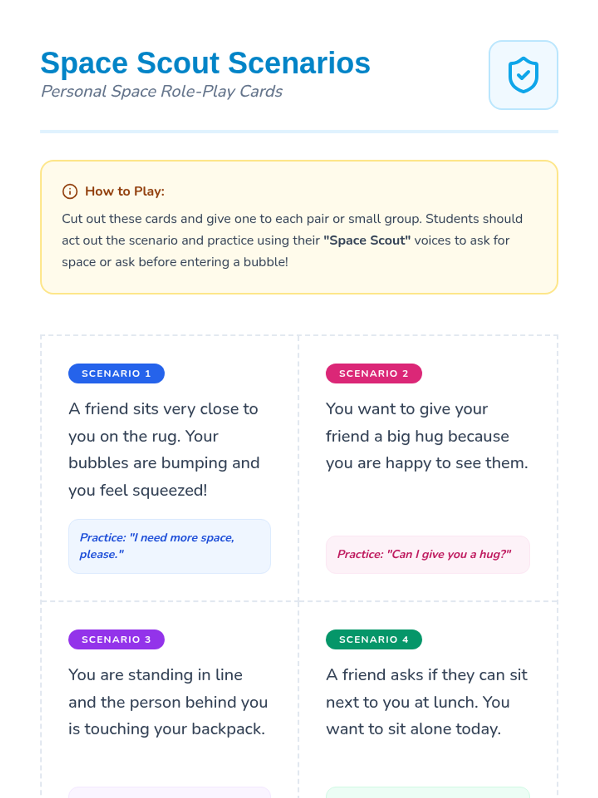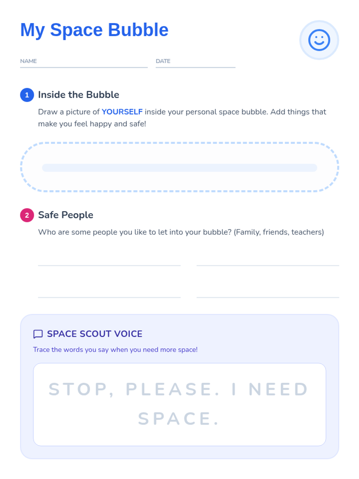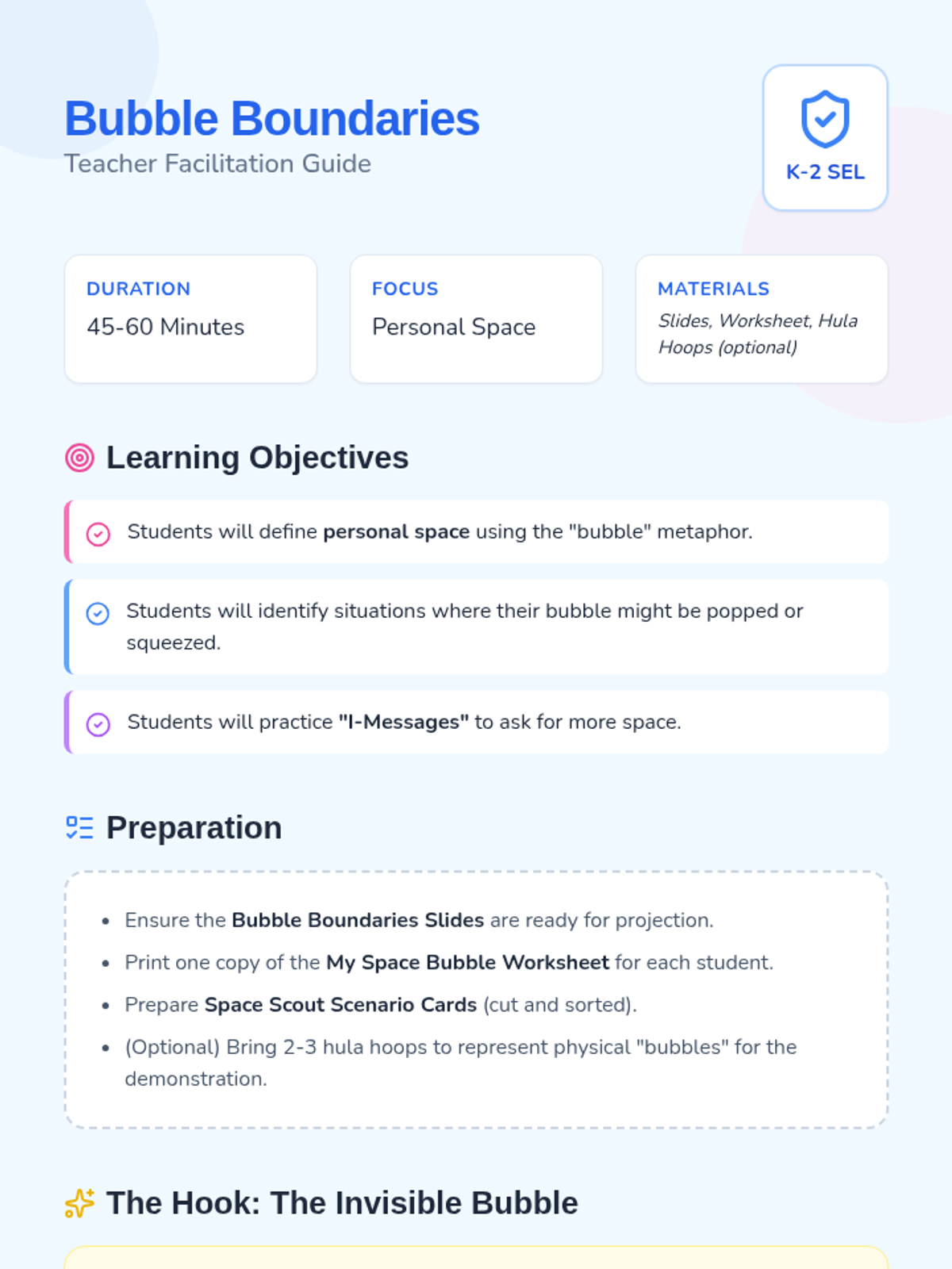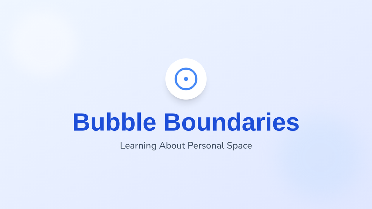A lesson for K-2 students to learn about personal space through the metaphor of a 'personal space bubble', teaching them how to communicate boundaries and respect others' space.