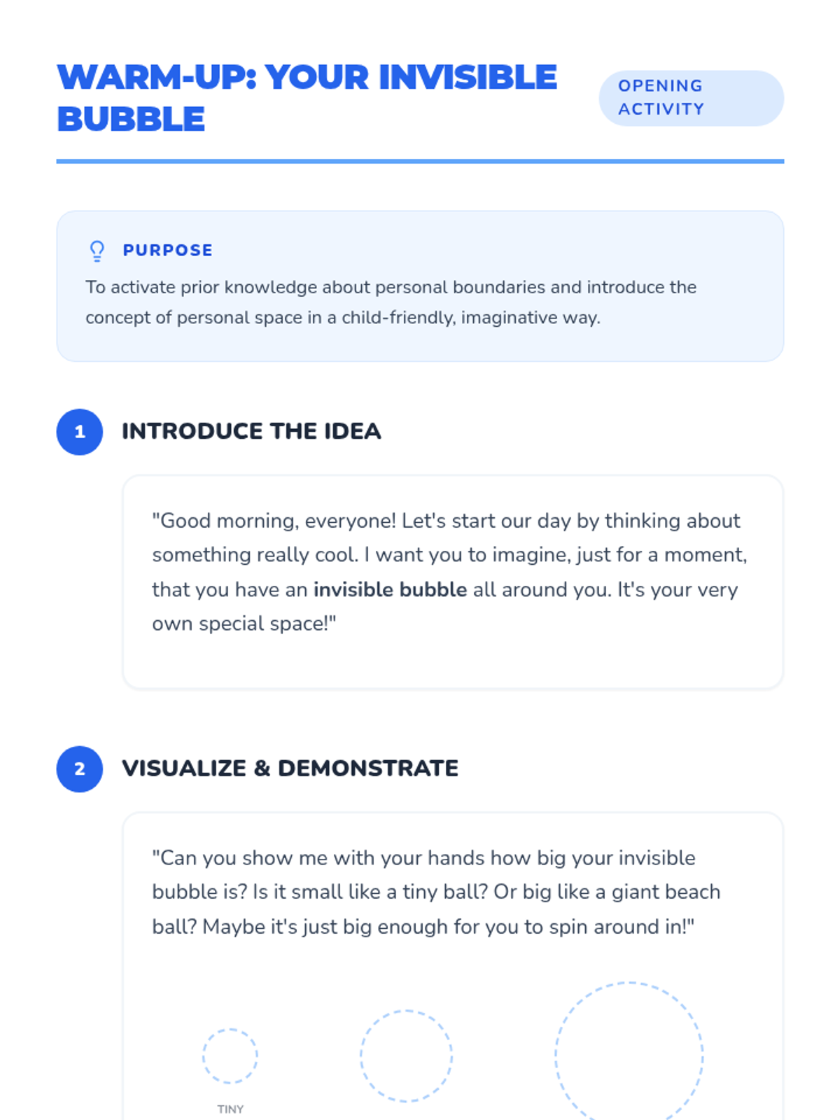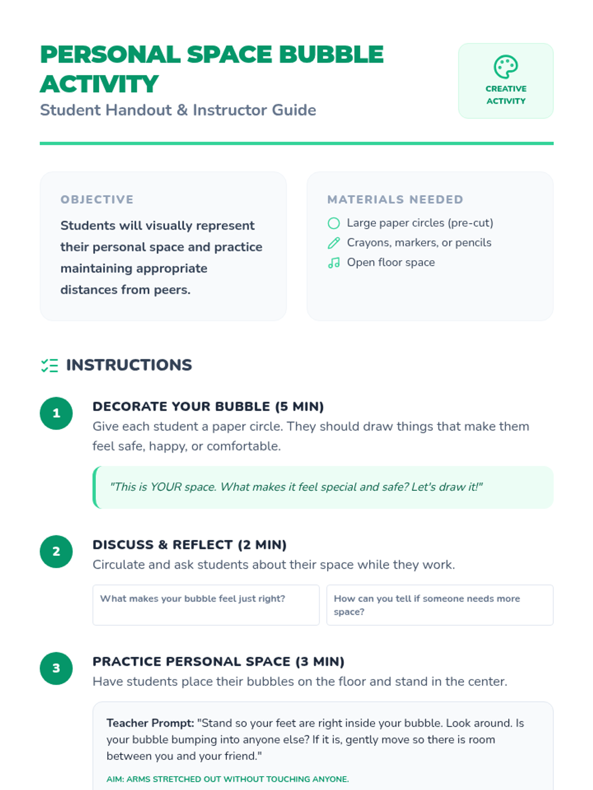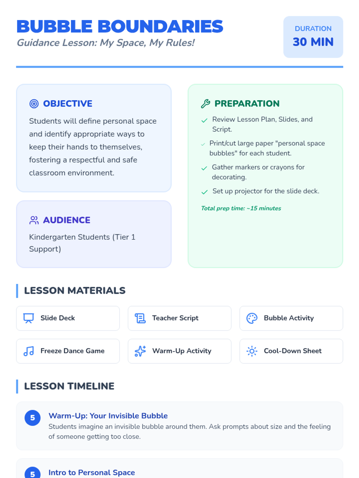 A 30-minute guidance lesson for Kindergarteners focusing on personal space and physical boundaries through the metaphor of an 'invisible bubble.' Students learn to respect others' space and keep hands to themselves using interactive games and creative activities.