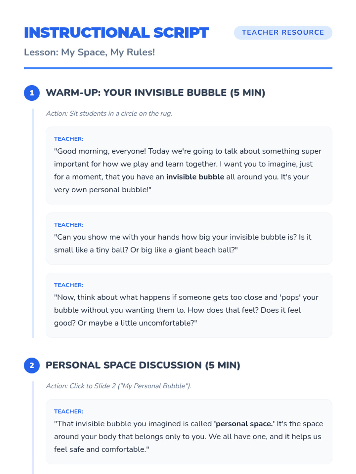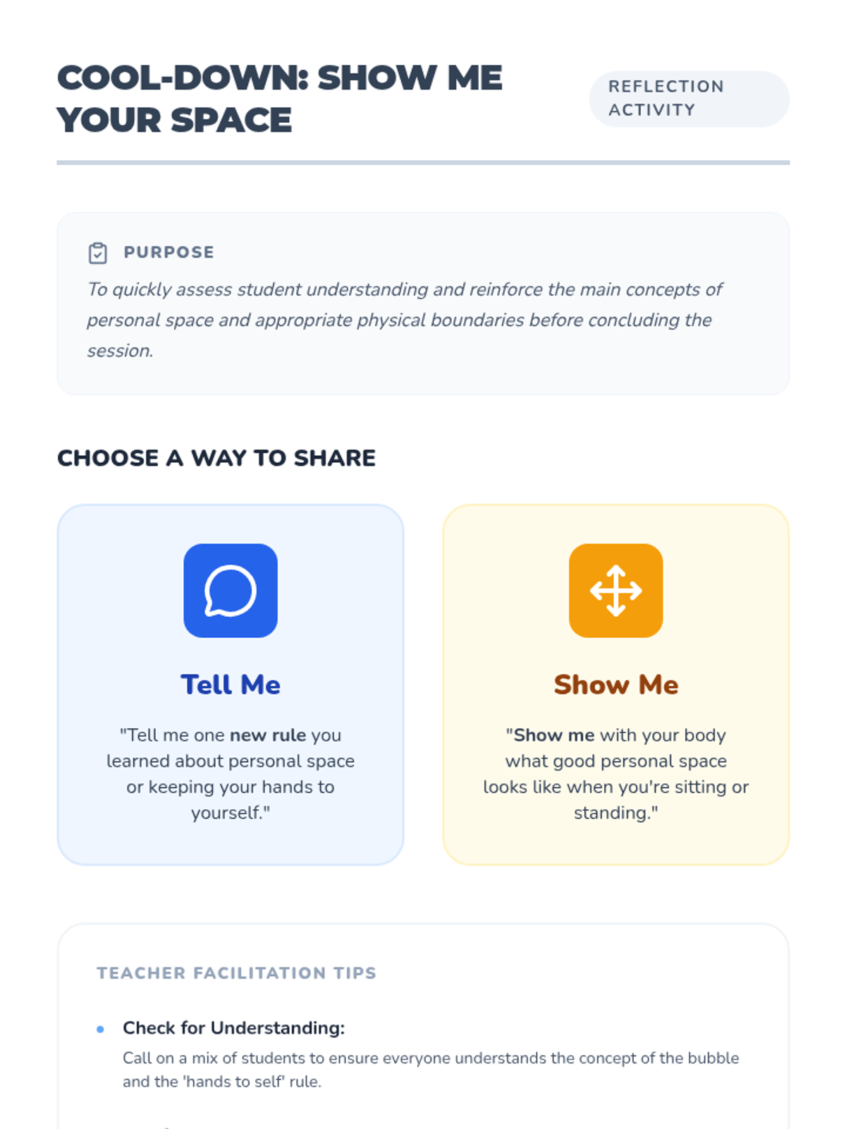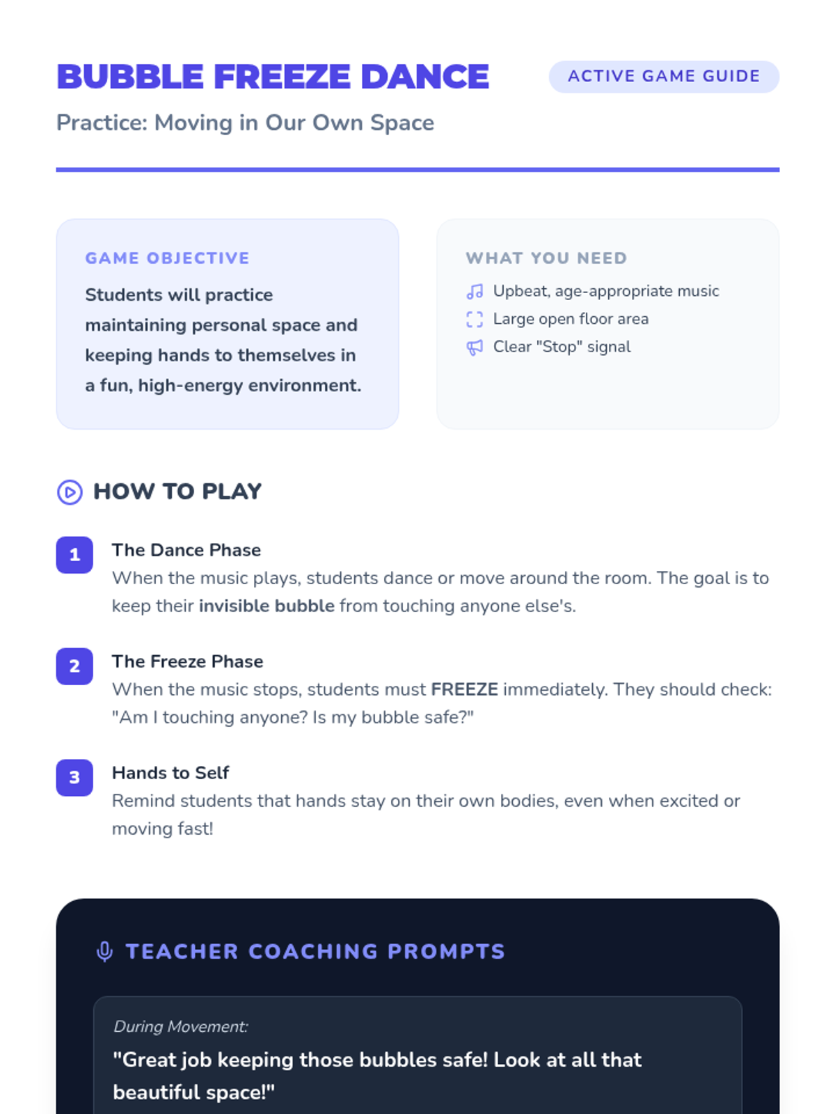 A 30-minute guidance lesson for Kindergarteners focusing on personal space and physical boundaries through the metaphor of an 'invisible bubble.' Students learn to respect others' space and keep hands to themselves using interactive games and creative activities.