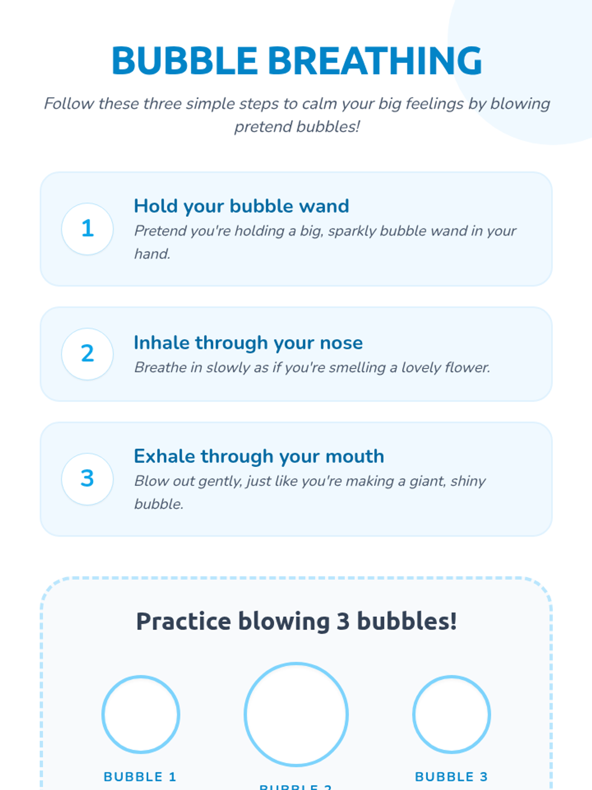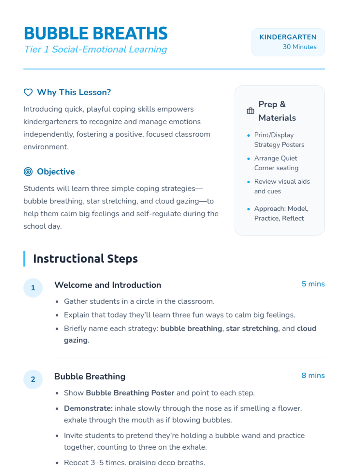 A 30-minute Tier 1 lesson for kindergarteners to learn coping skills like bubble breathing, star stretching, and cloud gazing to manage big feelings.