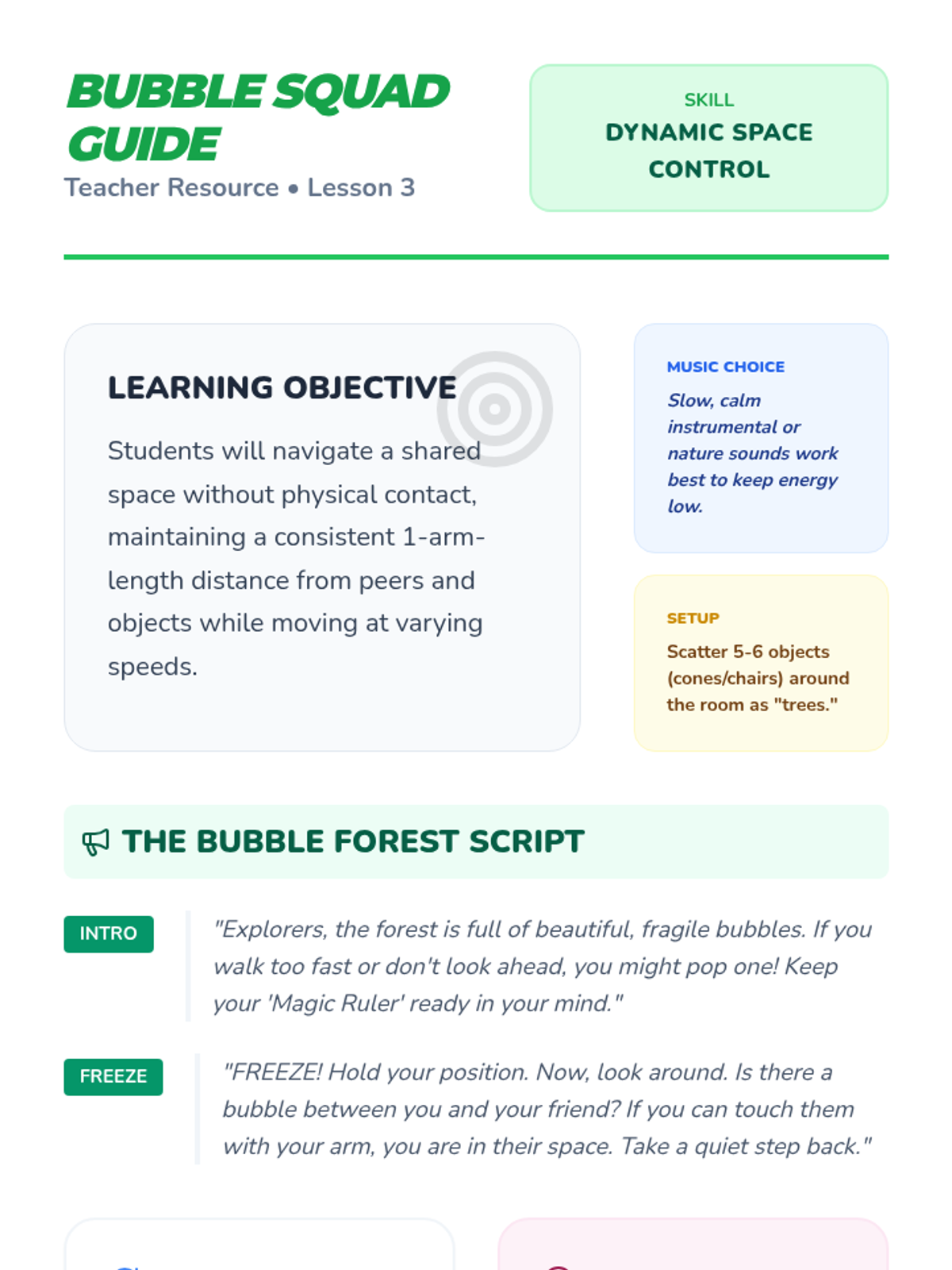 Students practice maintaining their personal space while in motion through a 'Bubble Forest' game, focusing on spatial awareness and impulse control.