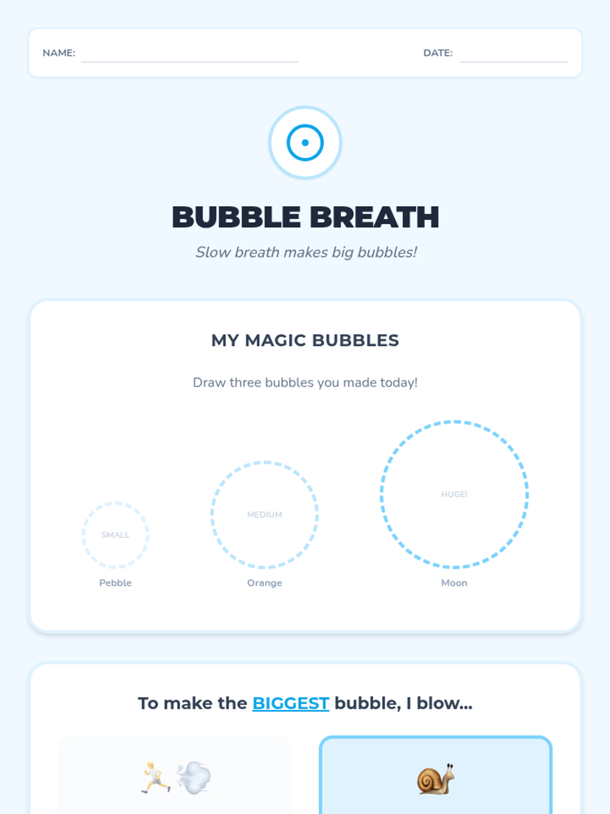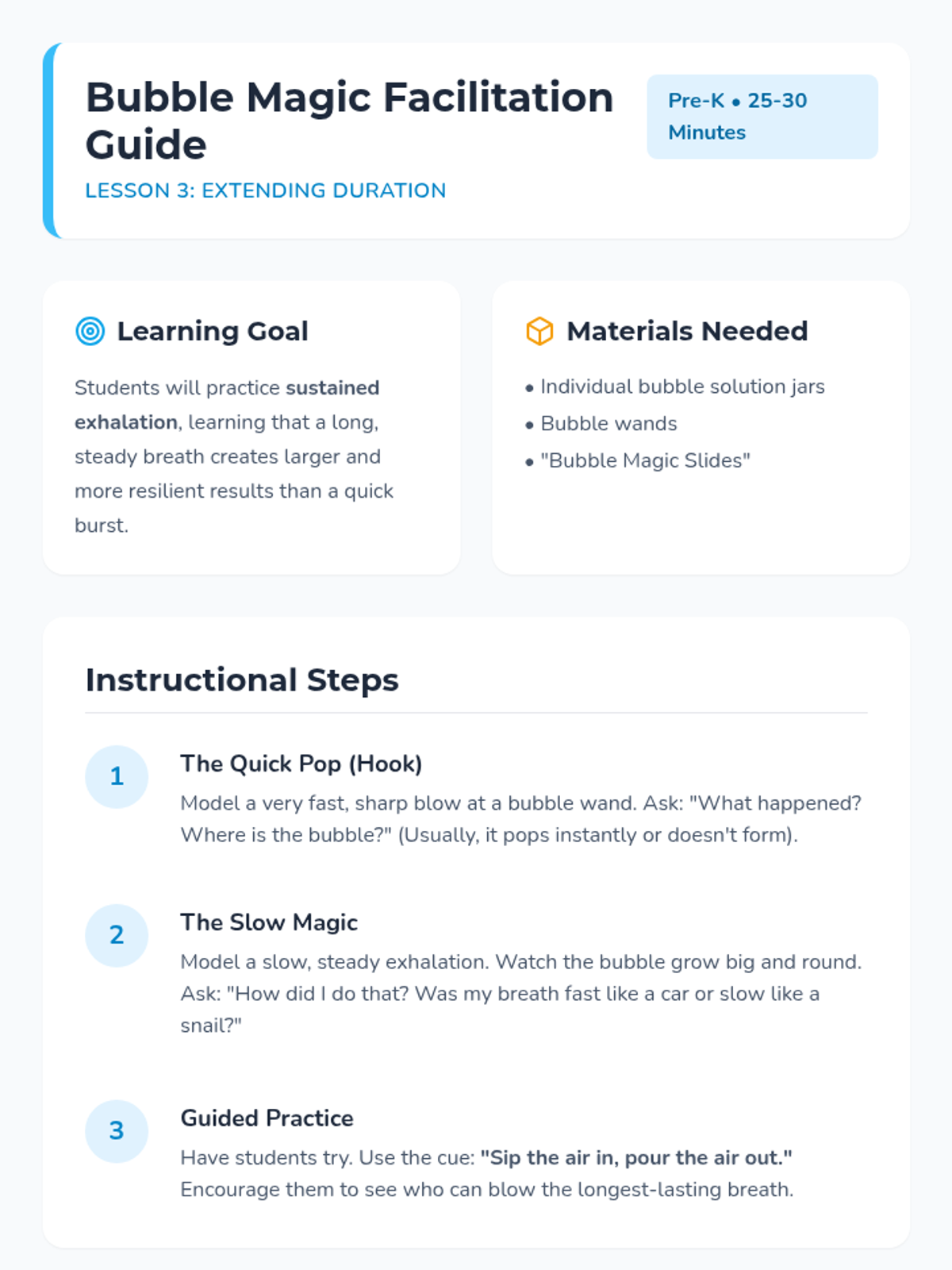 Students practice slow, sustained exhalation using bubbles, discovering that a steady stream of air creates the biggest, most magical results.