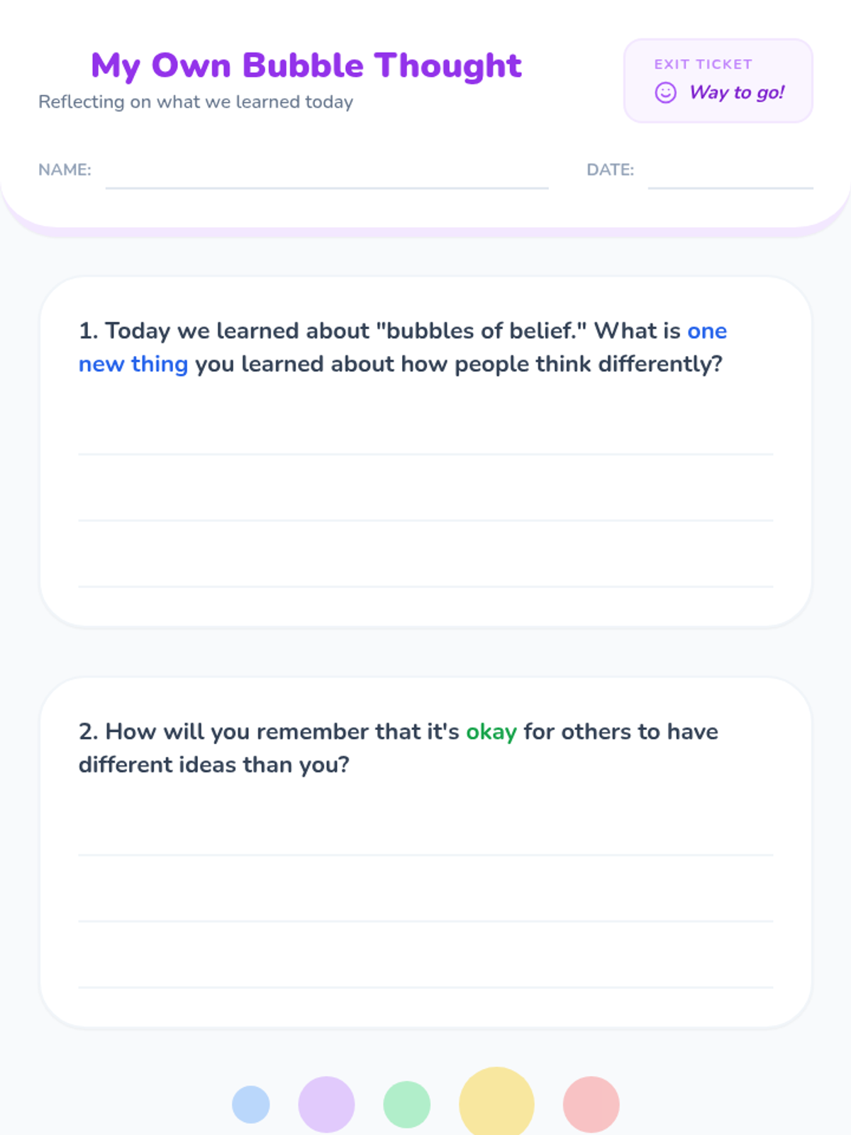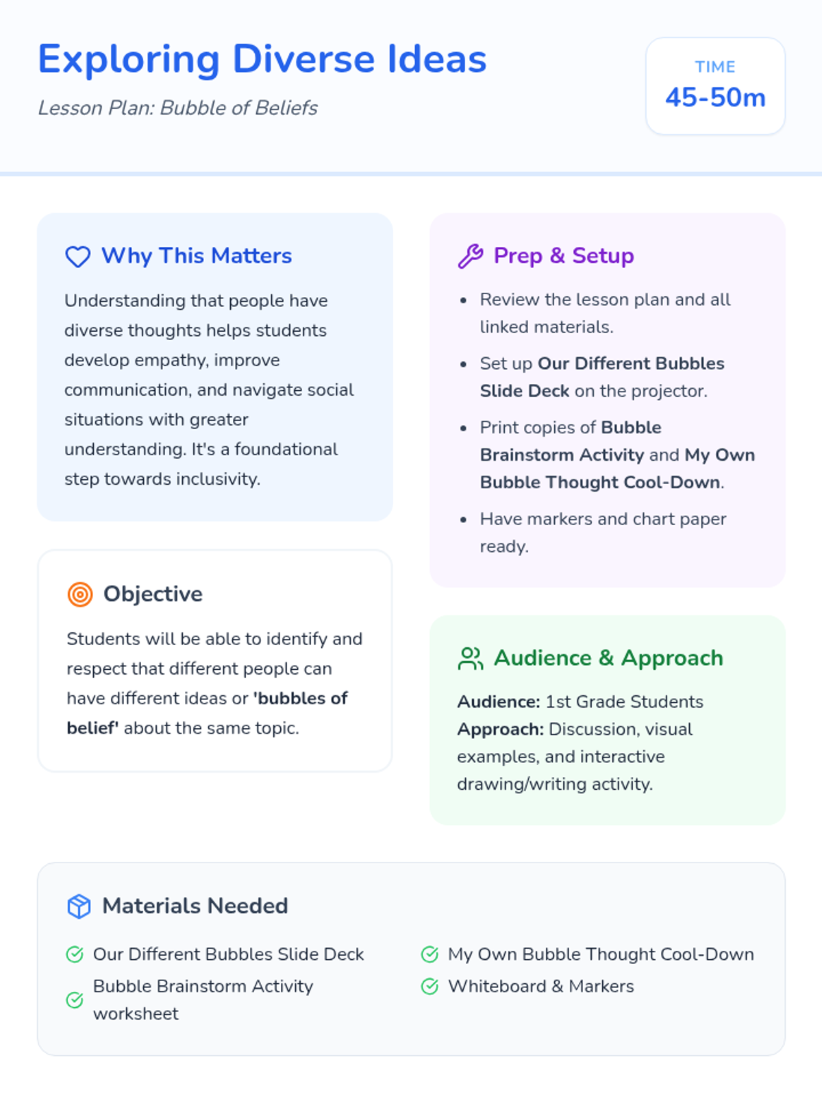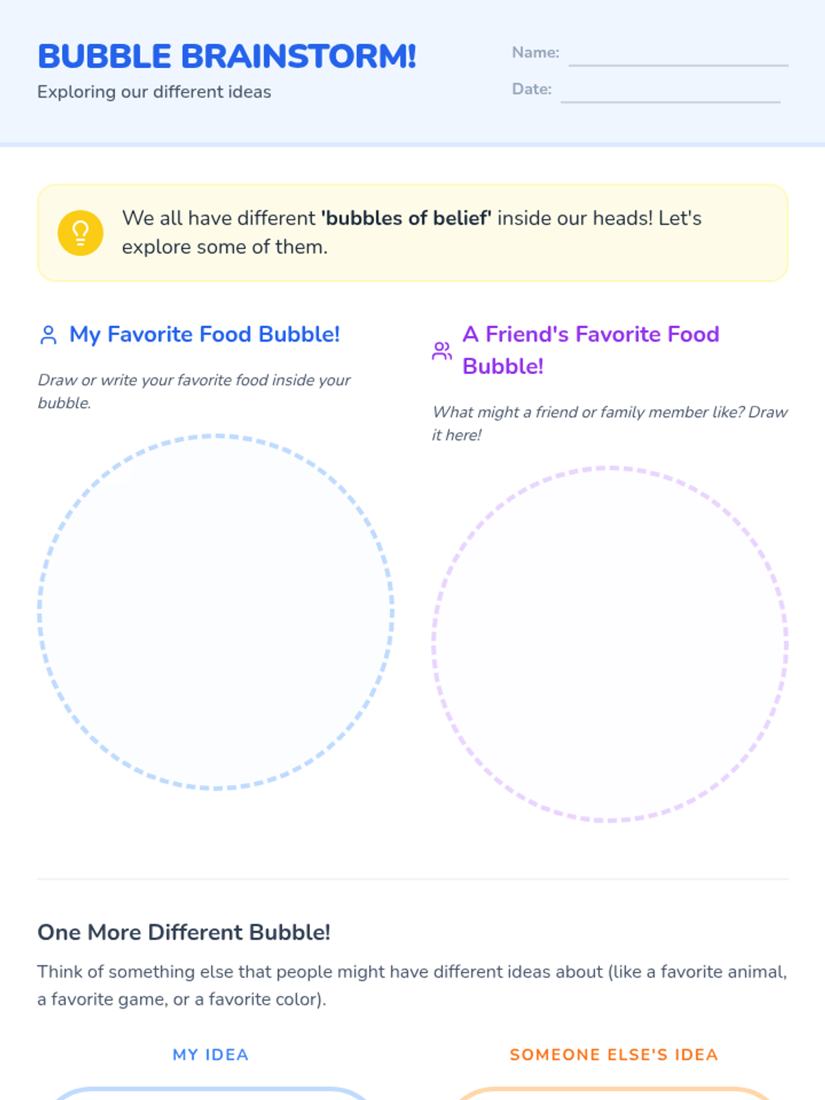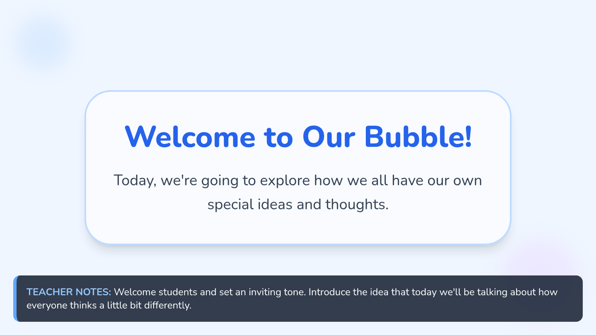 A foundational lesson for 1st graders exploring the concept that everyone has unique thoughts and perspectives, using the 'bubble of belief' metaphor to foster empathy and respect.