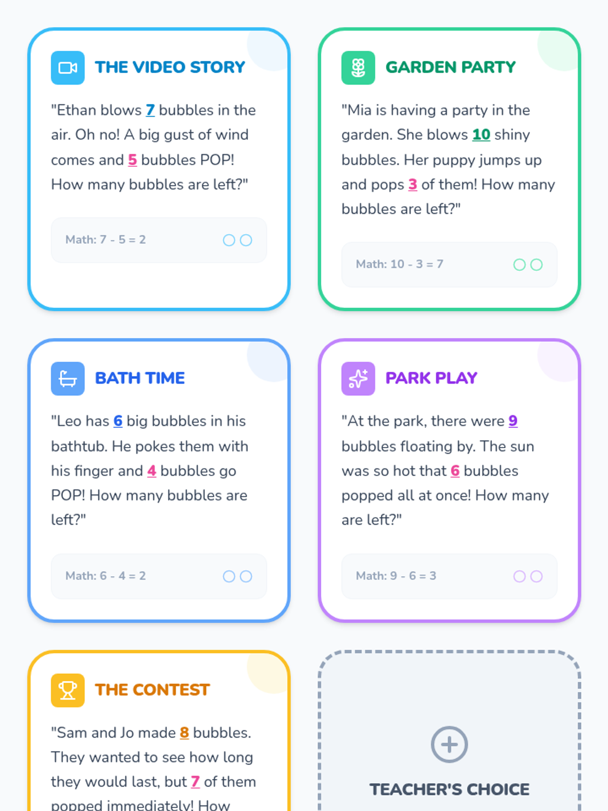 A hands-on Kindergarten lesson using bubbles and playdough to introduce subtraction as 'taking away.' students visualize subtraction by popping bubbles and smashing playdough balls to see how many are left.