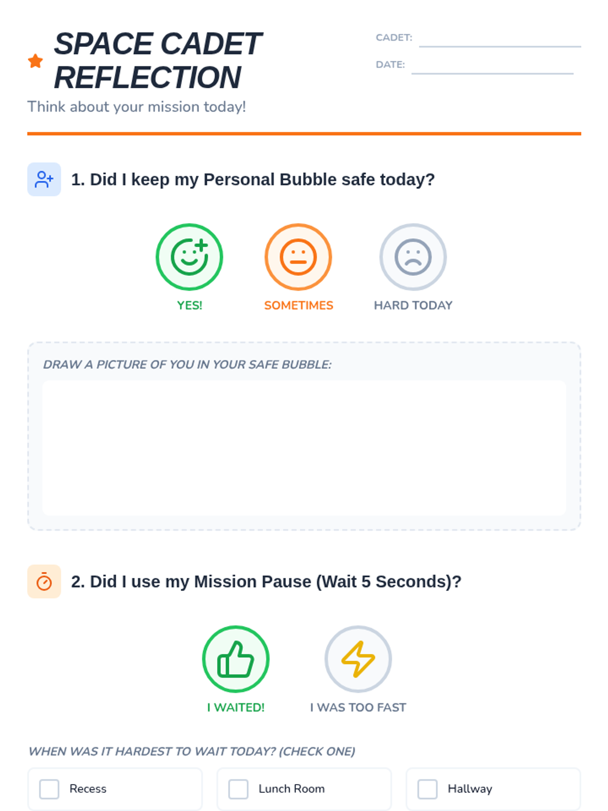 This lesson focuses on teaching 1st-grade students about personal space and impulse control using a 'Bubble Power' space exploration theme. It includes a social narrative, reflection tools, and data tracking for an IEP goal.