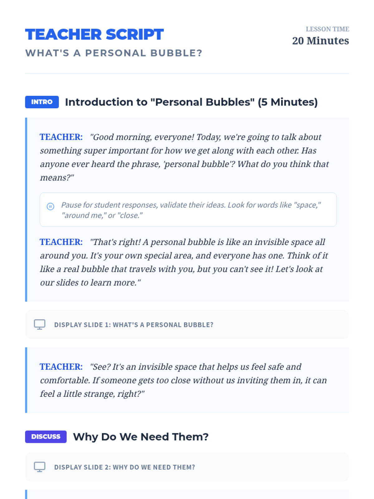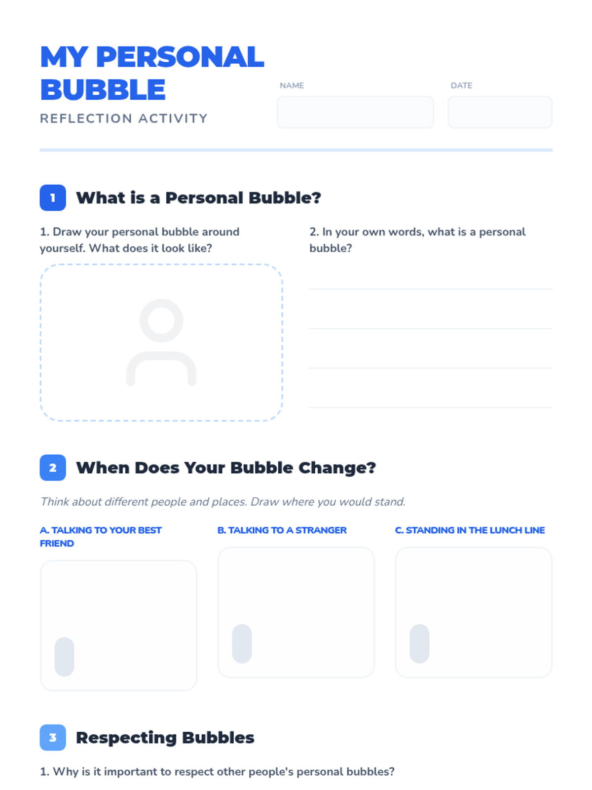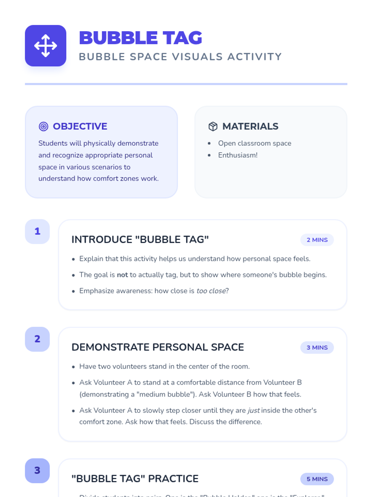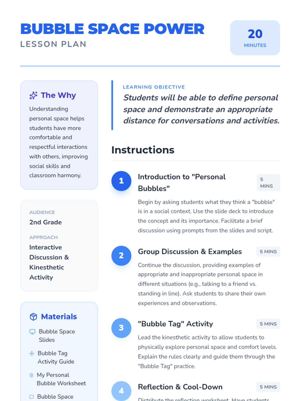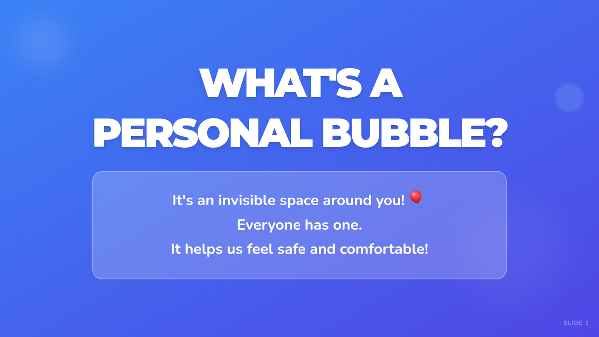 This lesson helps 2nd-grade students understand and respect personal space through the concept of a 'personal bubble,' using interactive slides, a kinesthetic activity, and reflective drawing.