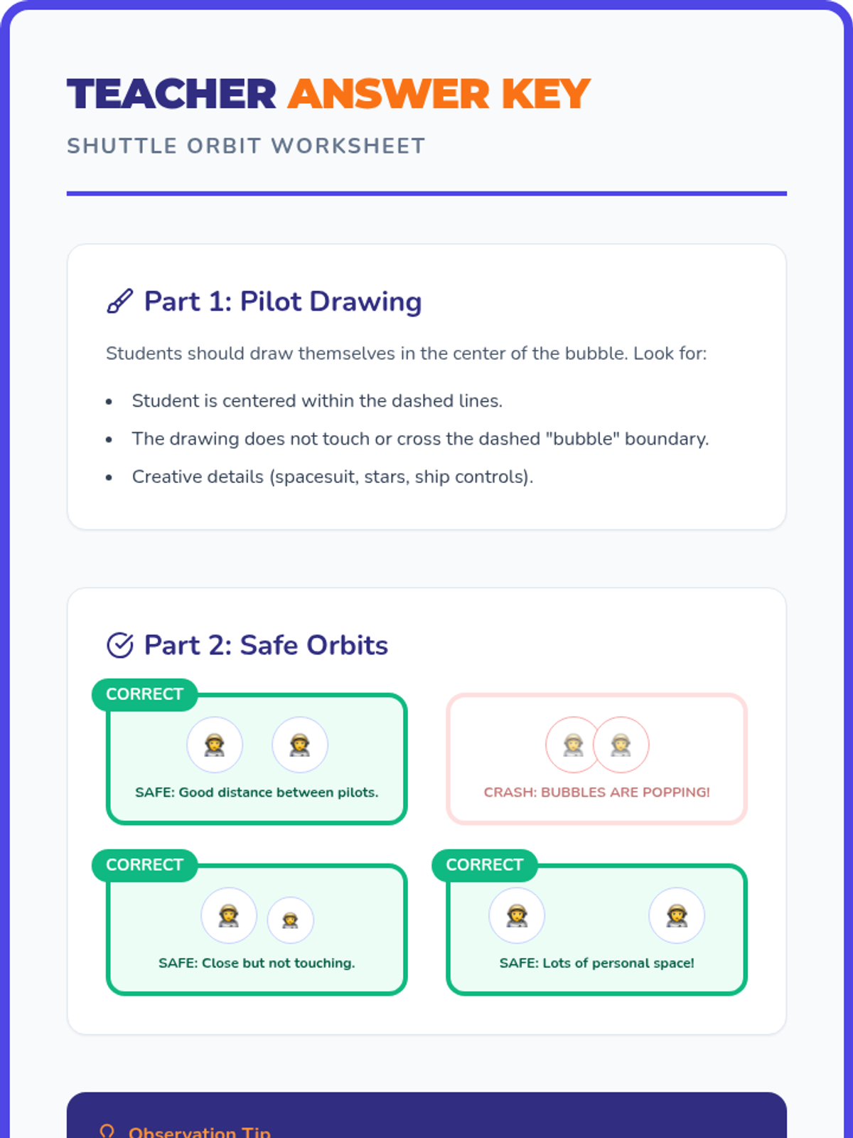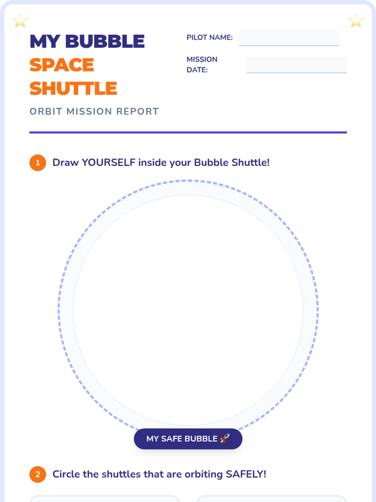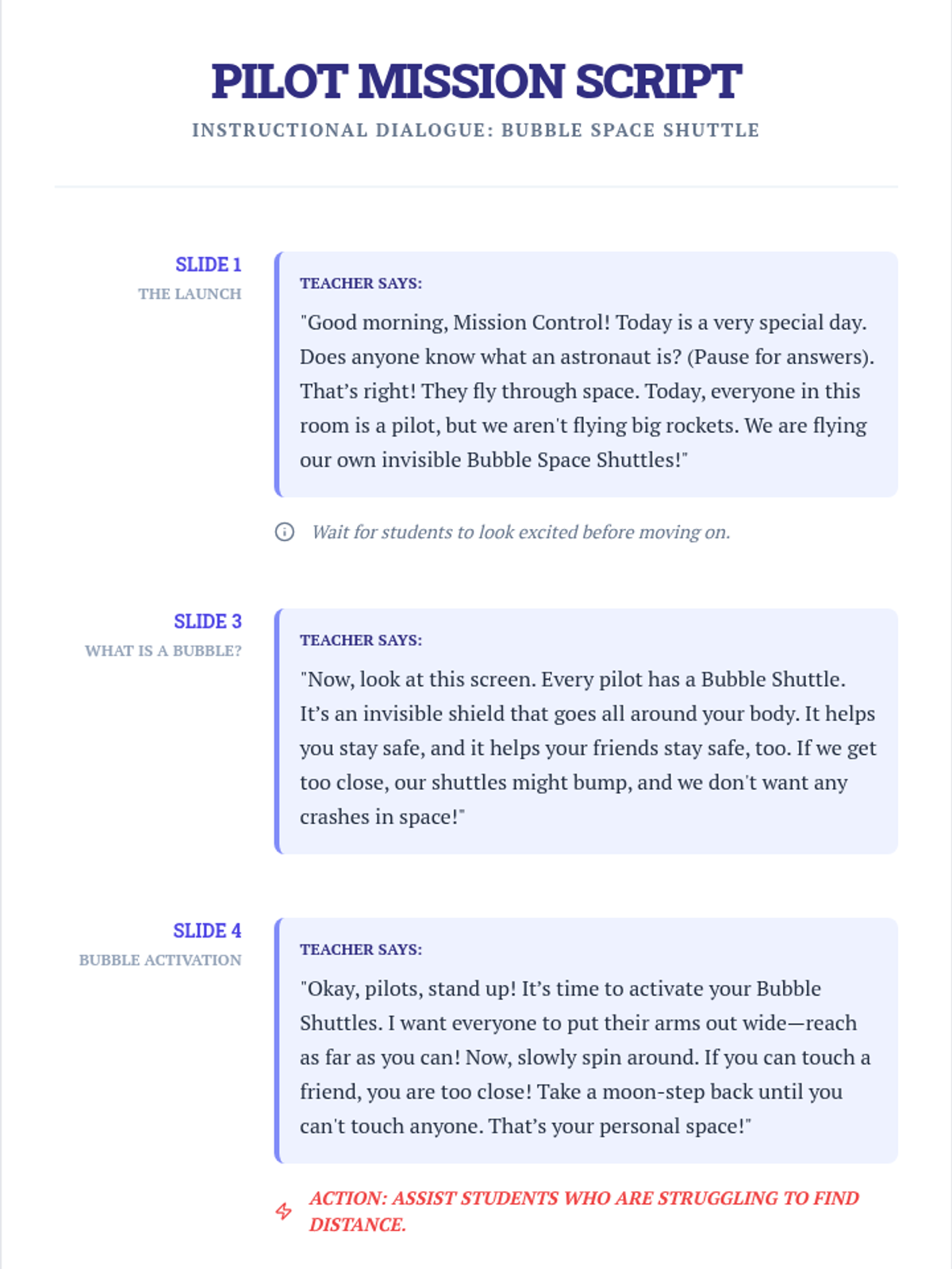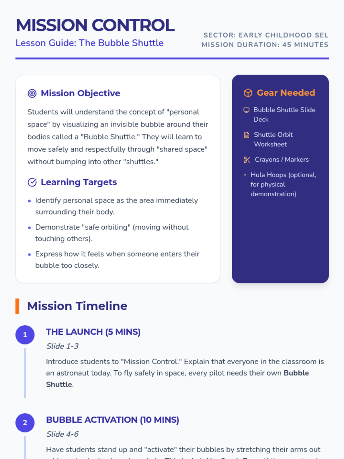 A fun, space-themed lesson for kindergarteners to learn about personal space. Students visualize themselves as pilots of their own 'bubble shuttles' to understand physical boundaries and respectful movement.